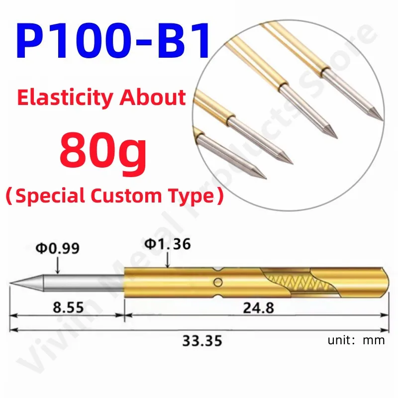 Experience precision with these high-quality spring test probes, each measuring approximately 33.35mm in length with a shank diameter of 1.36mm and needle tip diameter of 0.99mm. Designed for accurate electrical testing, these durable probes feature an elastic force of about 80g, ensuring reliable contact for repeated use. Available in packs of 20 or 100 pieces, each probe weighs approximately 0.232 grams for 100 units. The sleek, metallic finish highlights their modern, industrial design, making them ideal for detailed electronics testing and measurement tasks. Built for durability and precision, they are essential tools for professional electronics and testing enthusiasts.