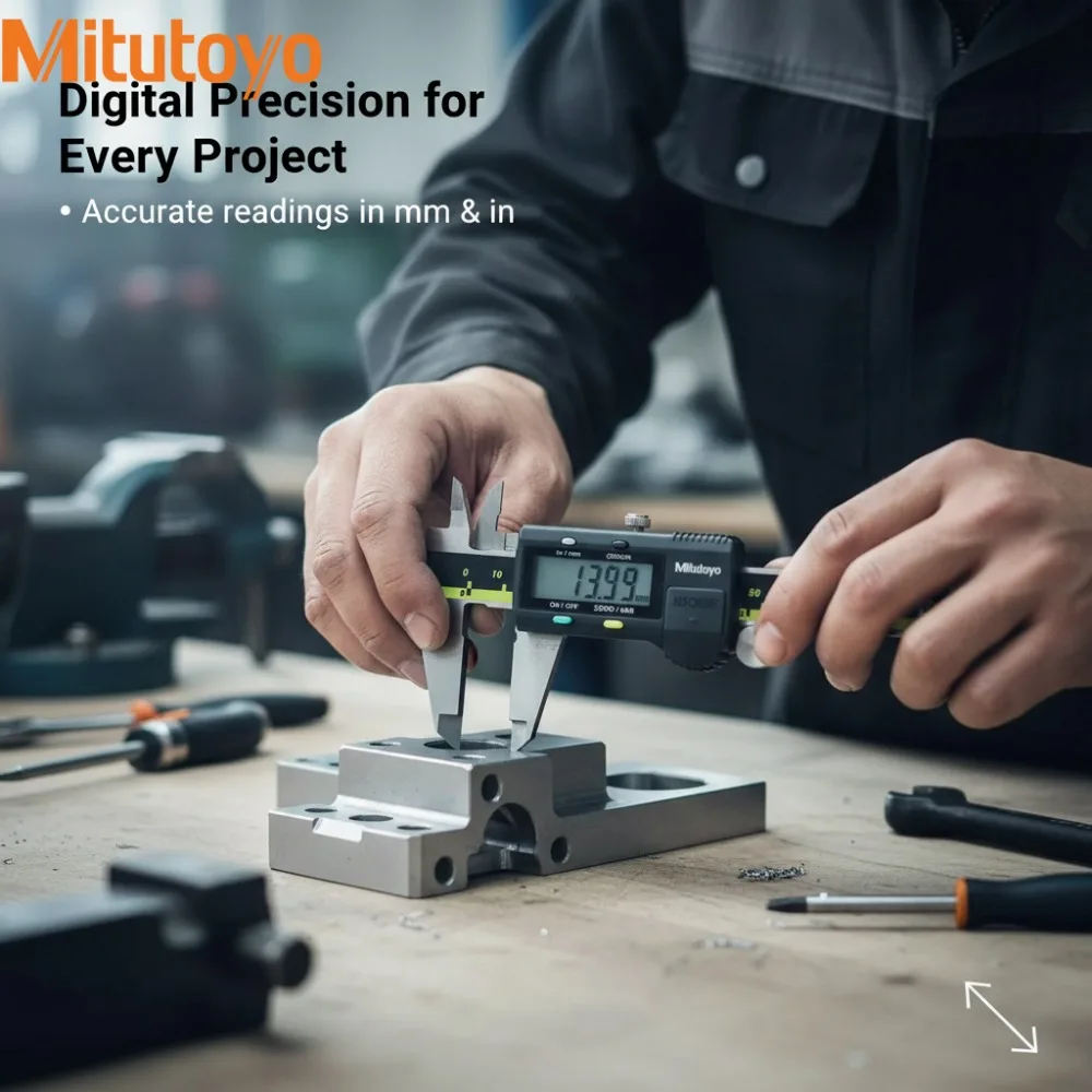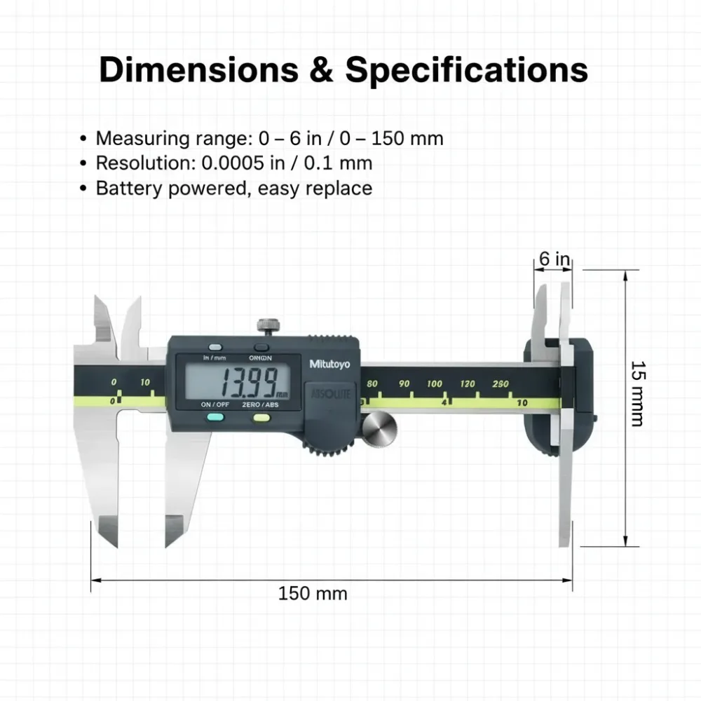 Experience precise measurement with this industrial-grade Mitutoyo stainless steel digital caliper, available in models measuring 150 mm, 200 mm, and 300 mm. Featuring a measurement range of 0 to 300 mm and an accuracy of 0.01 mm, it ensures reliable readings for professional applications. Powered by an included battery, the caliper includes a user-friendly digital LCD display housed in a durable black plastic casing, with clear measurement scales printed directly onto the slim, matte metallic stainless steel beams. Its finely machined jaws and sliding mechanisms exemplify high craftsmanship, making it an essential tool for those who demand precision and durability in their measurements.