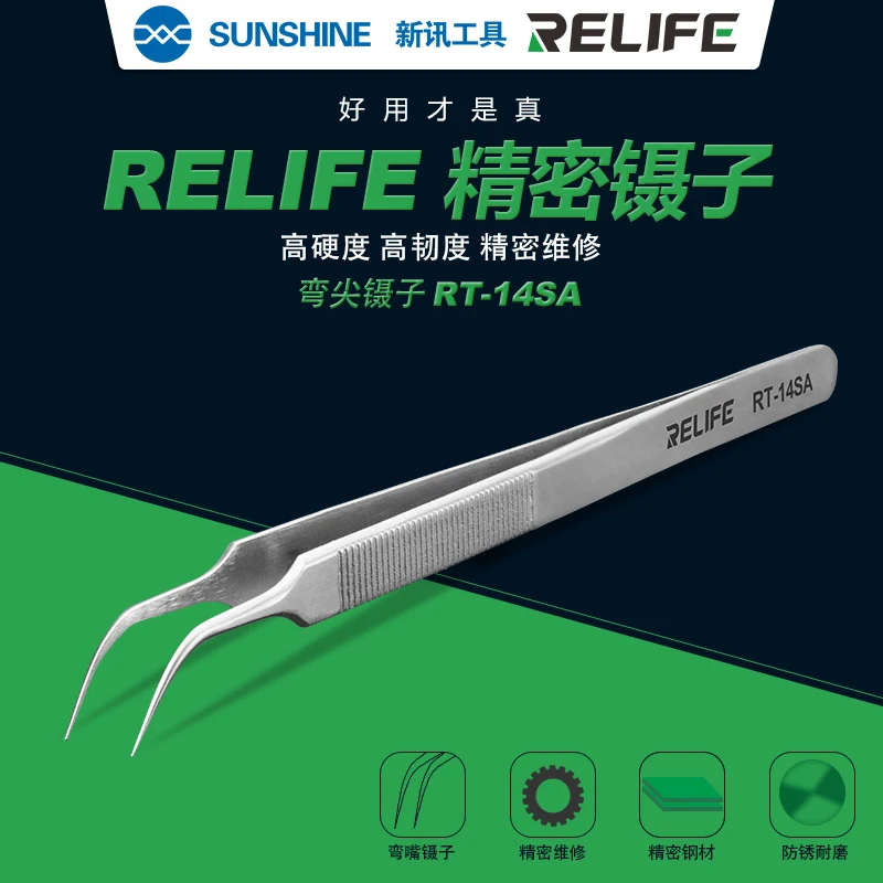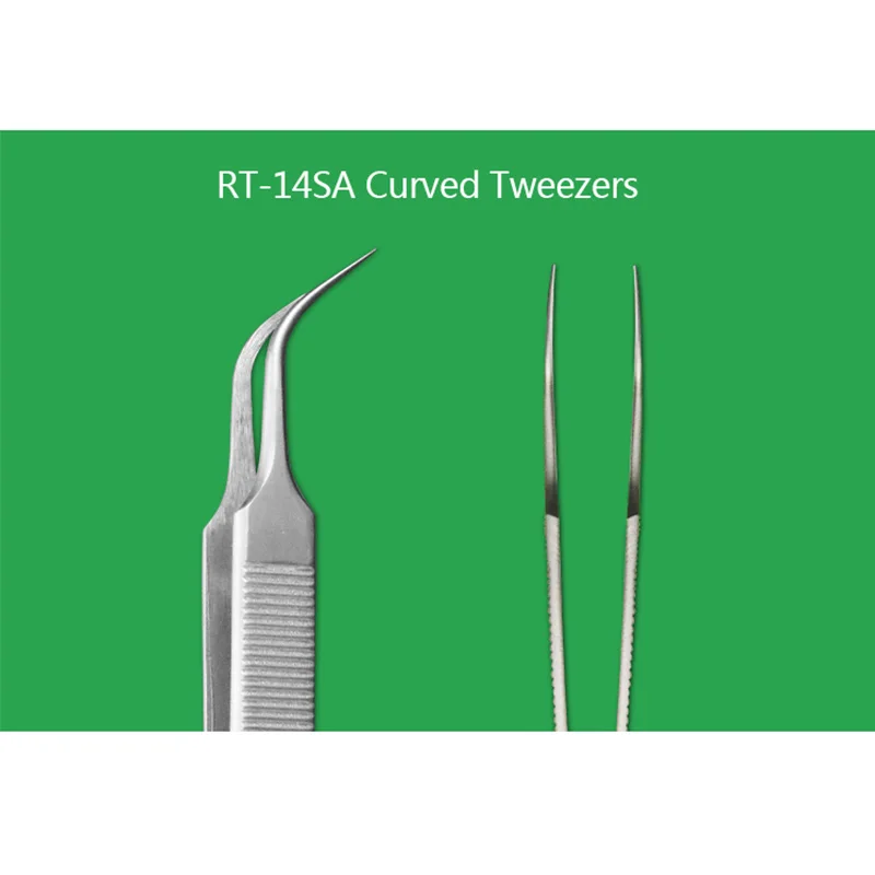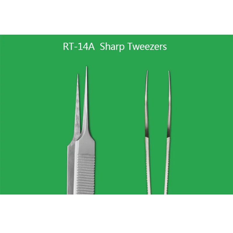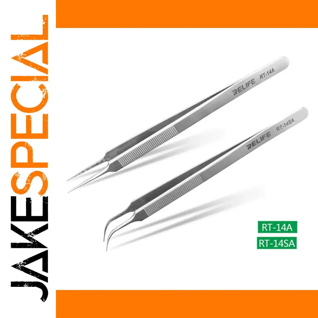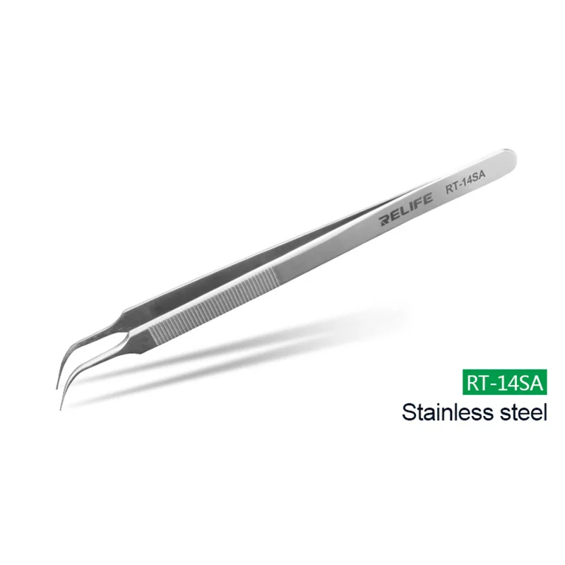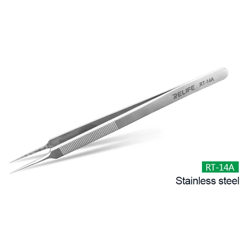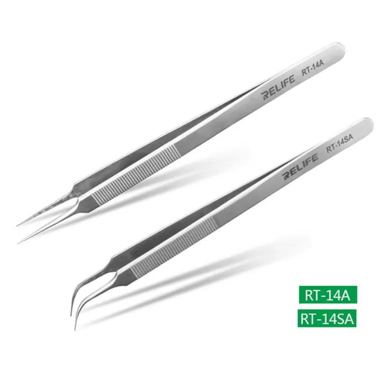 Experience unmatched precision with this set of two high-precision stainless steel tweezers, models RT-14A and RT-14SA, designed for delicate electronic repairs on iPhone and Samsung devices. The RT-14A features pointed, needle-like tips ideal for precise tasks, while the RT-14SA offers slightly curved, fine tips for delicate handling. Both tweezers boast durable stainless steel construction with a sleek, matte finish and textured, ribbed grip sections near the tips, ensuring a secure hold. Perfect for professionals and enthusiasts, this 2-piece set combines sharpness, durability, and ergonomic design to help you achieve flawless repair results effortlessly.