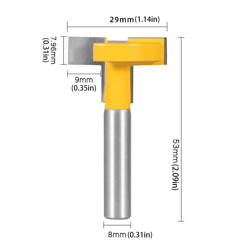Experience professional craftsmanship with this robust T-slot router bit designed for precise woodworking projects. Featuring an 8mm diameter shank and a 29mm cutting edge, it delivers smooth, accurate cuts for face milling and end milling tasks. Its high-quality carbide construction ensures durability and sharpness, making every cut efficient and clean. The sleek, industrial design combines shiny metallic silver with vibrant yellow accents, highlighting its precision-engineered build. Perfect for creating T-slots, joinery, or detailed woodwork, this tool seamlessly integrates into your woodworking setup. Visualize yourself achieving perfect joints and clean cuts, improving both your work quality and efficiency. This router bit is a reliable addition to any professional or enthusiast’s toolbox, designed for consistent performance.