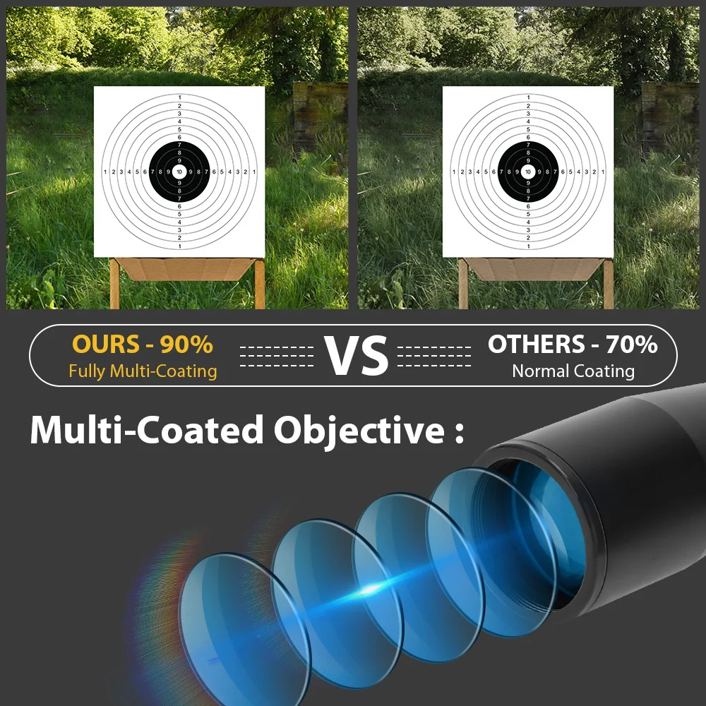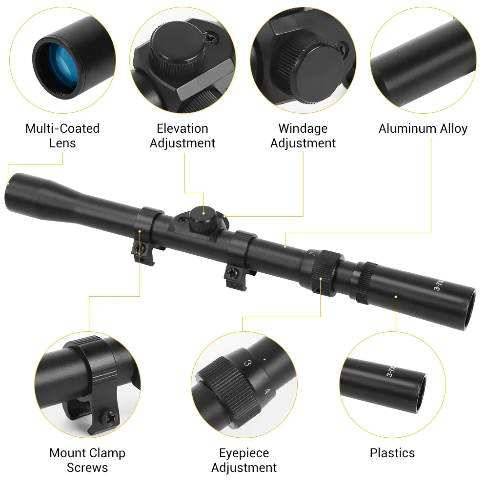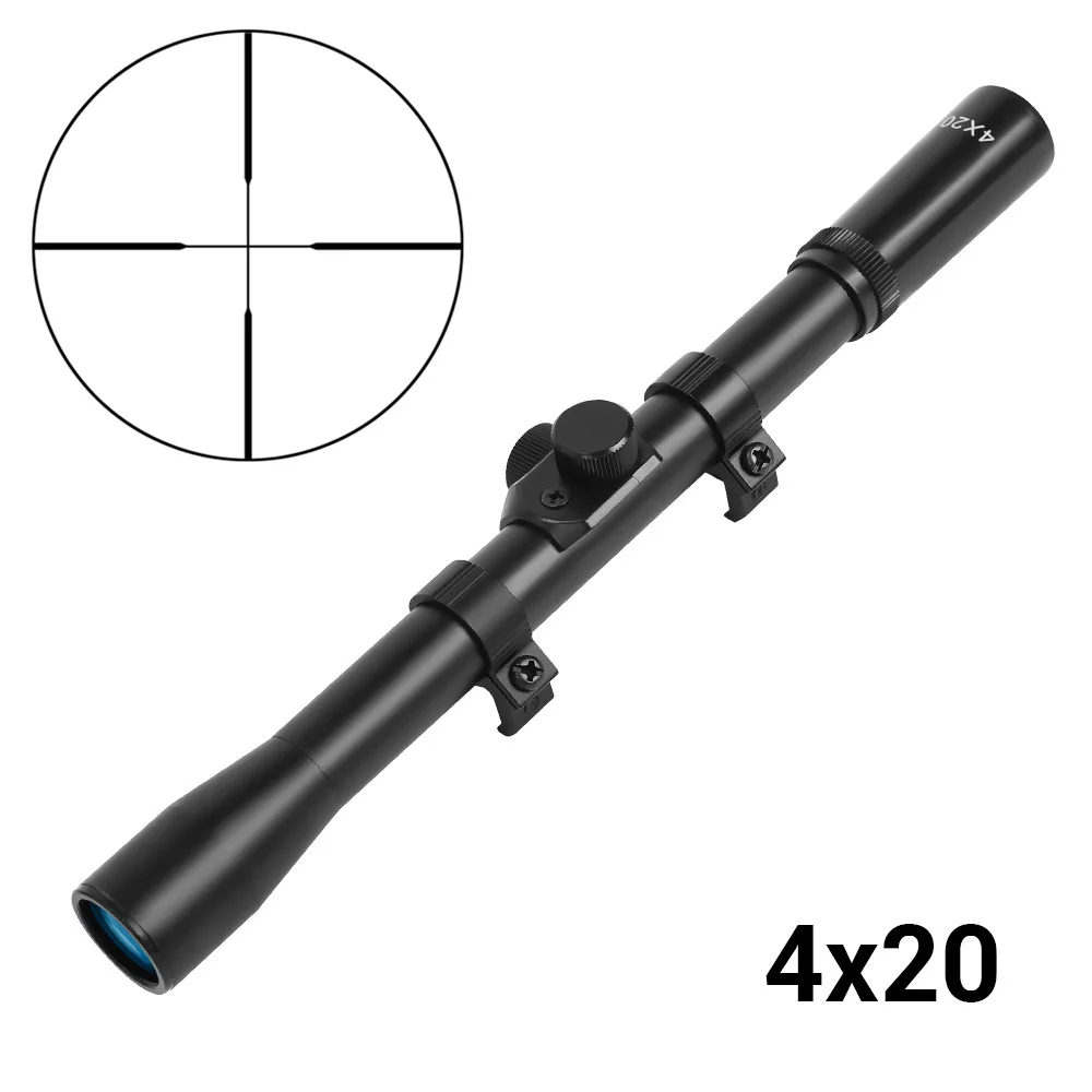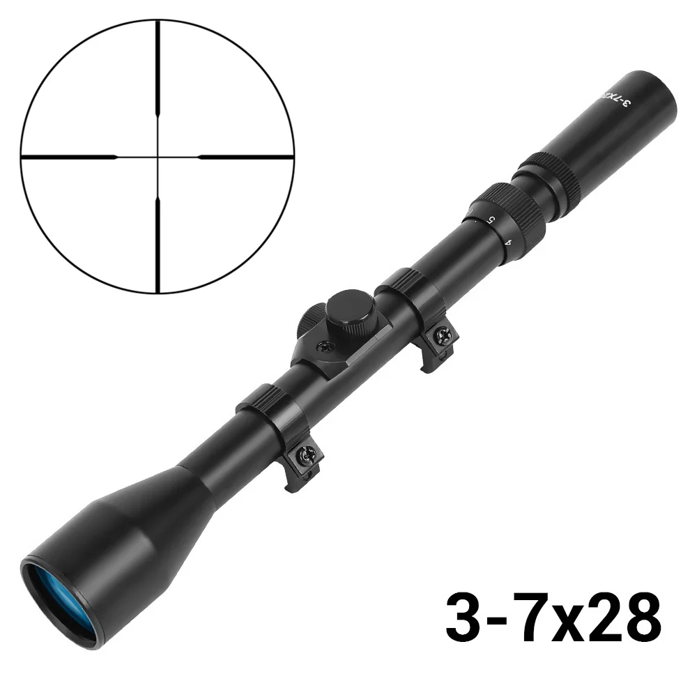 Experience precision with this lightweight tactical rifle scope available in four models: 4×20, 4×28, 3-7×20, and 3-7×28, all crafted from durable nylon and aluminum alloy with a sleek, one-piece tube construction. Measuring 267mm in length with a 19mm tube diameter, it features fully multi-coated lenses for optimal light transmission and clarity, waterproof and anti-fog properties, and earthquake resistance. The scope offers a 13.41-40.38 meter field of view at 100 yards and a crosshair reticle with differentiation filaments for quick target acquisition. Compatible with 11mm dovetail rails using included mounts, it includes two lens covers and a user manual for easy setup.