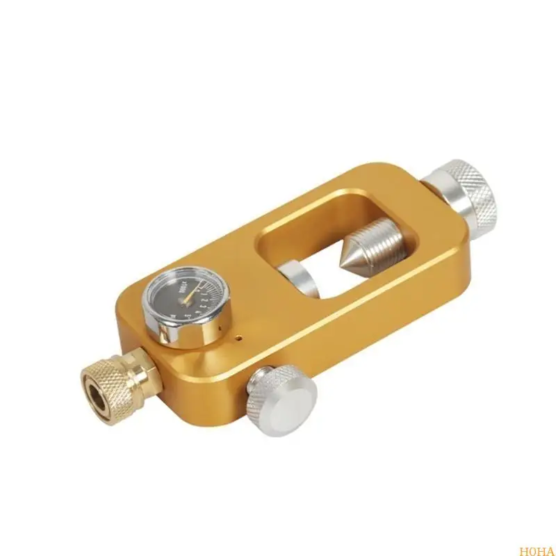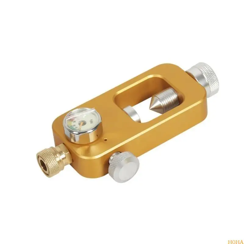- Features a gold-colored, knurled cylindrical connector designed for secure attachment to scuba tank valves, combined with a small pressure gauge for monitoring pressure levels.