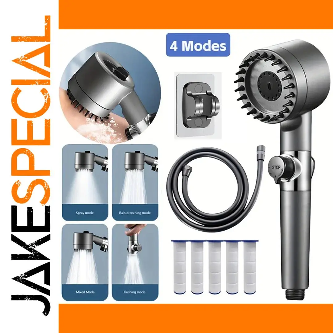 Imagine stepping into your bathroom and feeling the invigorating power of this high-pressure handheld shower head, designed to transform your daily shower into a spa-like experience. Crafted from sturdy ABS plastic with a sleek, metallic silver finish, the large round face features numerous nozzles arranged evenly to provide an even, powerful flow. Its modern minimalist style complements any bathroom decor. The adjustable 4-mode spray settings include massage and water-saving options, catering to your preferences. The convenient water stop button allows you to pause water flow effortlessly. Complete with a 1.5-meter grey flexible hose, a rack hook, and a built-in three-filter system, this shower head combines functionality, style, and durability for a refreshing and hygienic shower every time.