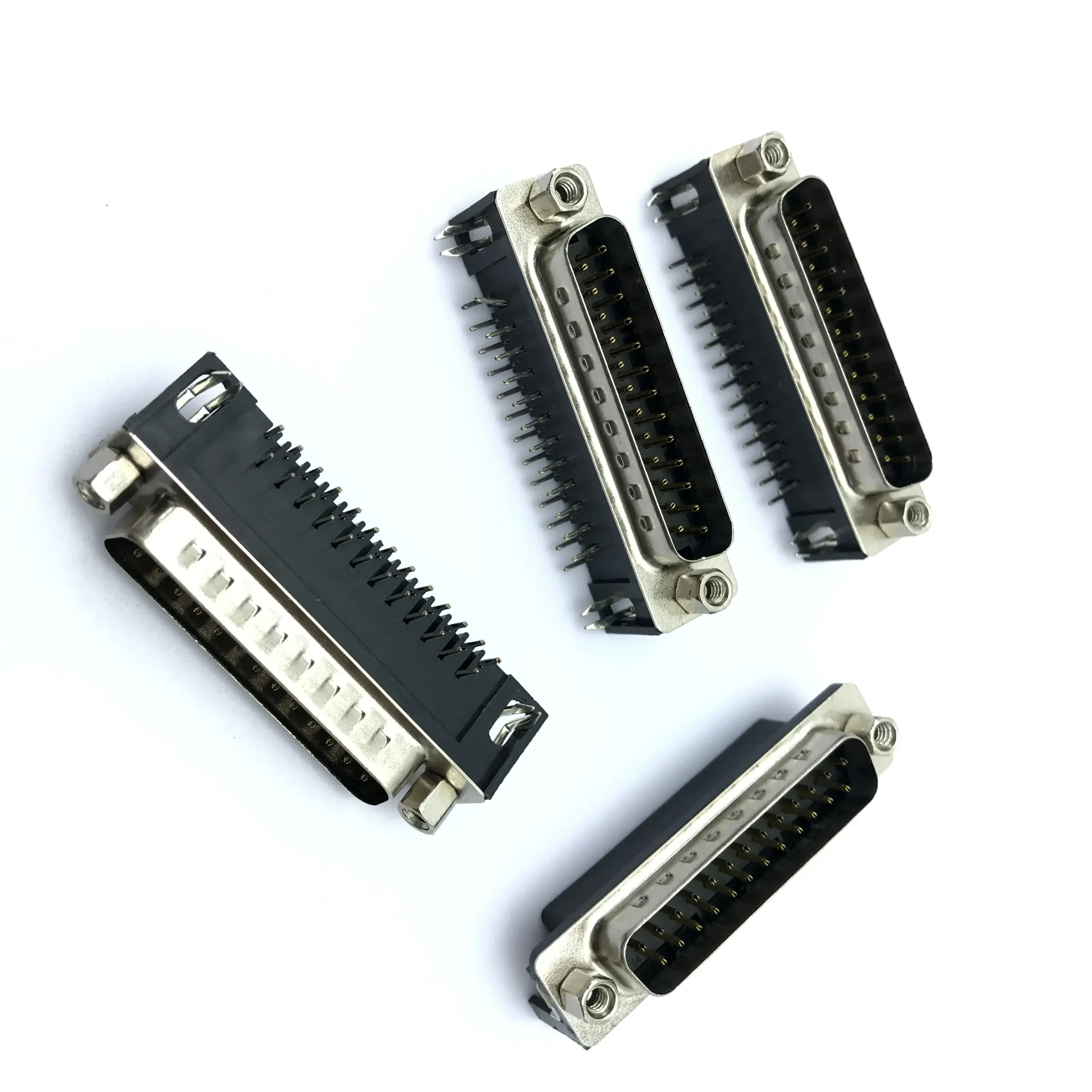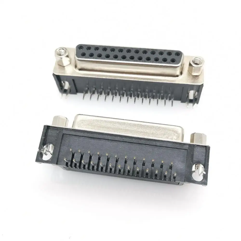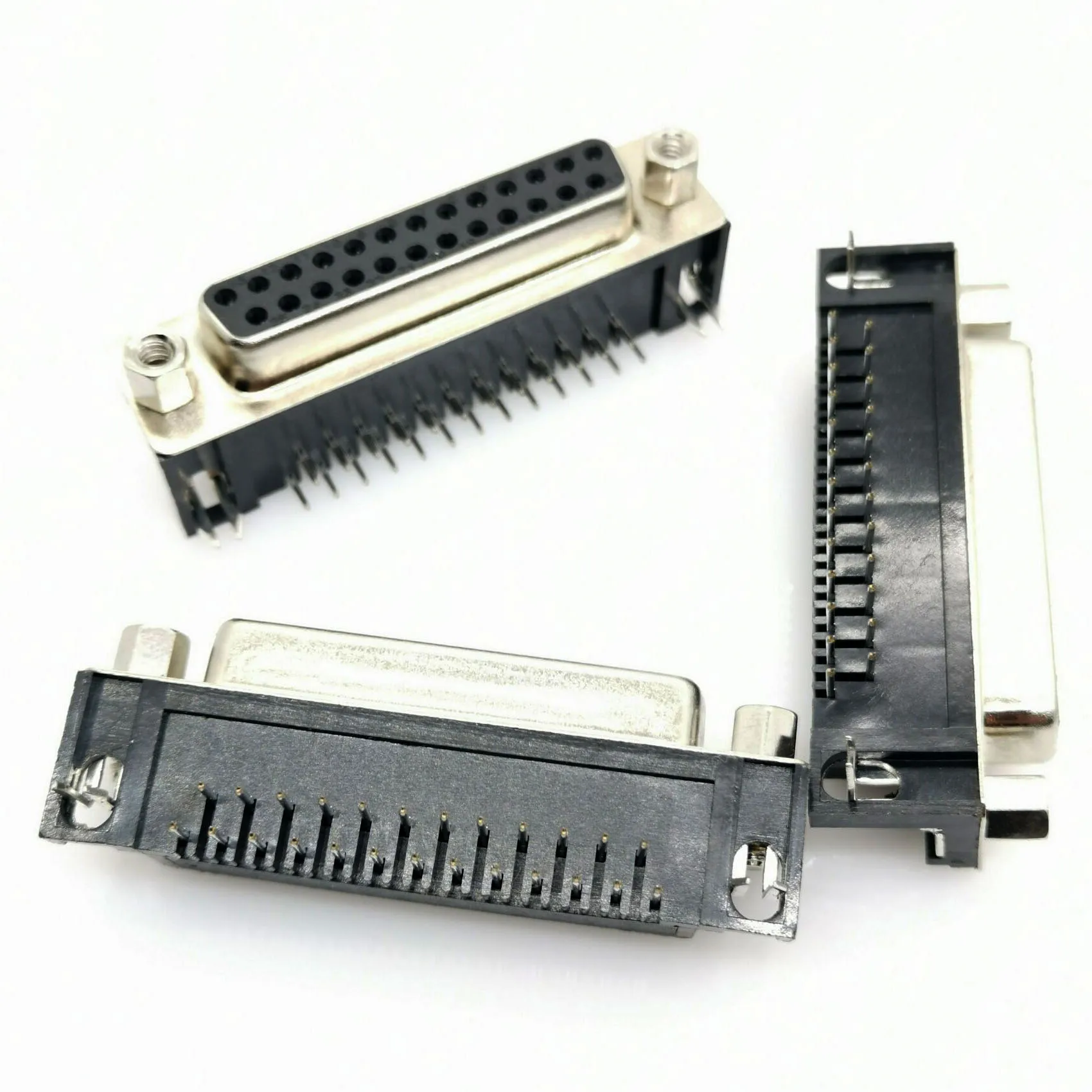 Experience secure and reliable connections with this set of 10 DB25 female and DR25 male D-sub right-angle PCB mount double-row pins electrical connectors. Crafted with a sturdy metallic rectangular shell finished in polished or matte texture, these connectors feature black plastic insulators holding gold-plated pins arranged in two parallel rows. The right-angle design allows for space-efficient circuit board mounting, while the integrated hexagonal screw nuts ensure a firm lock. Ideal for high-density electronic applications, these corrosion-free connectors are perfect for professionals seeking durable, precise, and professional-grade components for electrical system integration.