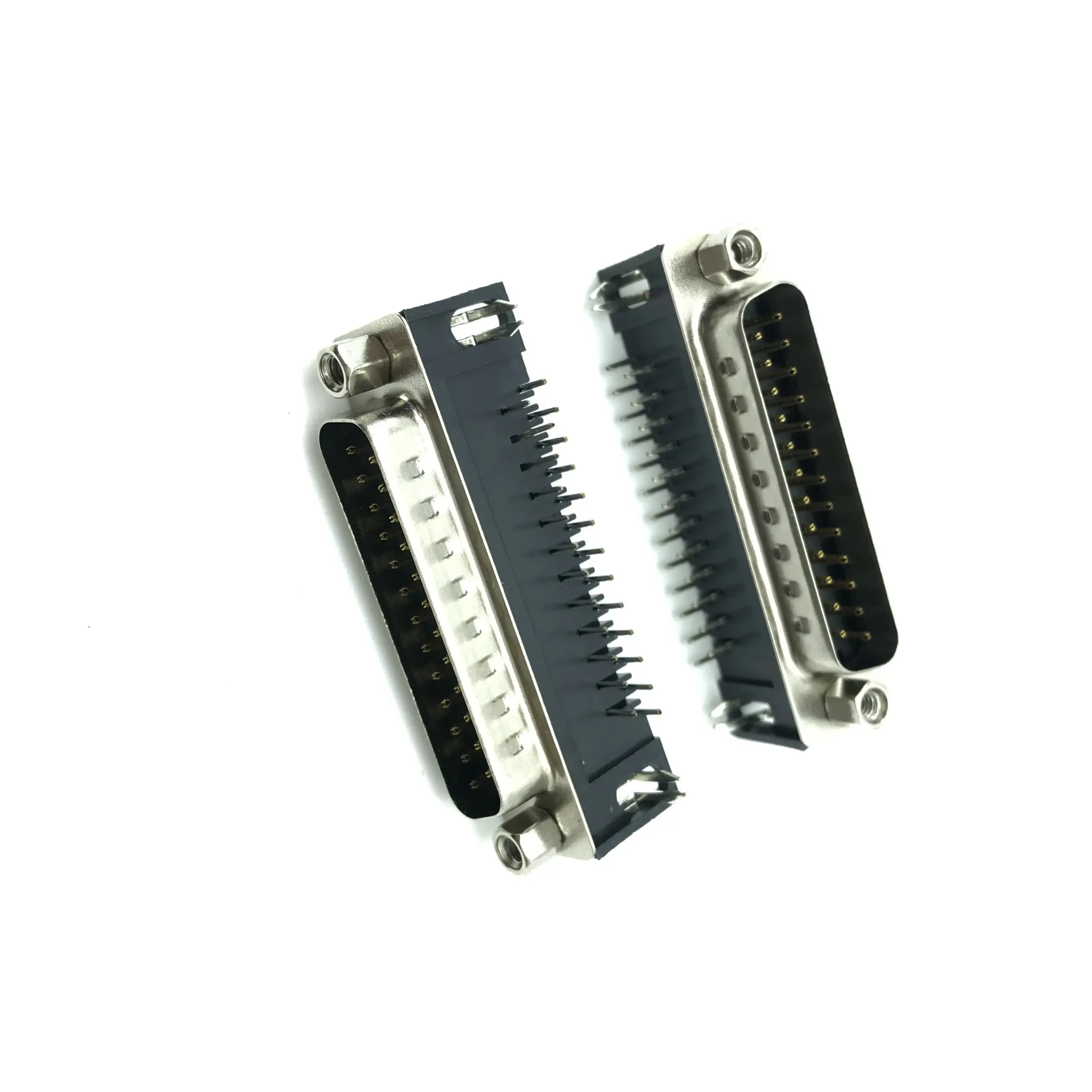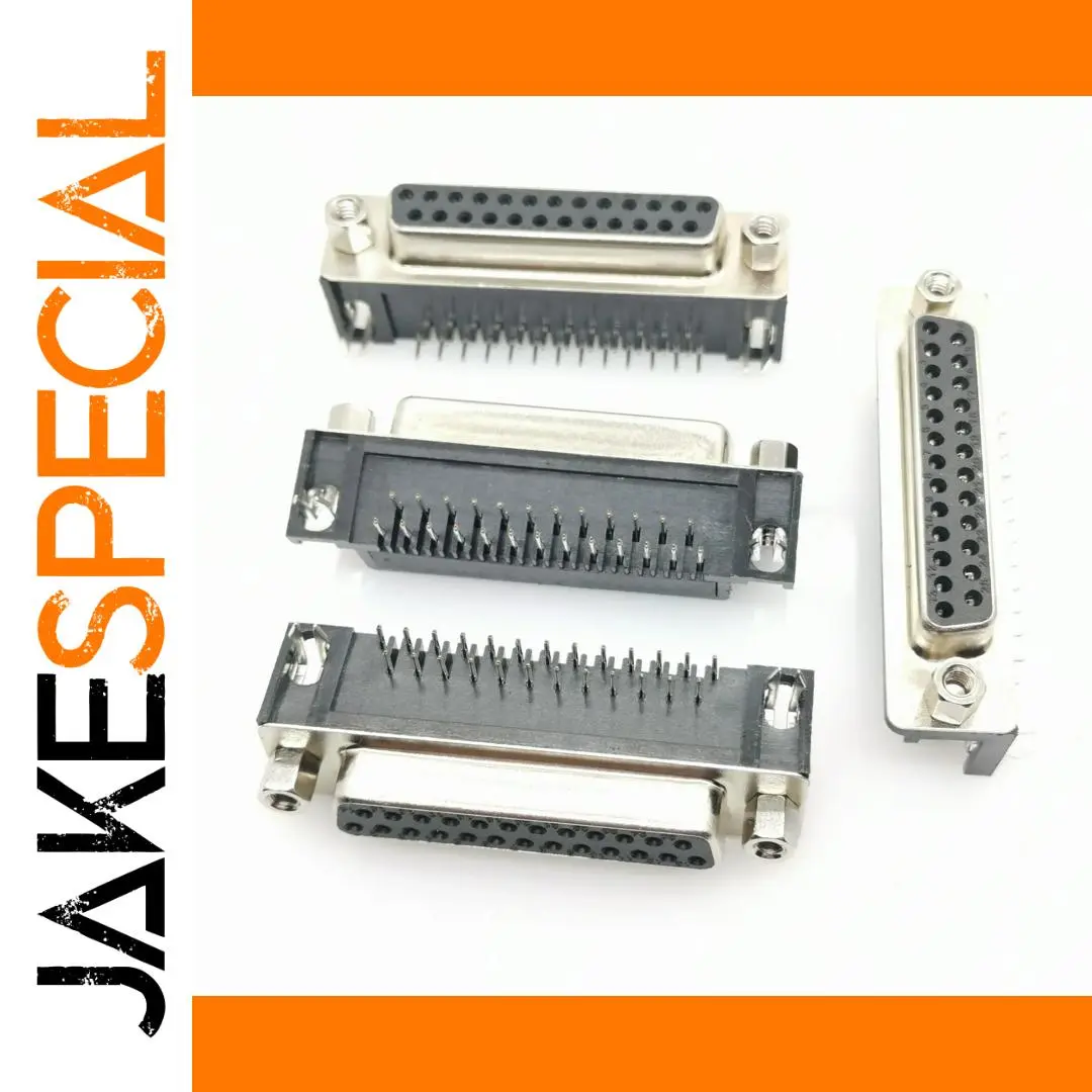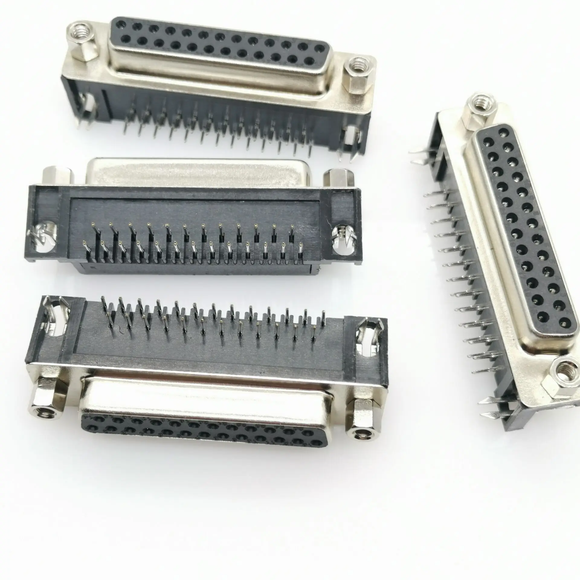Experience secure and reliable connections with this set of 10 DB25 female and DR25 male D-sub right-angle PCB mount double-row pins electrical connectors. Crafted with a sturdy metallic rectangular shell finished in polished or matte texture, these connectors feature black plastic insulators holding gold-plated pins arranged in two parallel rows. The right-angle design allows for space-efficient circuit board mounting, while the integrated hexagonal screw nuts ensure a firm lock. Ideal for high-density electronic applications, these corrosion-free connectors are perfect for professionals seeking durable, precise, and professional-grade components for electrical system integration.