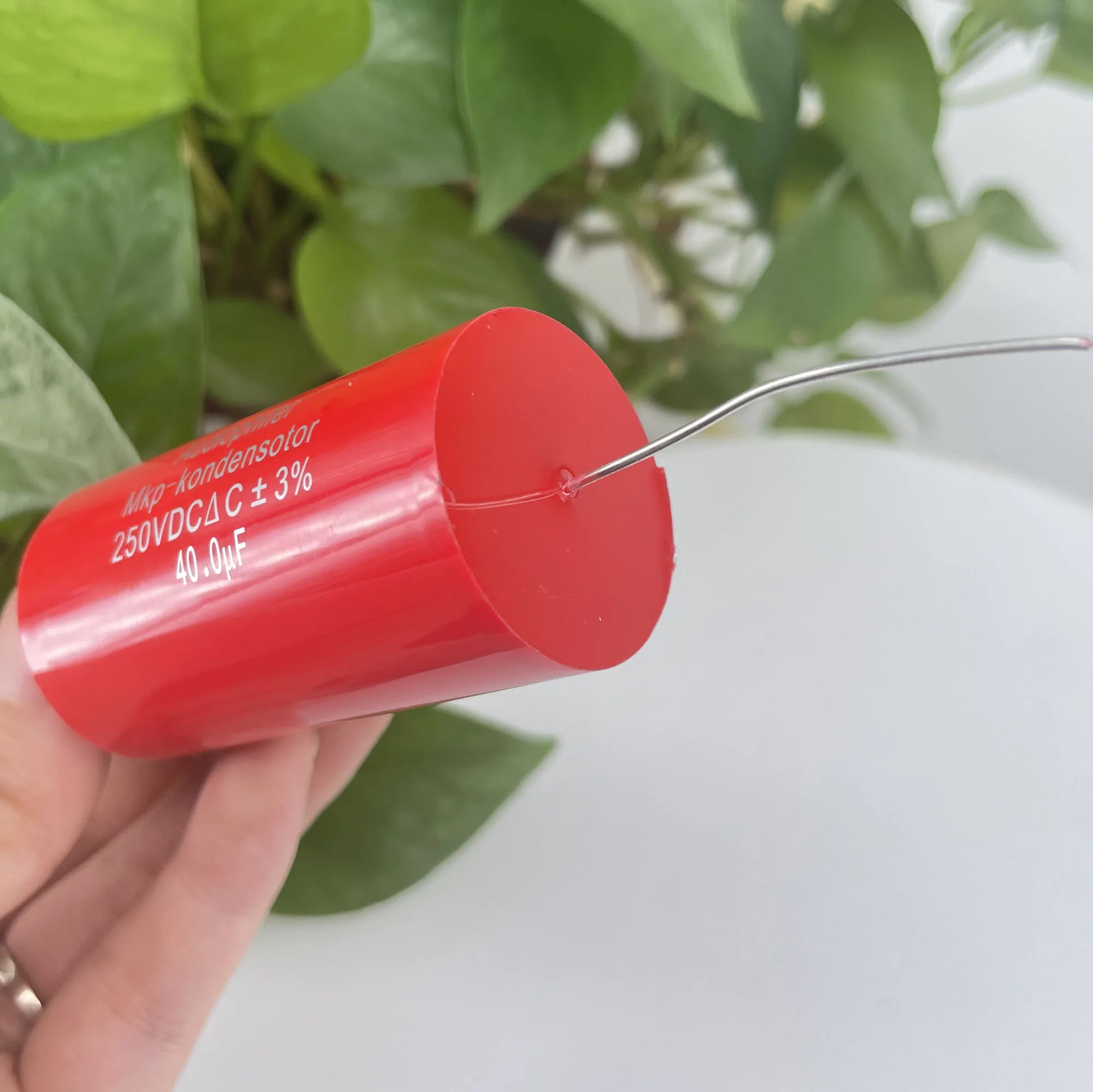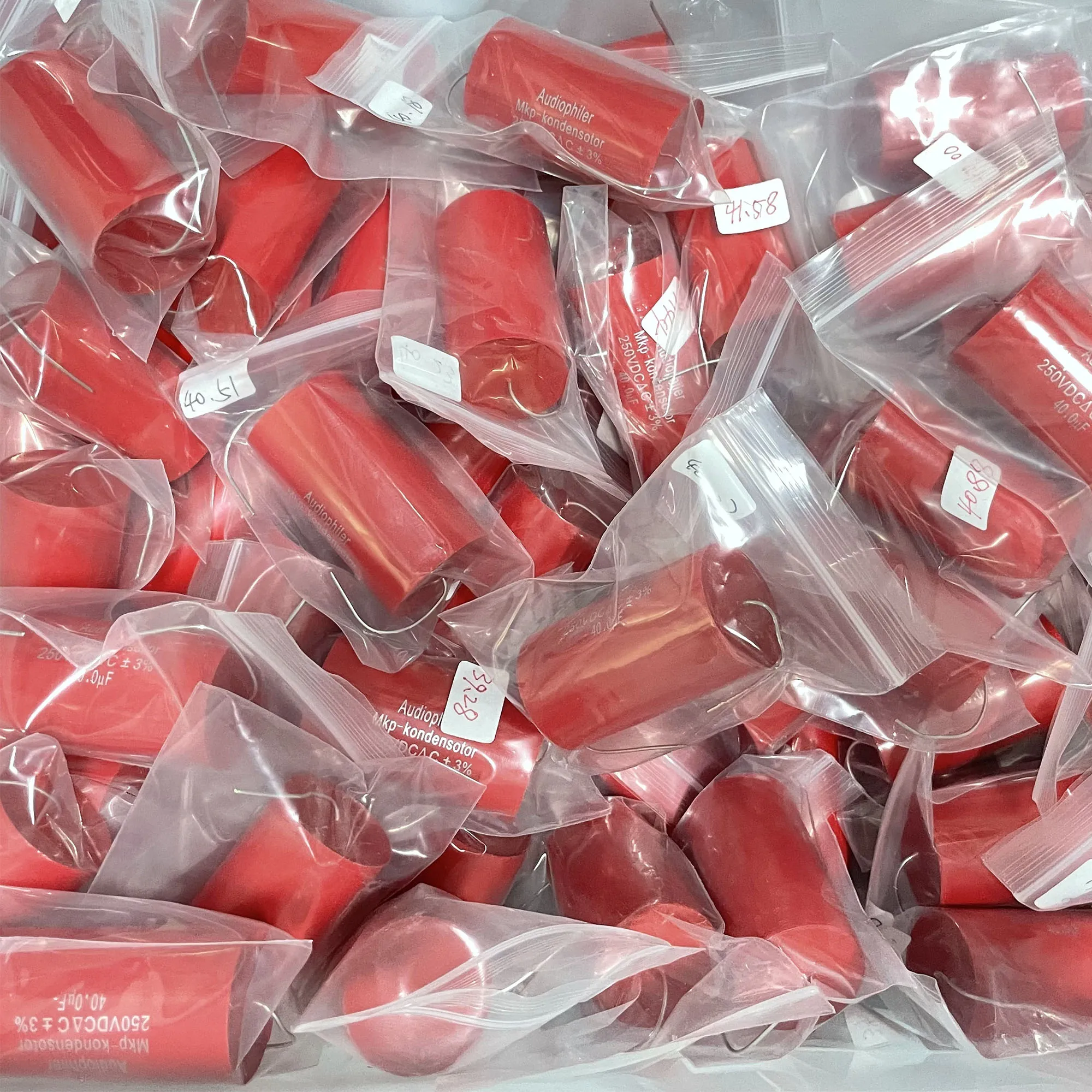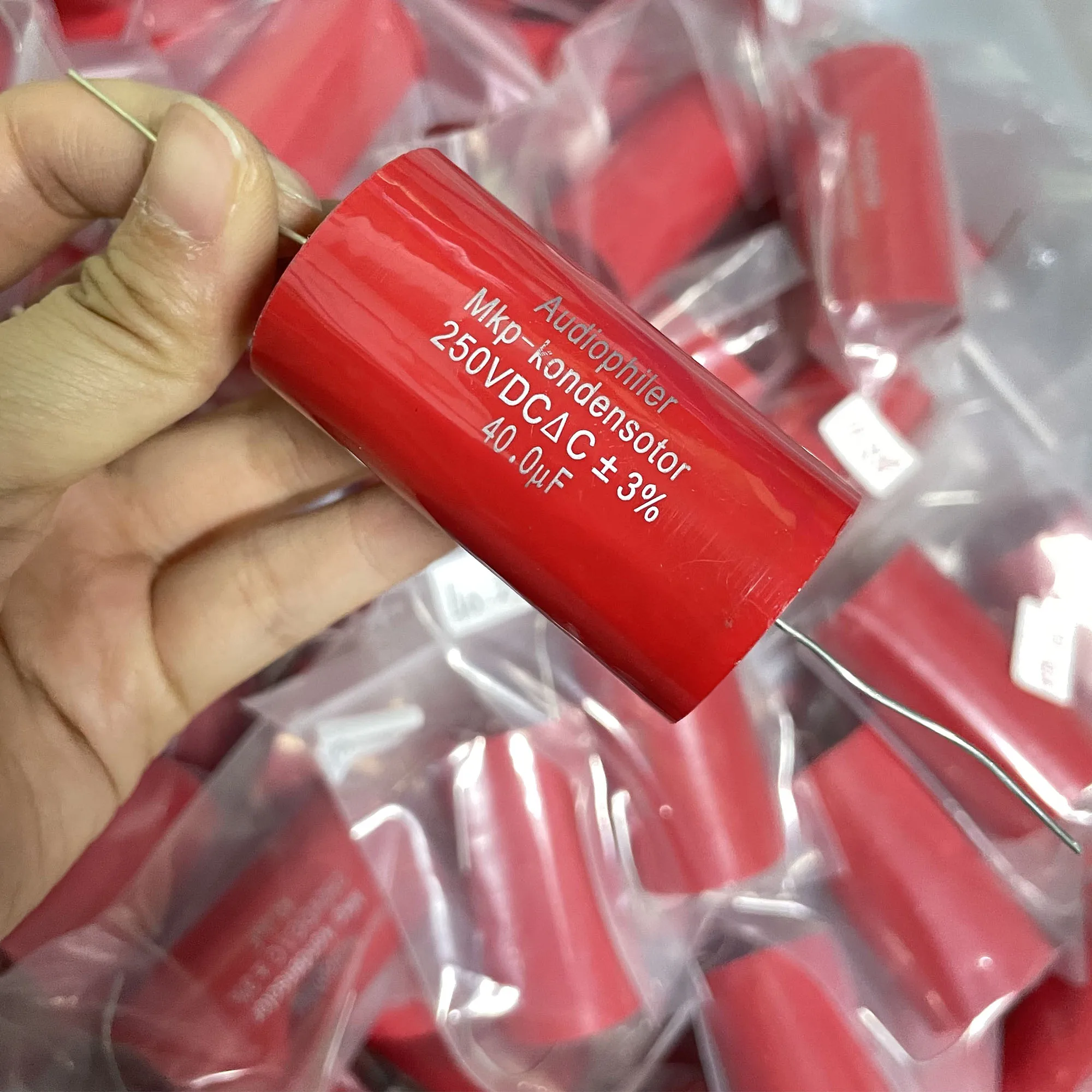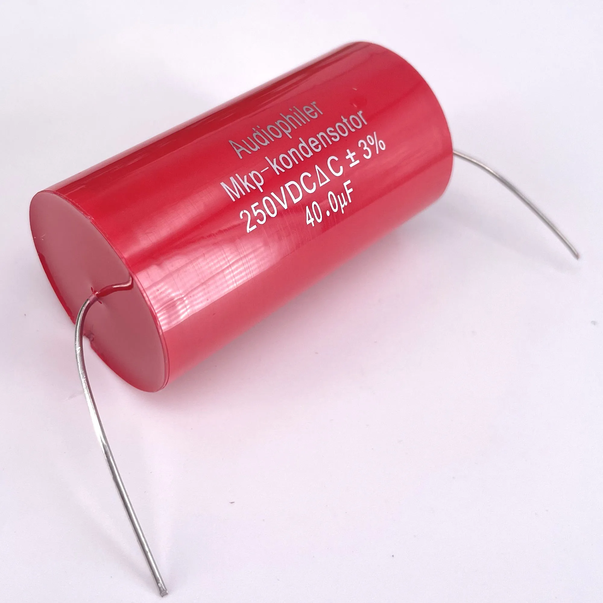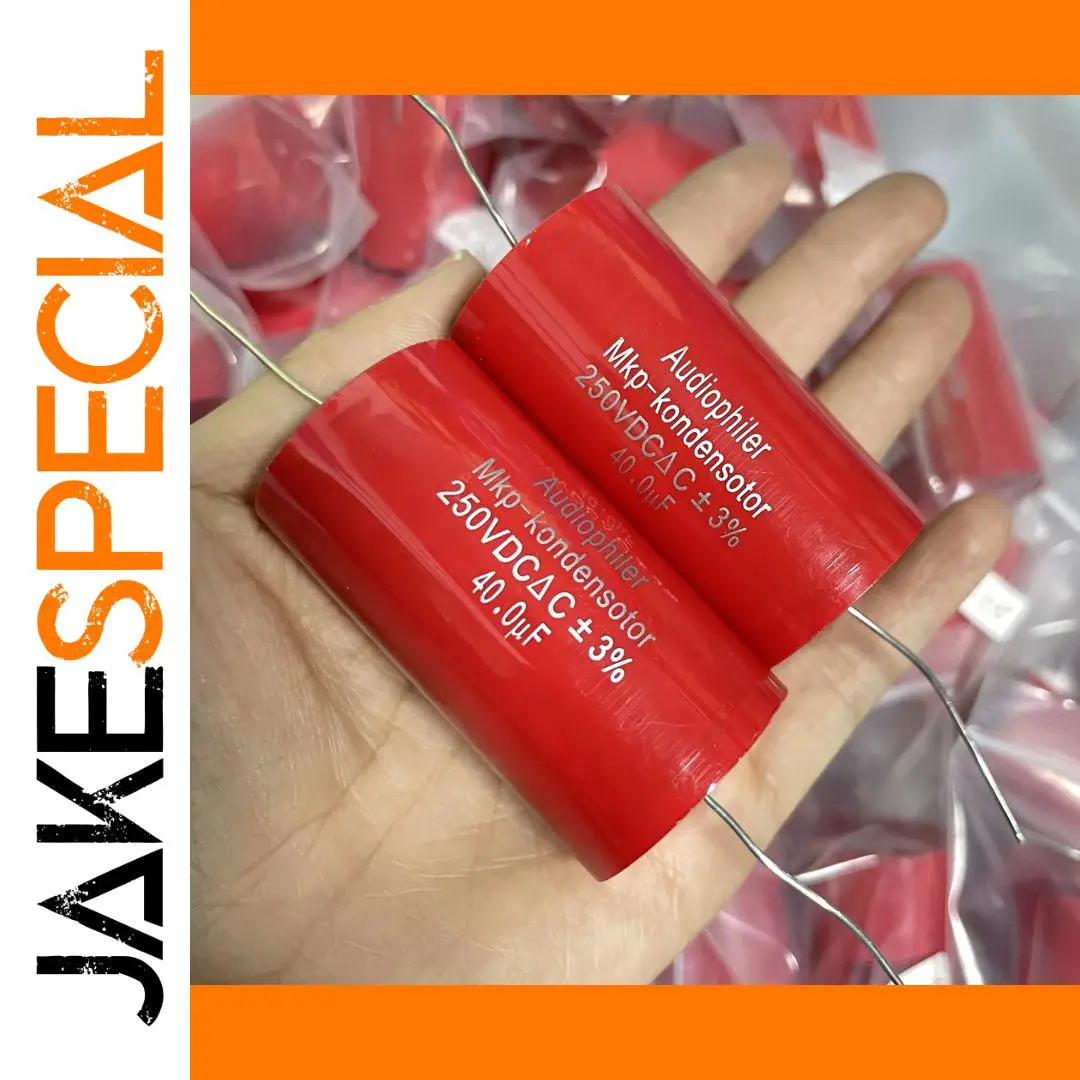 These matched polypropylene film capacitors feature a 40µF capacitance, 250V DC rated voltage, and ±3% tolerance, with dimensions of approximately 56.1mm in length and 30.6mm in diameter. Designed for high-pressure and high-voltage audio applications, they operate at temperatures up to 105°C and feature copper foot leads for durability. Perfect for frequency dividing and coupling in high-fidelity audio systems, these professional-grade trimmer capacitors deliver precise performance with a sleek, red cylindrical design. Their sturdy construction and exact specifications make them an essential component for audiophiles seeking reliable, high-quality sound system enhancements.