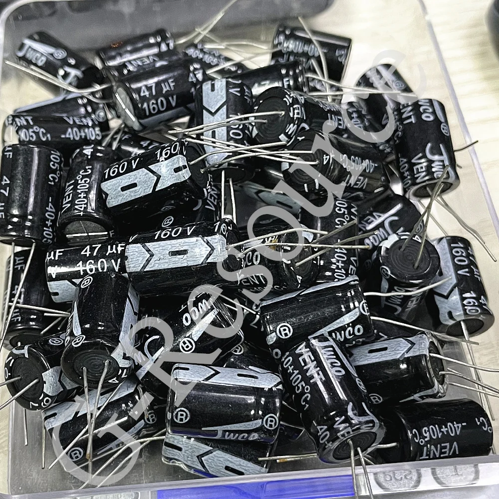This set of 50 aluminum electrolytic capacitors features a voltage rating of 160V and a capacitance of 47μF, with each unit measuring 13mm in diameter and 20mm in length. Designed with straight pins for easy through-hole installation, these high-quality components offer reliable performance for a variety of electronic circuits. The sleek, black cylindrical casing provides a modern, minimalist aesthetic, with white printed text for clear identification of specifications. Compact and durable, these capacitors are ideal for applications requiring high voltage and capacitance in a streamlined, space-saving form factor, ensuring precise and stable operation in your electronic projects.