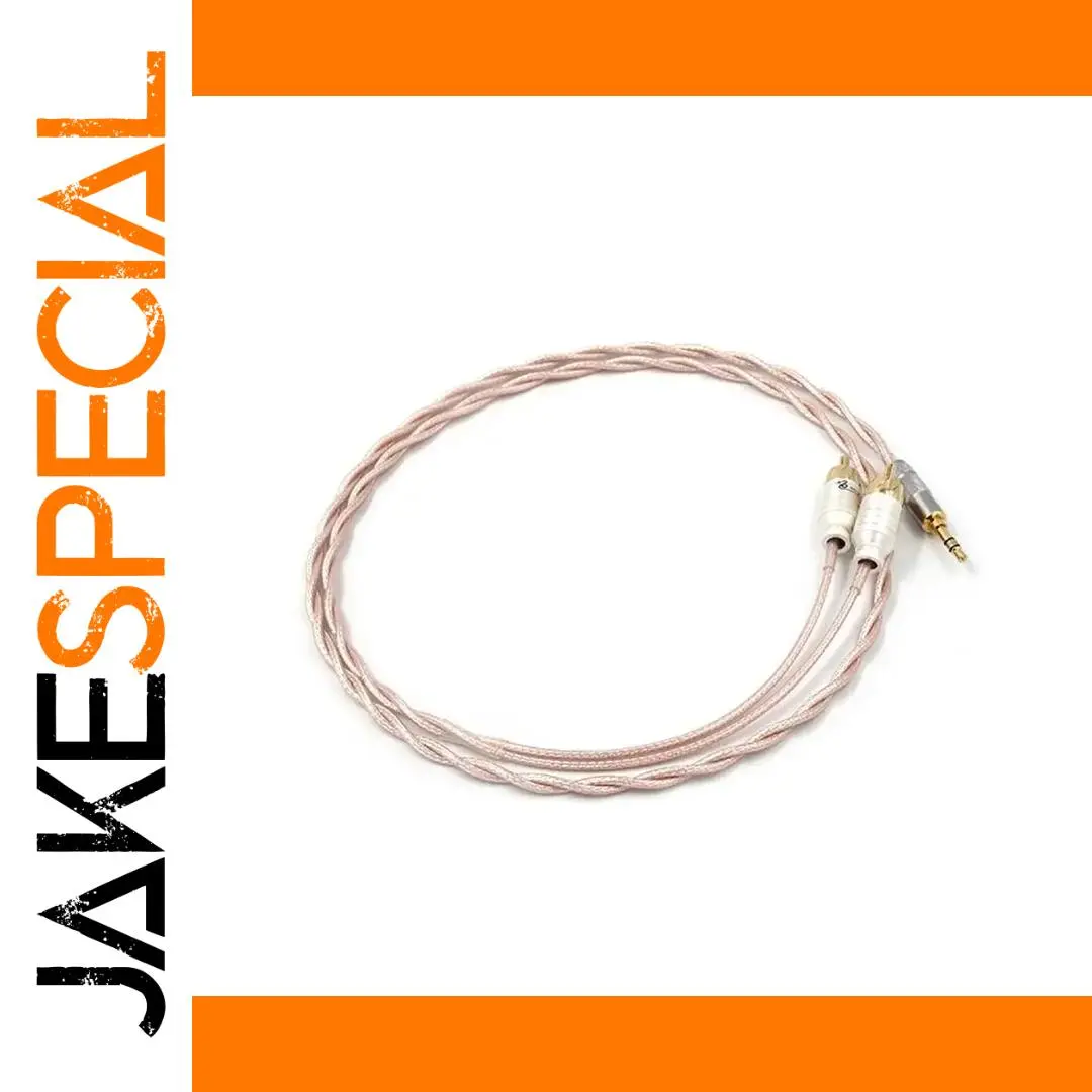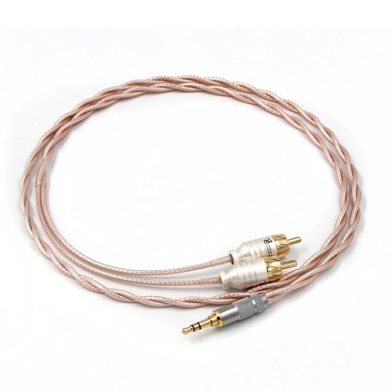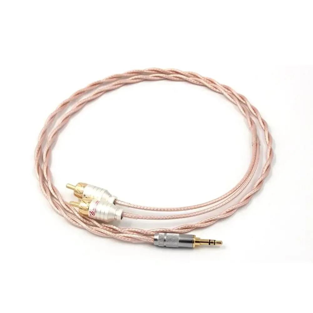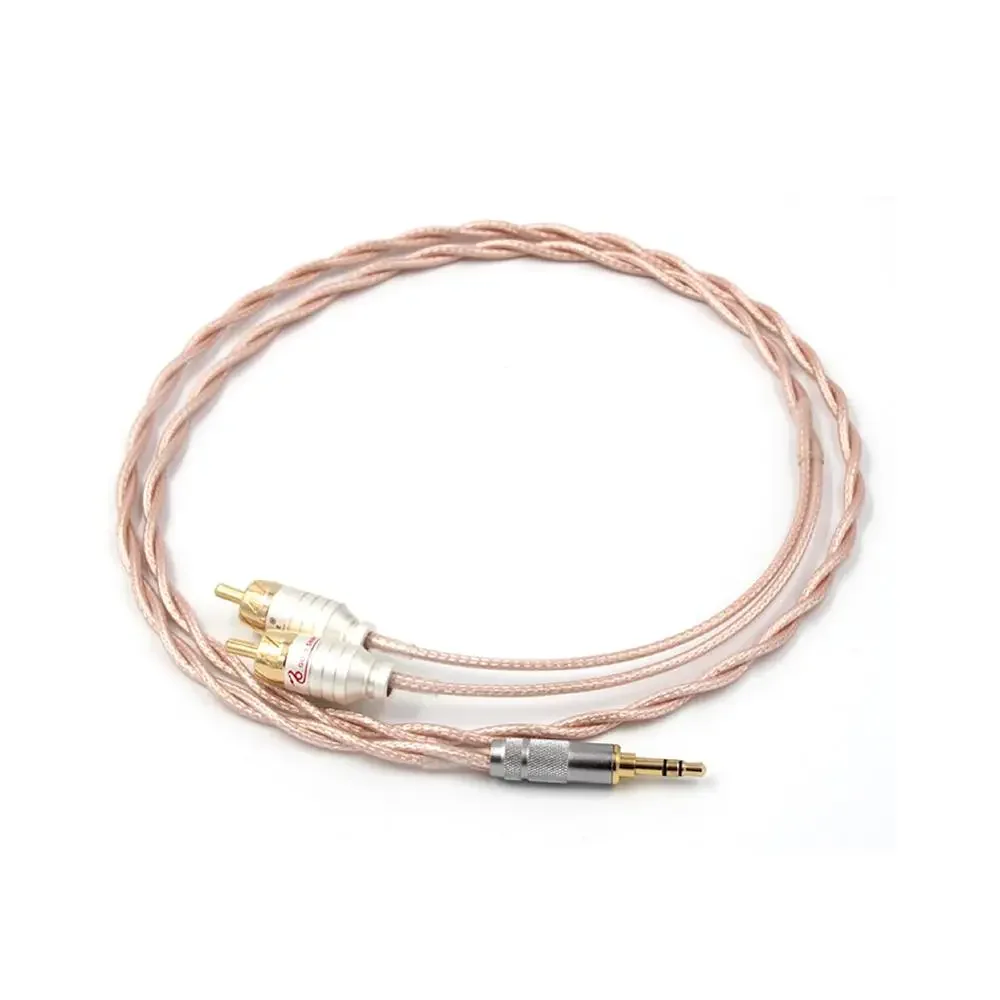 Experience high-fidelity sound with this premium audio cable featuring a 3.5mm stereo plug and two gold-plated RCA male connectors. Crafted with a silver-plated conductor encased in Teflon insulation for minimal signal loss and interference, this durable and sleek cable is available in lengths from 0.5m to 3m. Its transparent or pale pink braided outer sheath showcases the shiny conductors, while textured knurled grips on the RCA connectors ensure easy handling. Designed for seamless connection between MP3/MP4 players, DVD players, amplifiers, and high-end audio equipment, it offers reliable, high-quality audio transfer for an exceptional listening experience.