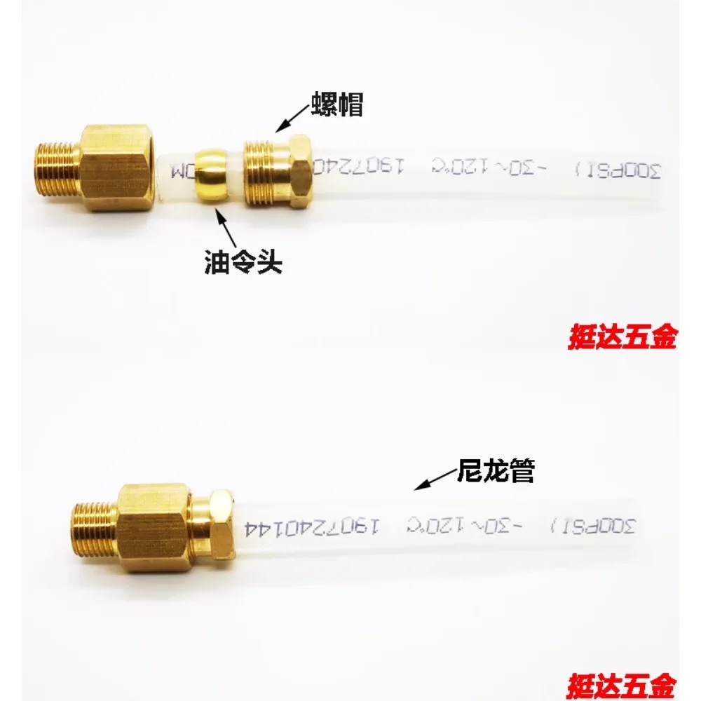 Experience seamless fluid or oil flow with this set of five high-quality brass compression elbows, meticulously crafted to enhance your lubrication or hydraulic system. These fittings feature polished, shiny surfaces with a luxurious gold hue, reflecting light for a sophisticated look. Designed with precise threading and hexagonal heads, they ensure secure attachment and easy installation. The elbow connectors are compatible with a variety of pipe sizes—4mm, 6mm, and 8mm inner diameters—making them versatile for different setups. Whether upgrading or repairing, these durable fittings provide reliable sealing and performance under pressures of ≥850 kPa. Their elegant craftsmanship not only guarantees function but also adds a professional aesthetic to your system.