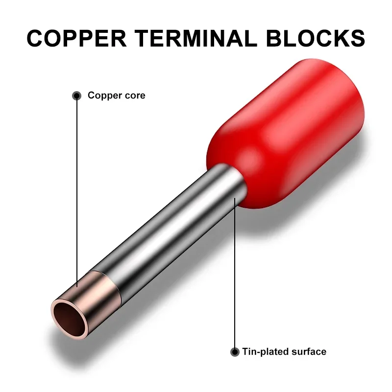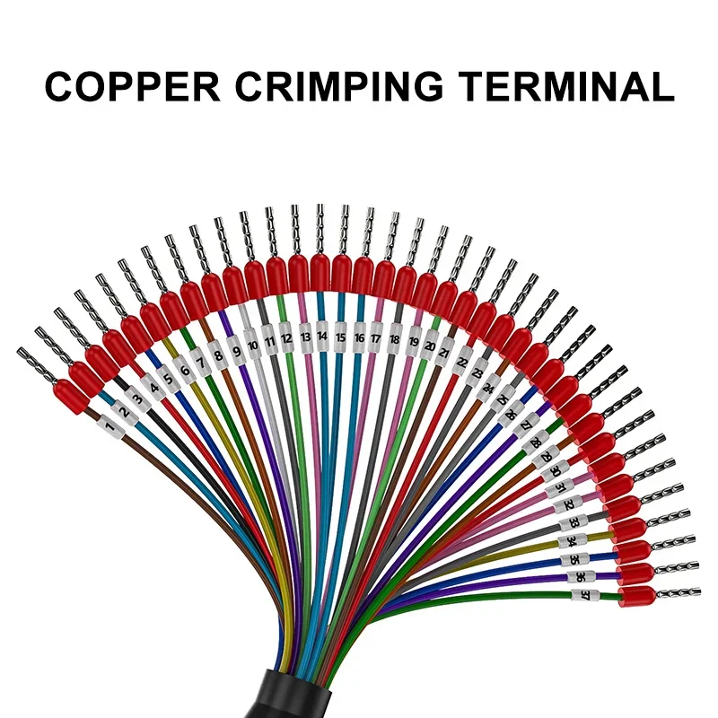 - Includes a bundle of color-coded wires—red, white, green, blue, purple, gray, brown, black—each terminated with shiny metal pins, labeled for quick identification.