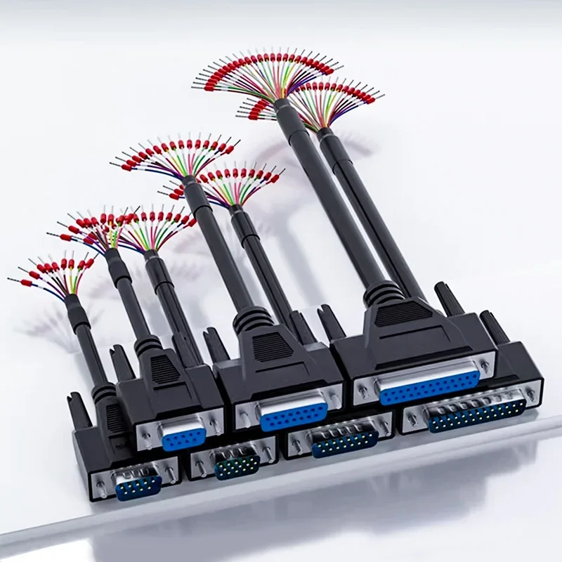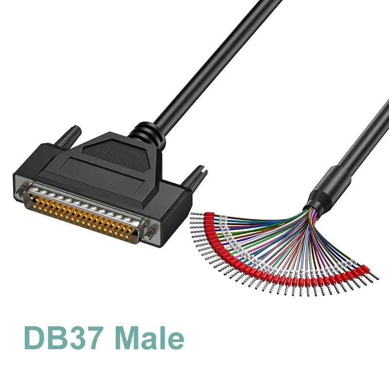 Experience seamless connectivity with this durable parallel port cable designed for industrial and electronic applications. Featuring a robust construction, it supports DB44 and DB37 configurations, making it compatible with a wide range of devices. The cable's black sheath is smooth and flexible, providing both durability and shielding against electromagnetic interference. One end features a sturdy metallic connector with a textured grip for easy handling, secured with small screws for stability. The other end displays an organized bundle of color-coded wires—vivid reds, whites, greens, blues, purples, grays, browns, and blacks—terminated with shiny metal pins labeled for easy identification. Available in various lengths, this cable ensures efficient data transfer and a reliable connection in your setup.