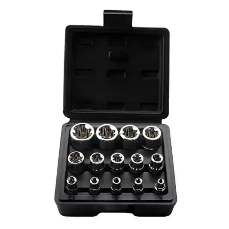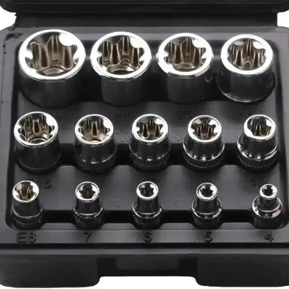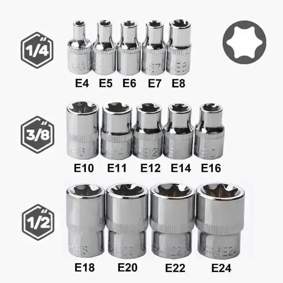 - 14 precision-engineered sockets in sizes E4 to E24, covering all common E-type Torx fasteners for versatile use across various projects.