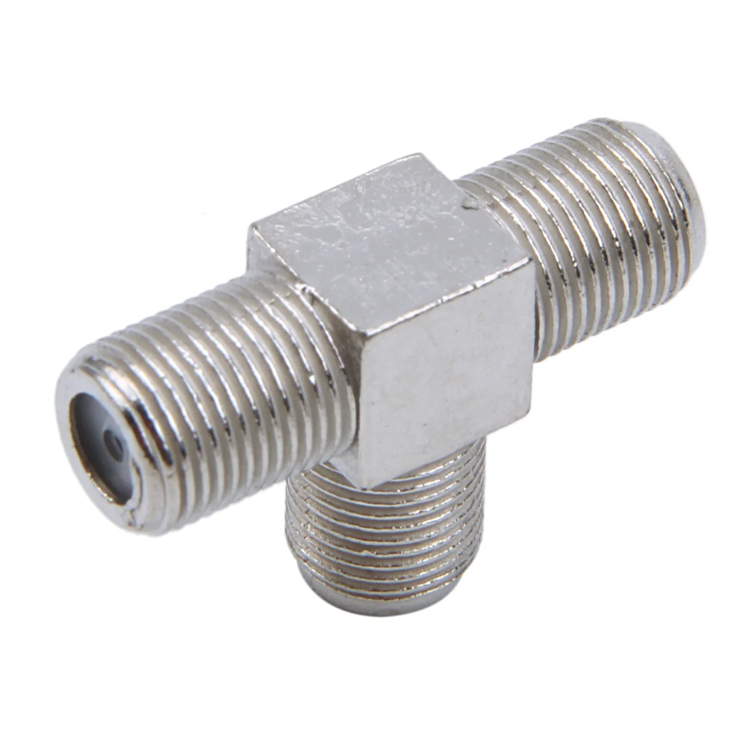Imagine effortlessly connecting your satellite, cable TV, or home theater system with this premium set of female T-adapters. Crafted from durable nickel-plated copper, these connectors feature a sleek, silver metallic finish that adds a touch of industrial elegance to your setup. The finely threaded exterior ensures a secure fit, while the integrated square-shaped hex nut allows for easy tightening with a wrench, guaranteeing a reliable and stable connection. Designed for simplicity and durability, these connectors will seamlessly blend into your installation, whether you're extending your coaxial cables or creating a reliable split for signal sharing. Plus, their precise craftsmanship guarantees optimal signal transmission at up to 2 GHz, making your signal distribution smooth and interference-free.