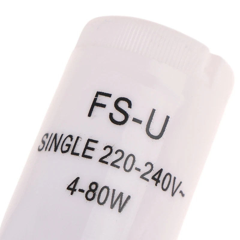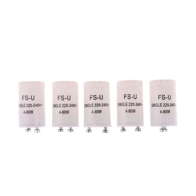 Enhance your lighting setup with this reliable set of five fluorescent starters, each measuring 38 x 20 mm. Designed in a sleek white plastic housing with durable metal components, these starters provide seamless ignition for 4-80 watt fluorescent lamps operating at AC220-240V. Their compact and minimalist design ensures effortless installation into compatible fixtures, while the printed black text clearly displays their technical specifications. Built for both efficiency and longevity, these starters are perfect for maintaining consistent lighting performance in residential or commercial environments. Trust in their sturdy construction and standardized safety certifications to deliver dependable operation whenever you need it. Simplify your lighting maintenance today with this practical, high-quality set.