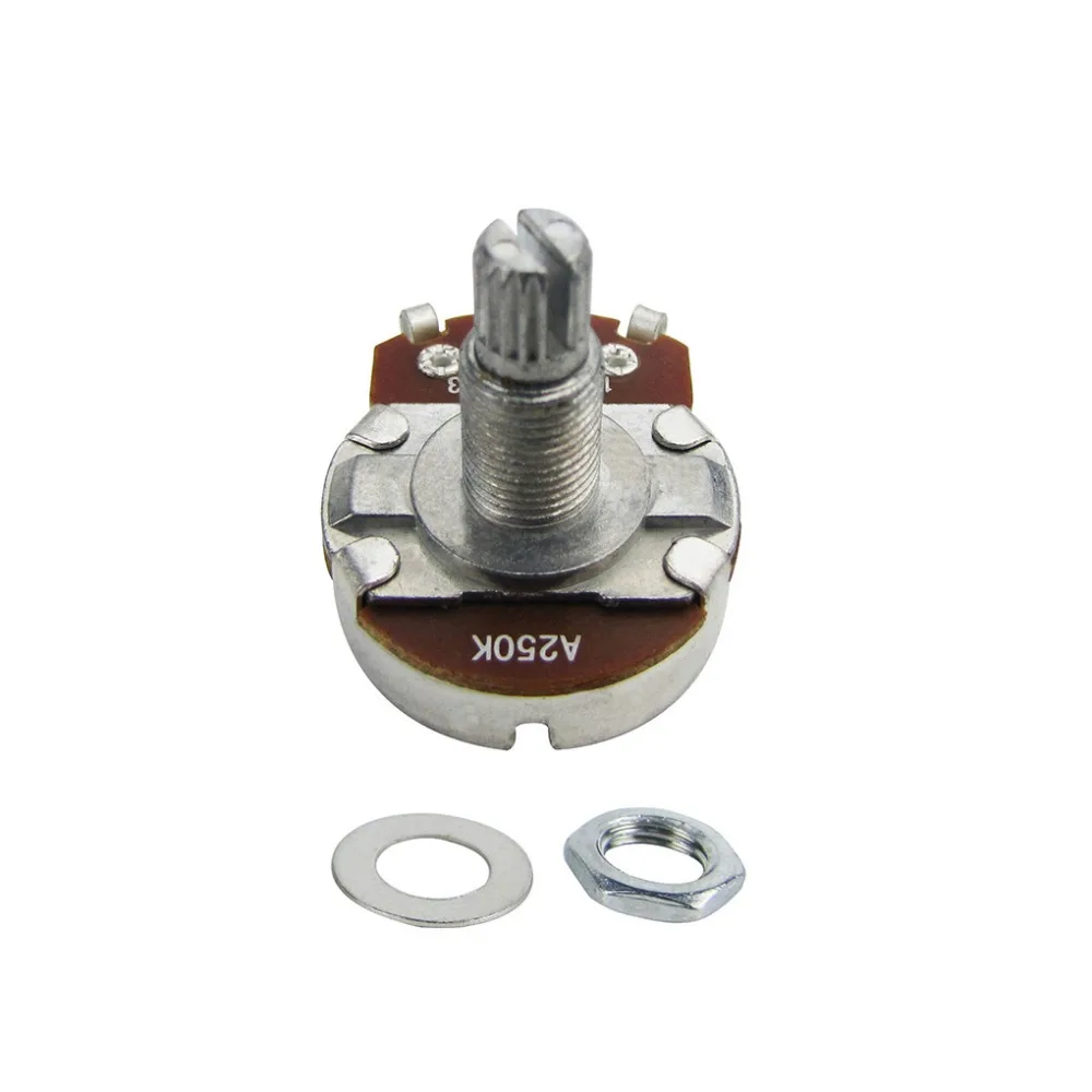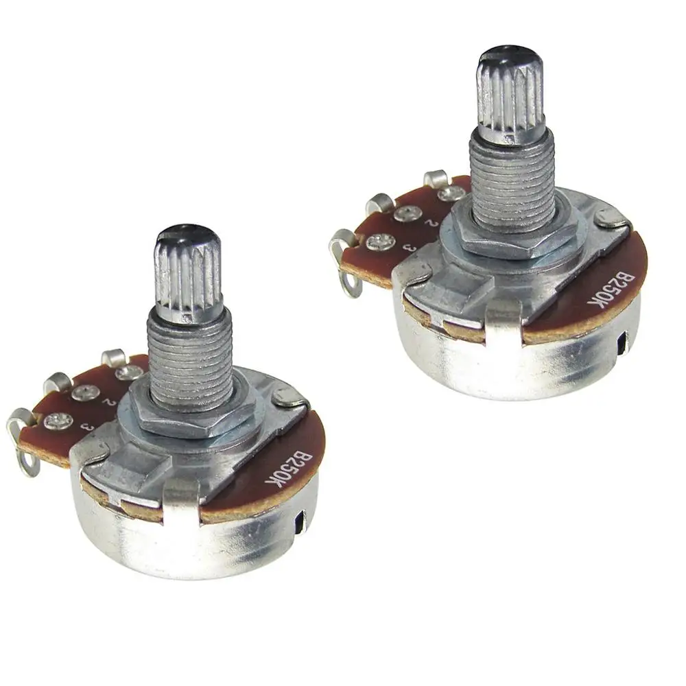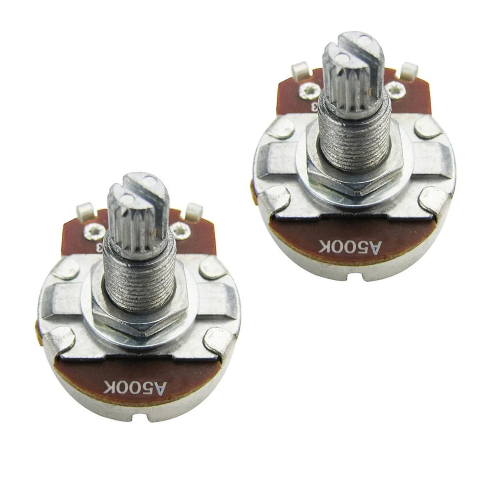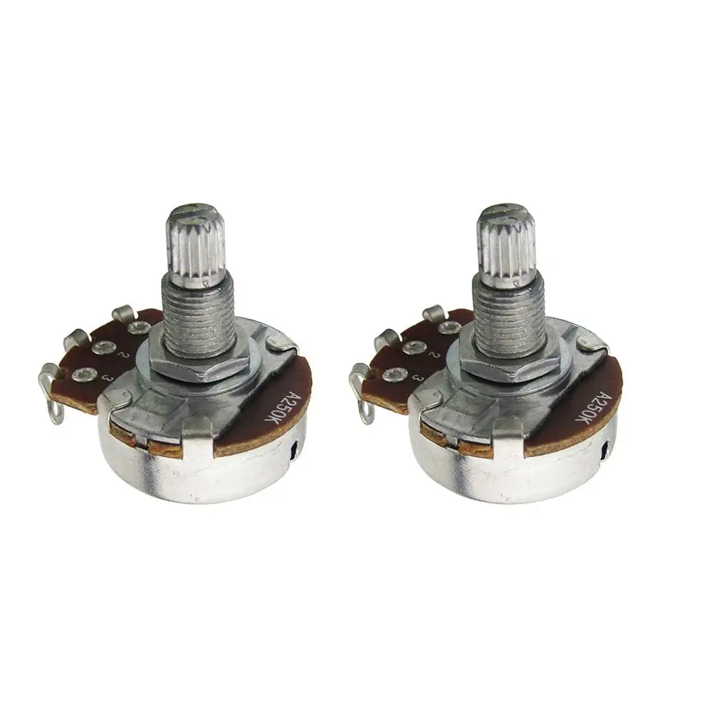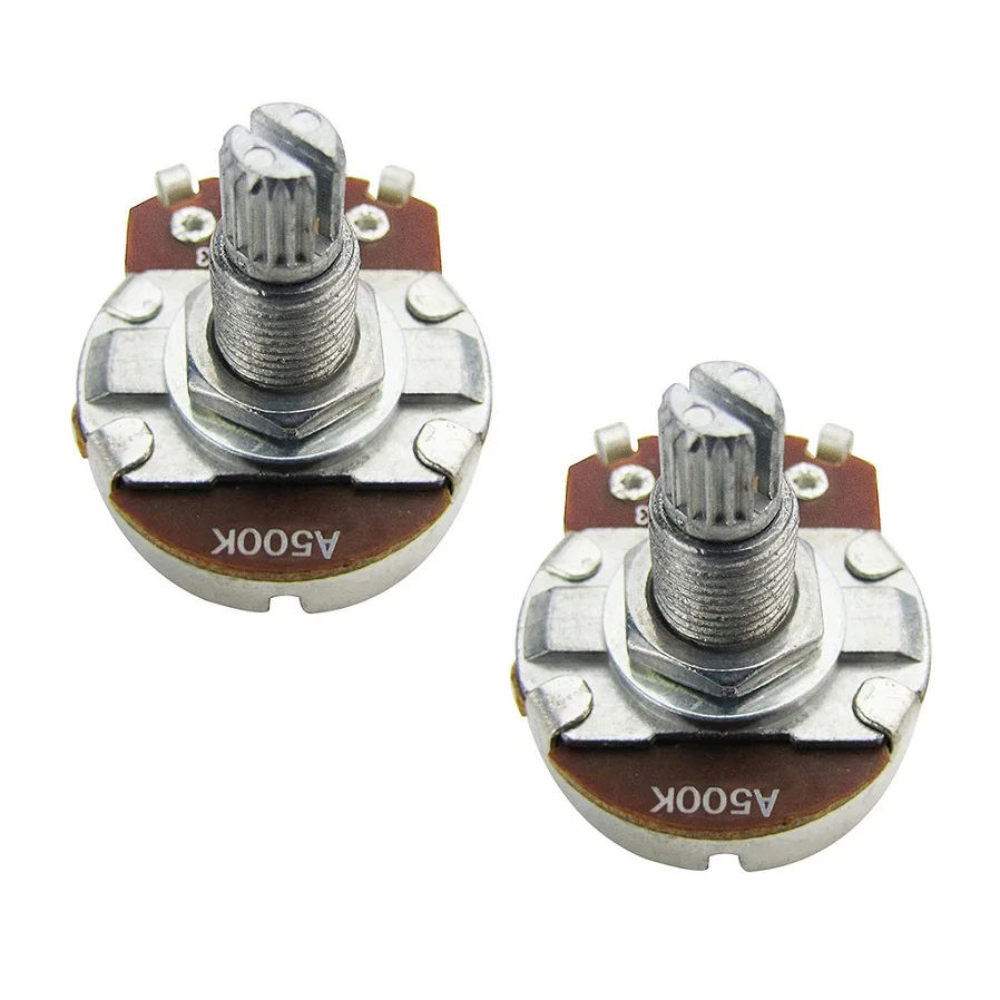 Upgrade your guitar electronics with this set of two high-quality potentiometers available in resistance options of 250k ohms (A250K, B250K) and 500k ohms (A500K, B500K). Featuring a durable, full-size design, each potentiometer has a long, split, knurled shaft approximately 18mm long and 6mm in diameter, with an 8mm threaded shaft for secure fitting. The sleek metallic base has a diameter of 24mm, with an overall length of 29mm. Choose between linear taper (B type) for volume controls or audio taper (A type) for tone adjustment, ensuring optimal performance and precise control for electric and bass guitars.