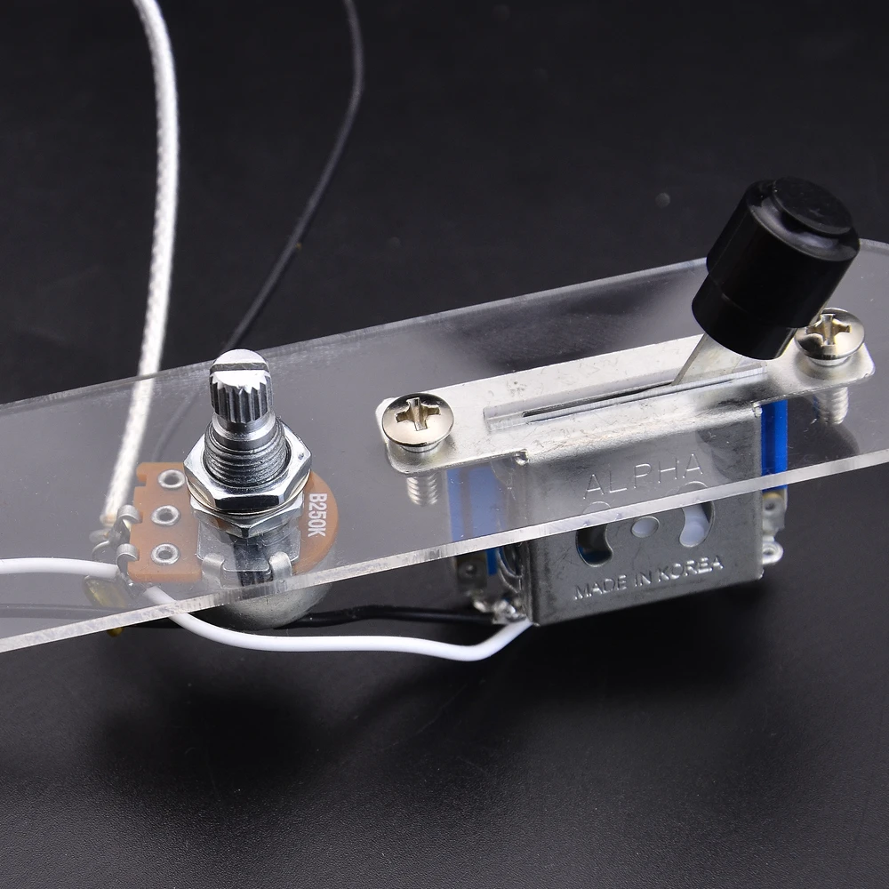 Experience a seamless upgrade for your electric guitar with this meticulously crafted wiring harness. Designed for durability and reliable performance, it features a sleek, transparent elongated oval plastic mounting plate that offers a minimalist aesthetic. The set includes two sturdy, chrome-finished 250K potentiometers made in Korea, perfect for precise volume and tone control. The modern, slim 3-way Alpha switch, also Korean-made, delivers smooth pickup selection. An authentic, vintage-style Korea-made jack ensures sound clarity, complemented by braided shielding wires for enhanced durability. The set combines high-quality metal components with refined craftsmanship, resulting in a lightweight, 62-gram masterpiece that promises long-lasting performance and easy installation. Elevate your guitar’s wiring with this premium, functional kit.