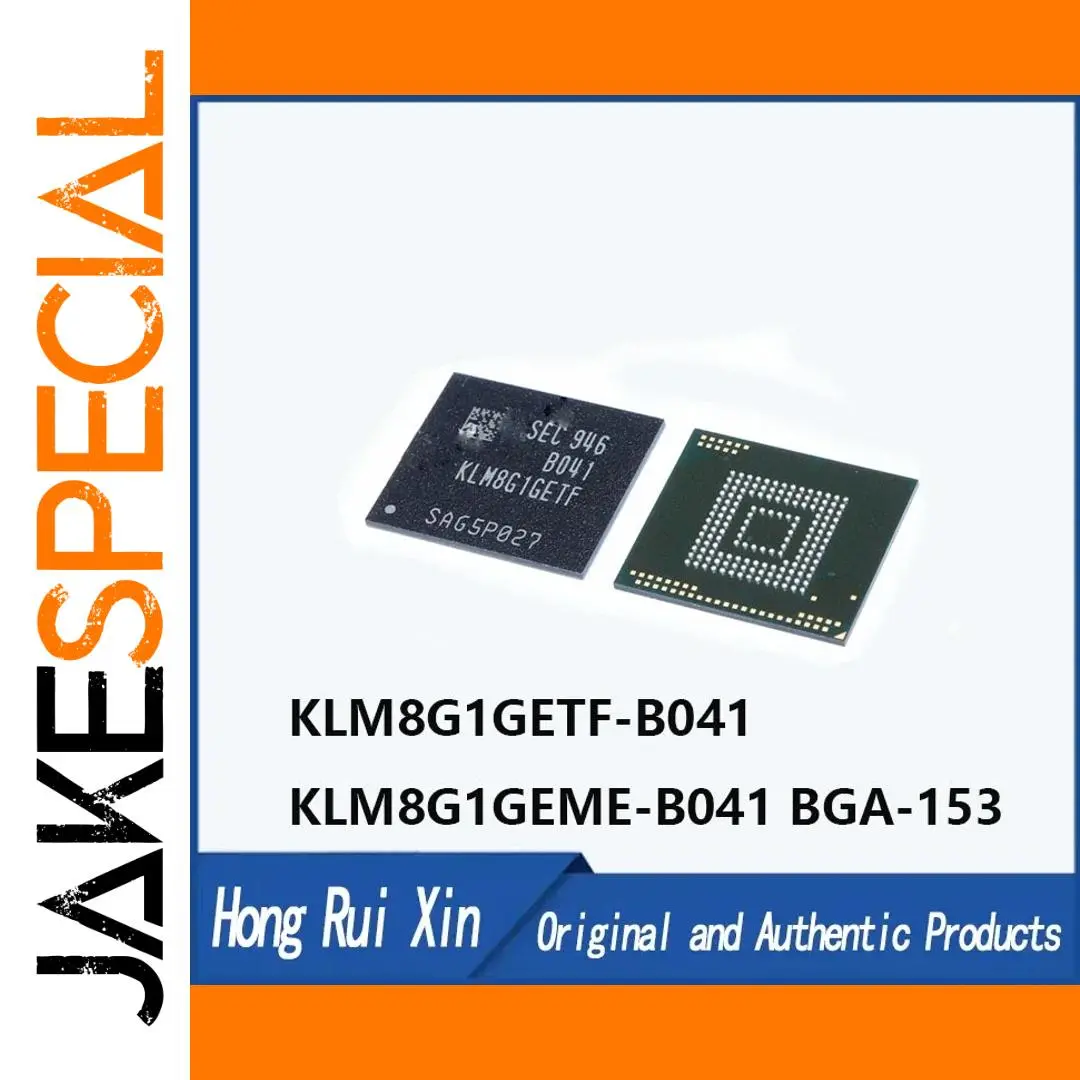 - Technical specifications include dual model numbers: KLM8G1GETF-B041 and KLM8G1GEME-B041, with exact BGA-153 packaging specifications and high-quality flash technology.