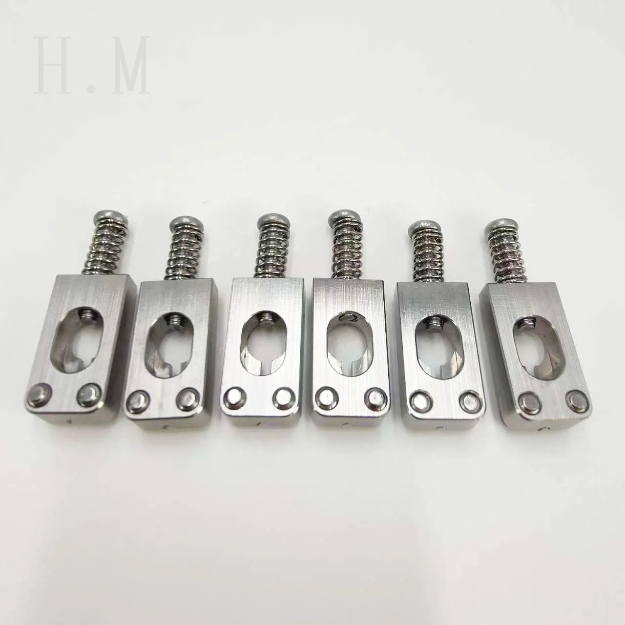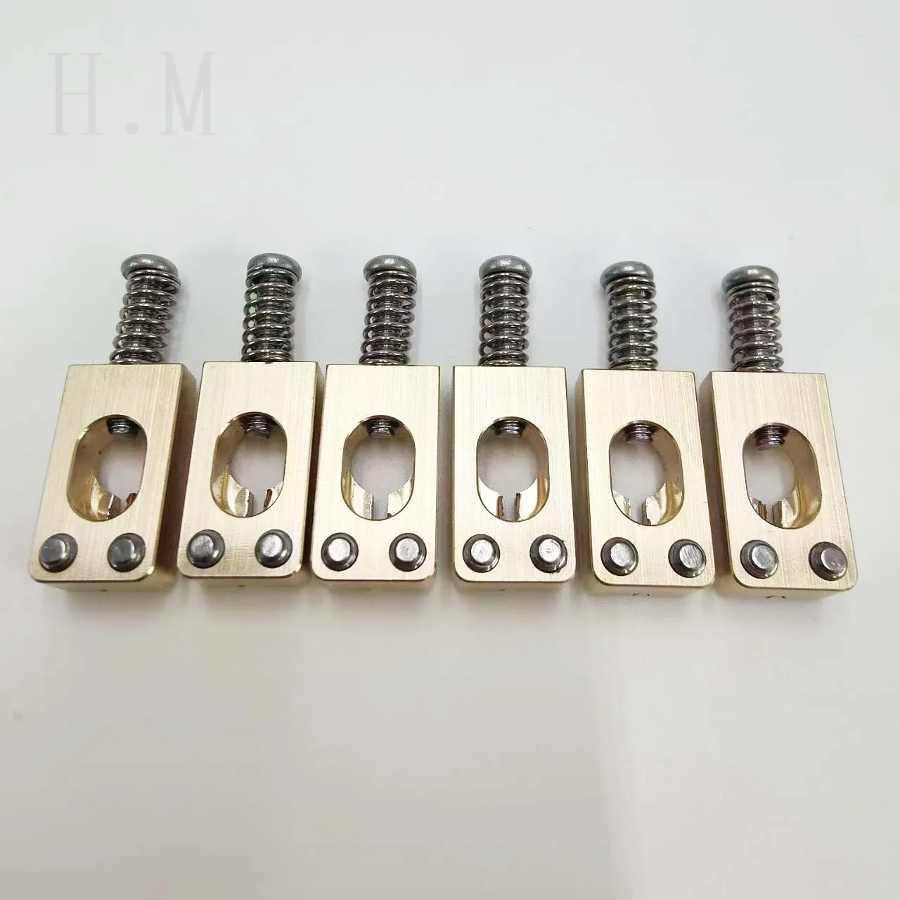 - Six high-quality metal saddle bridges, made from stainless steel and brass, designed for durability and precise string alignment on electric guitars.