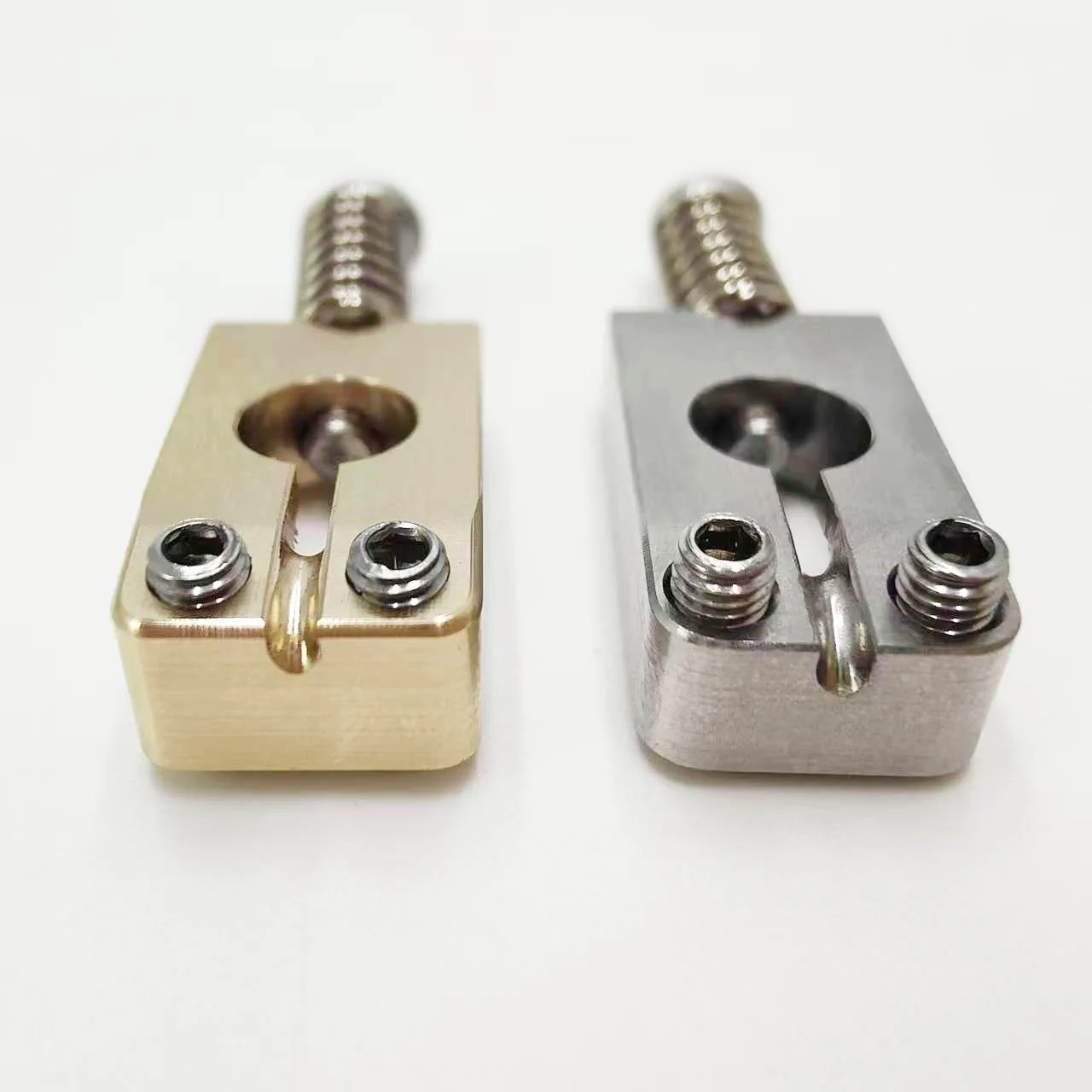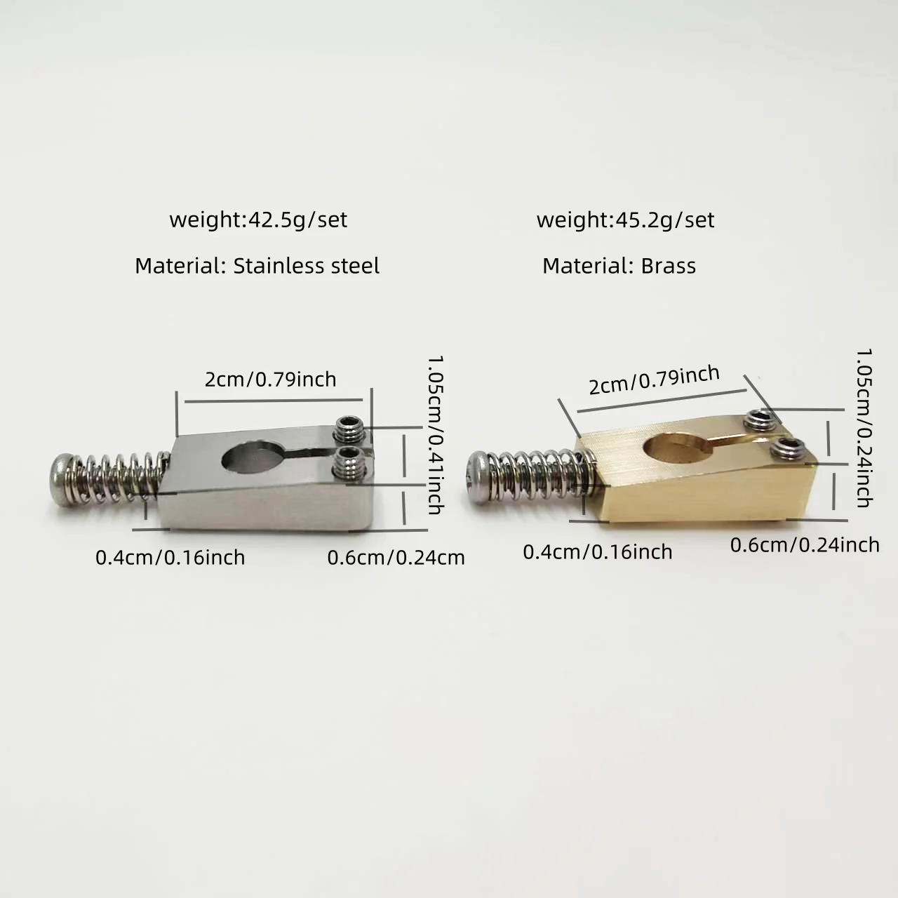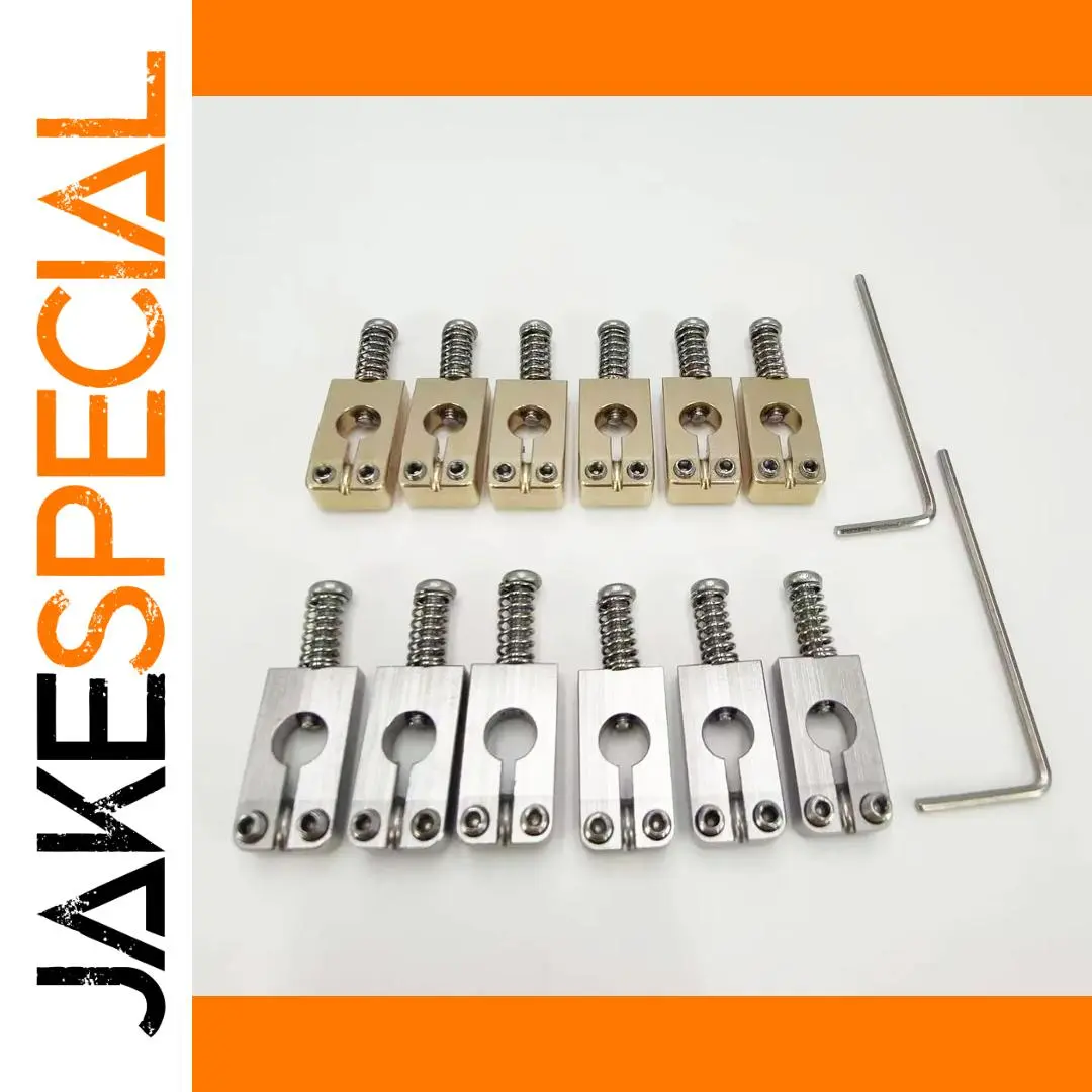 Experience a sleek upgrade to your electric guitar with this set of six metal saddle bridges, crafted from durable stainless steel and brass. These high-quality components feature a round hole design, offering optimal string passage and tuning stability. The stainless steel saddles exhibit a polished, shiny silver tone that conveys a modern, meticulous aesthetic, while the brass counterparts showcase a warm, matte golden hue with vintage appeal. Each saddle is precisely machined with a string spacing of 10.5mm, ensuring perfect fit and performance. With included adjustment screws, springs, and an Allen wrench, installing or customizing your setup becomes effortless. This set is perfect for any guitar enthusiast aiming for superior craftsmanship and tonal clarity.