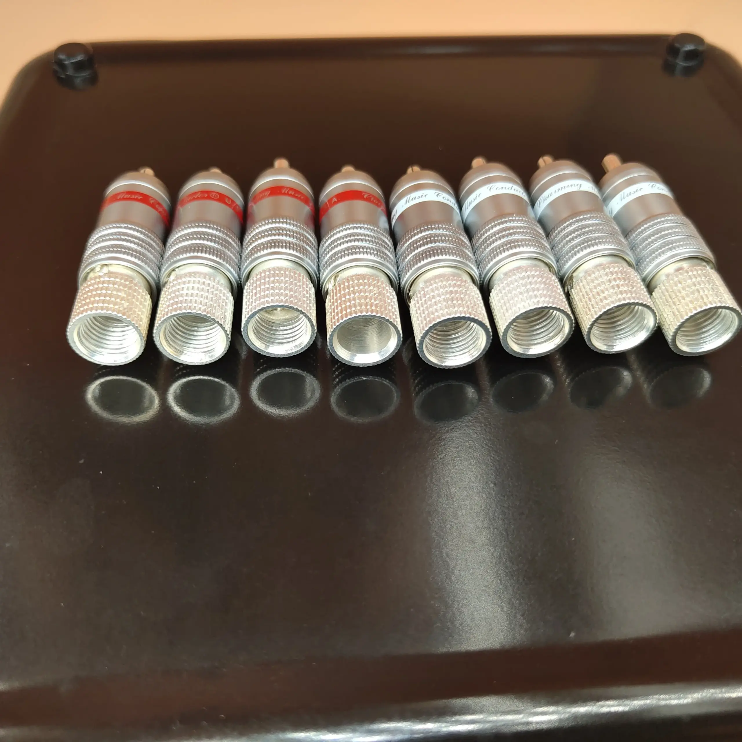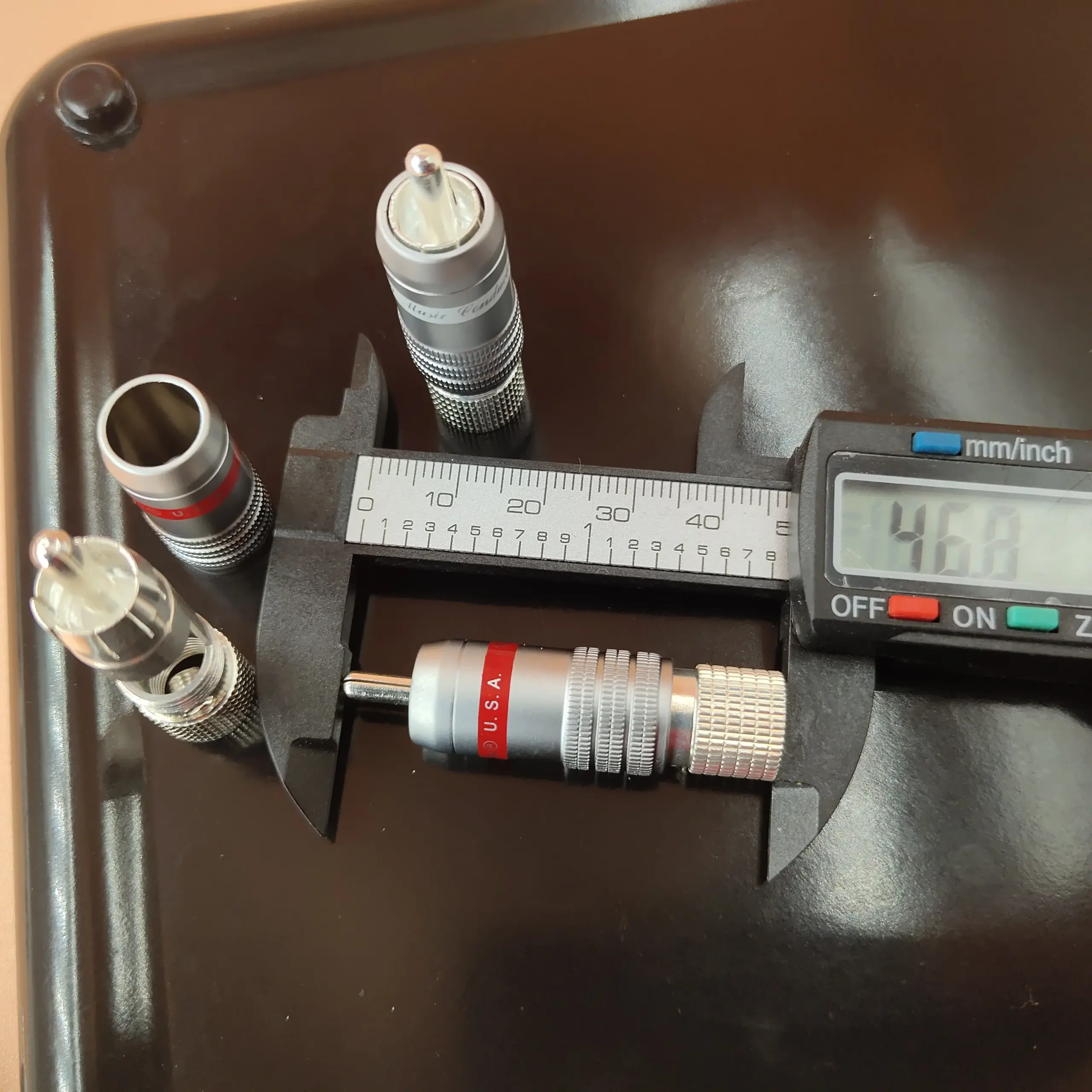 Enhance your audio setup with the CMC High Quality Silver RCA Plugs, designed for high-performance DIY applications. This set includes 8 premium connectors featuring non-magnetic properties, direct double silver plating, and Teflon insulation to ensure optimal signal quality. Measuring 11.50 mm in diameter and 45.00 mm in length, these plugs accommodate cable diameters up to 8 mm and utilize a welding connection method. Each plug is finished with a polished silver exterior, complemented by ribbed grips for secure handling and red accents for a stylish touch. Ideal for audio enthusiasts seeking reliability and sophistication in their projects.