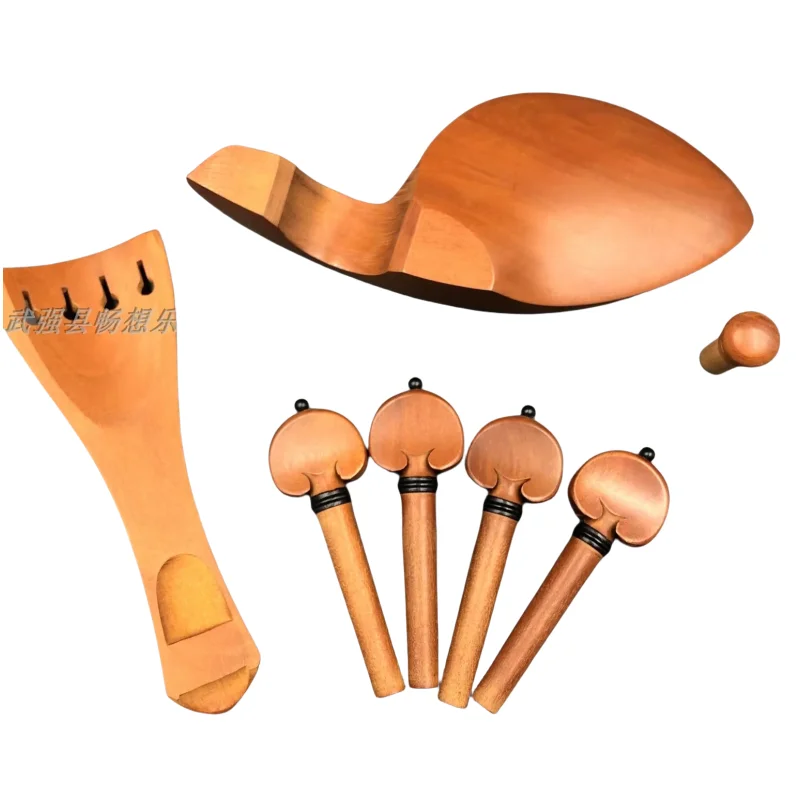 Experience the elegance and craftsmanship of this set of high-quality viola fittings, meticulously crafted from hand-carved jujube wood. Including a contoured chin rest, elongated tailpiece, four tuning pegs, and an endpin, all components feature a warm, natural brown tone with polished surfaces that highlight the beautiful wood grain. Designed for professional use, these fittings seamlessly blend functionality with understated aesthetic appeal. The rounded tuners with small knobs ensure precise tuning, while subtle black rings add a refined touch. Elevate your viola with this durable, beautifully crafted accessory set, perfect for maintenance or customization, promising both performance and natural visual harmony.