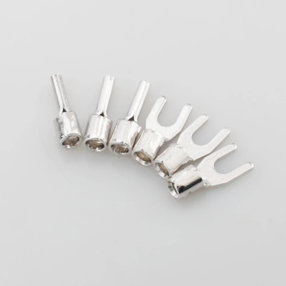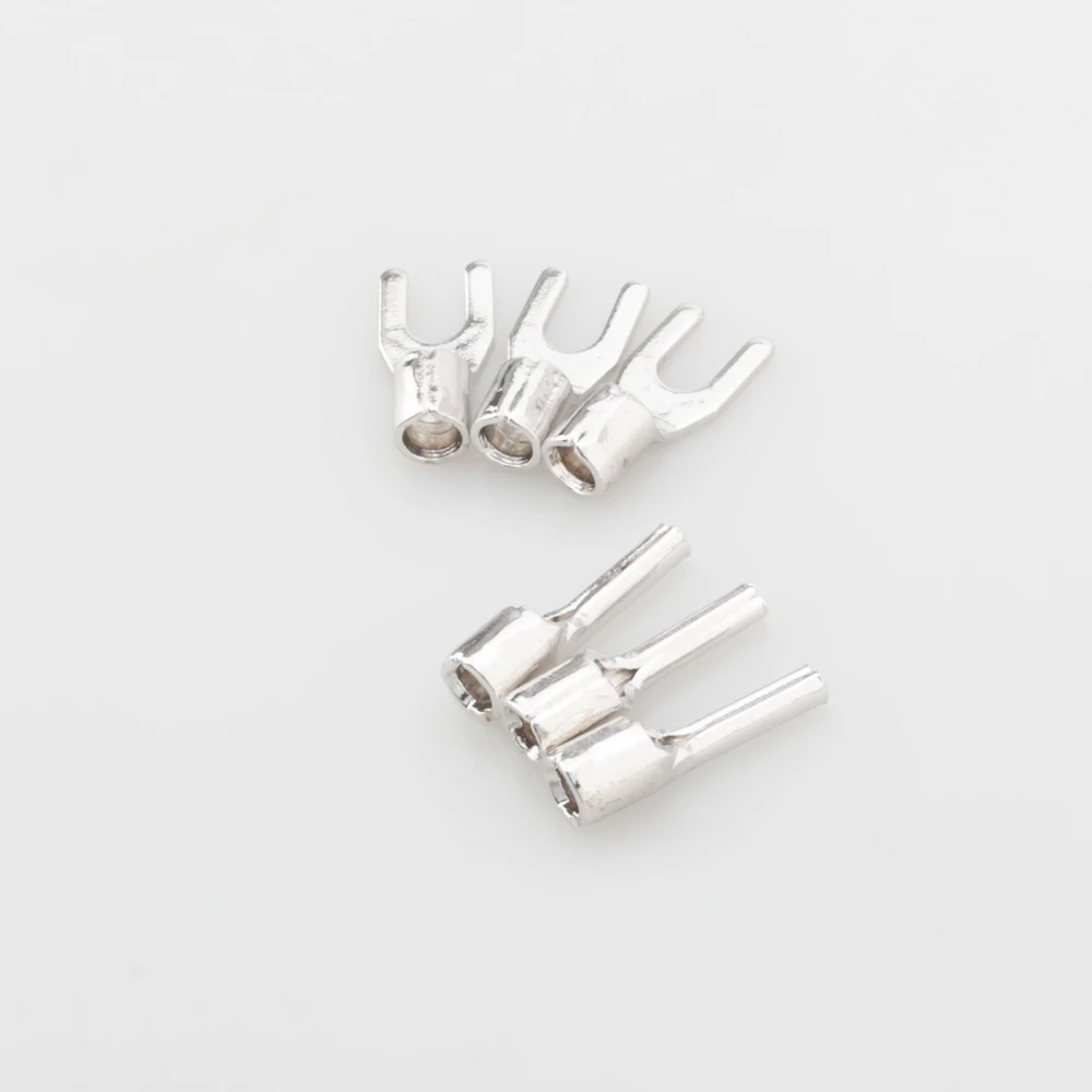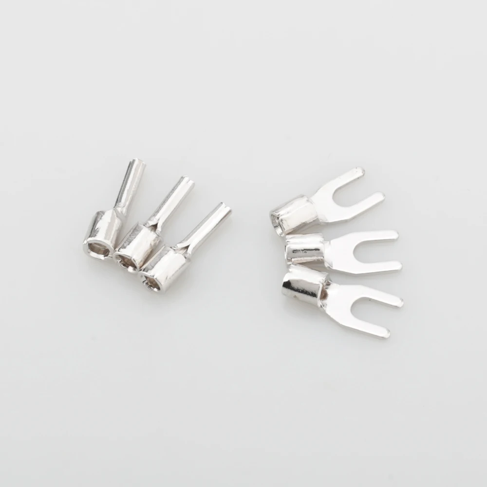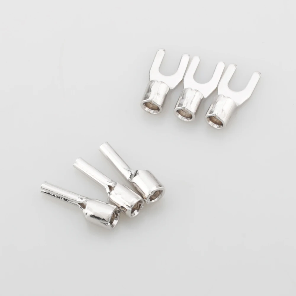 Enhance your high-end audio or power setup with this premium set of six power connectors, featuring three rhodium-plated pure copper banana plugs and three spade terminals. Each connector measures 19mm in length with a 3.3mm wire hole diameter, offering exceptional conductivity and durability. The banana plugs showcase a sleek, polished metallic finish with U-shaped forked tops and cylindrical bases, while the spade terminals feature flat, forked U-shapes with straight, parallel prongs ending in rounded tips. Designed for precise high-performance connections, these connectors are compatible with US, IEC, and 20A IEC power systems, making them an essential upgrade for discerning enthusiasts.