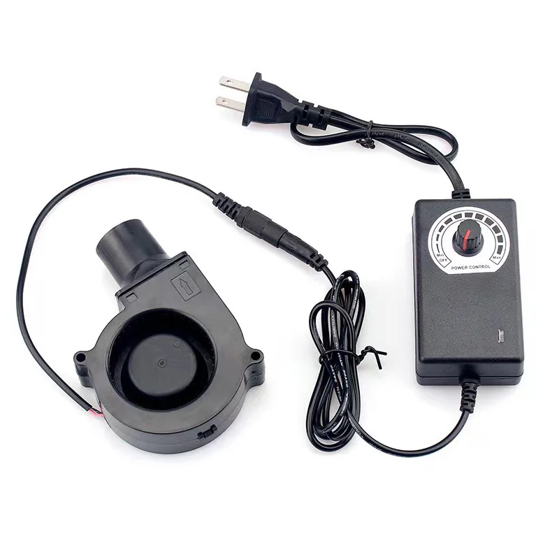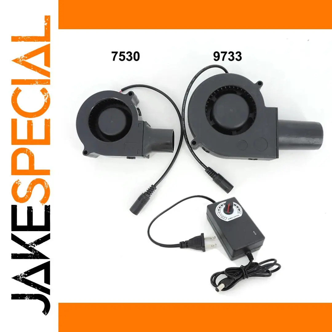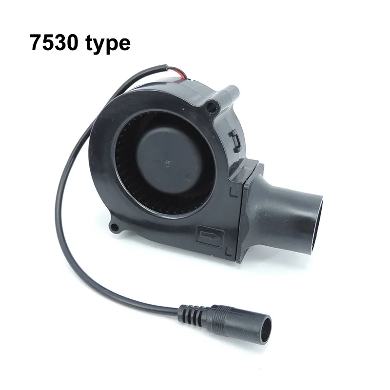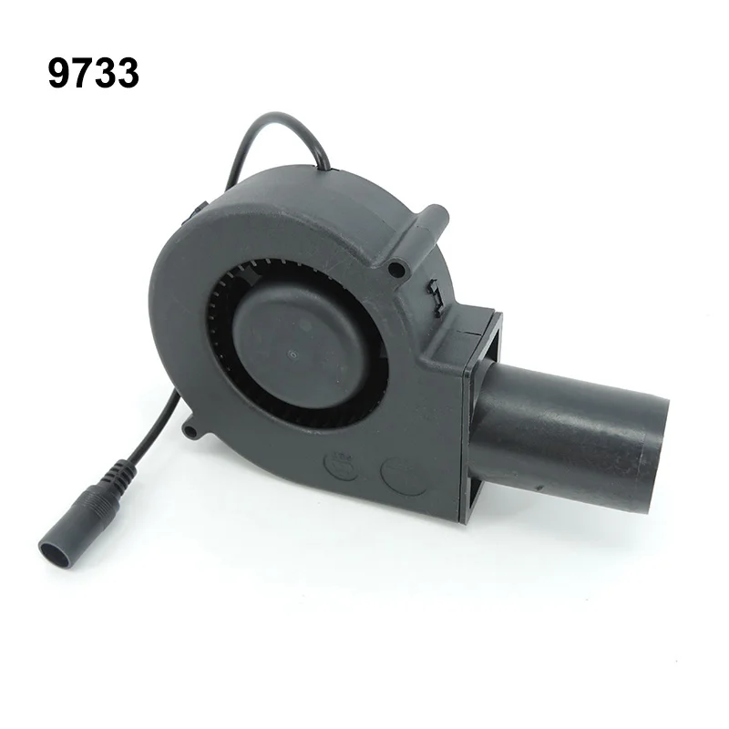 Experience reliable airflow with these high-quality blower fans available in models 7530 and 9733, both reaching up to 4000 RPM. Equipped with brushless DC motors rated at 12V DC, they deliver current options of 1.2A (14W), 1.88A (12.9W), and 2.0A (19W). Built with durable ball bearings, these compact fans feature a sleek black plastic housing with vented design and cylindrical outlets, ideal for barbecue grills, wood stoves, picnic setups, and DIY projects. Powered by AC input (100-240V) with compatible EU or US power supplies, they offer safe, long-lasting performance suited for various applications.