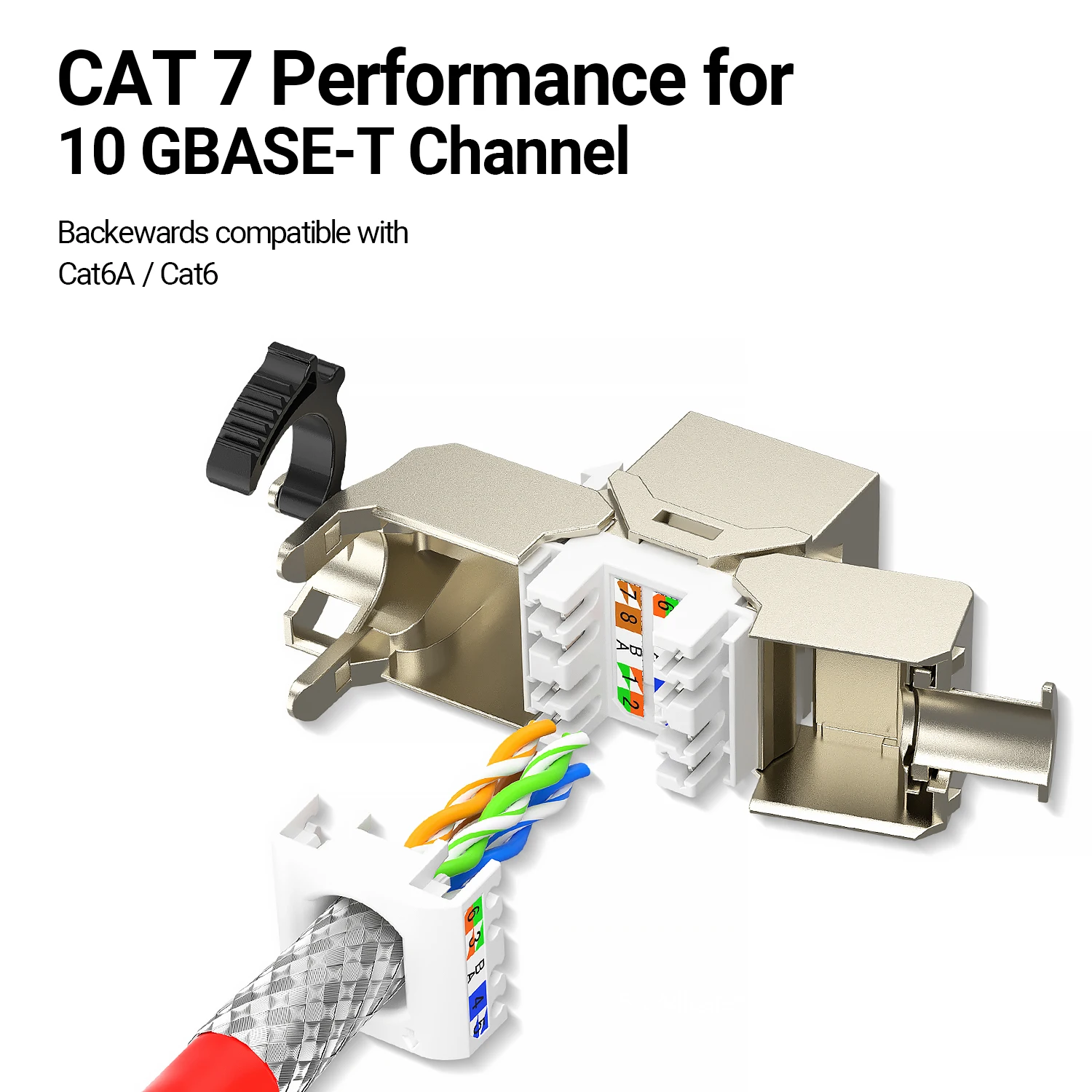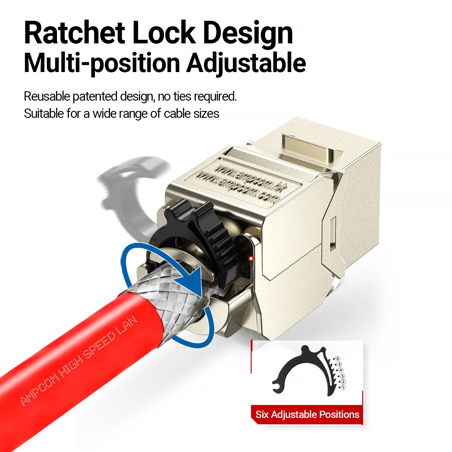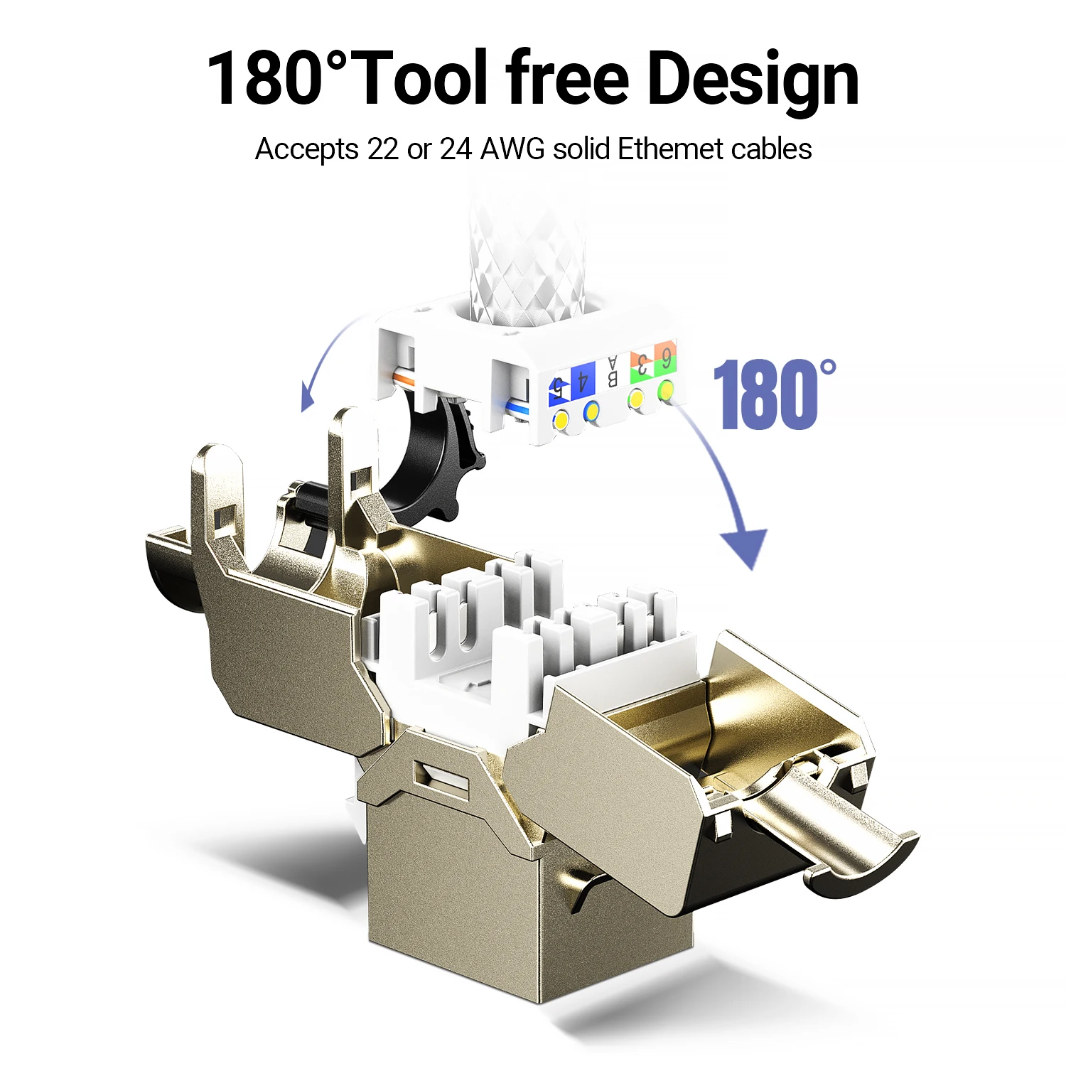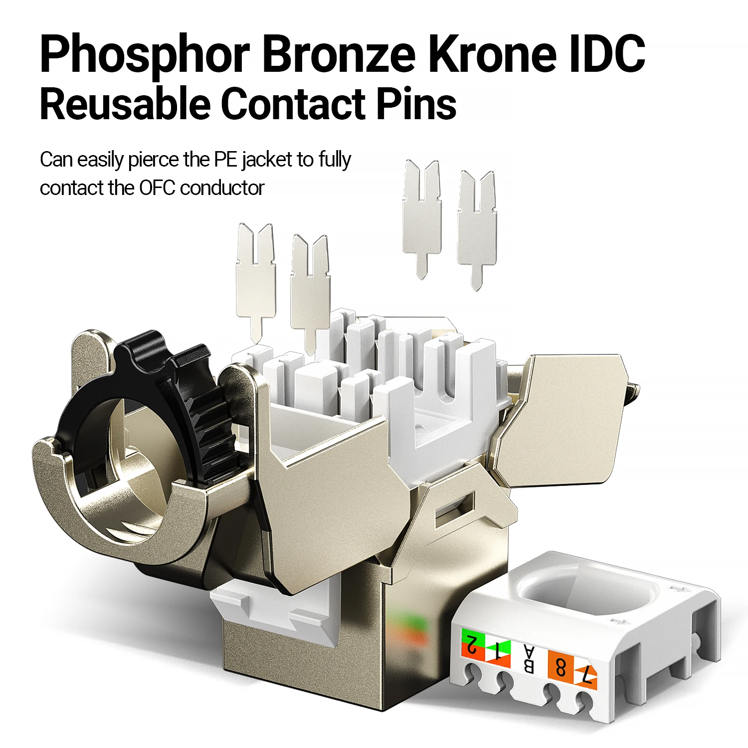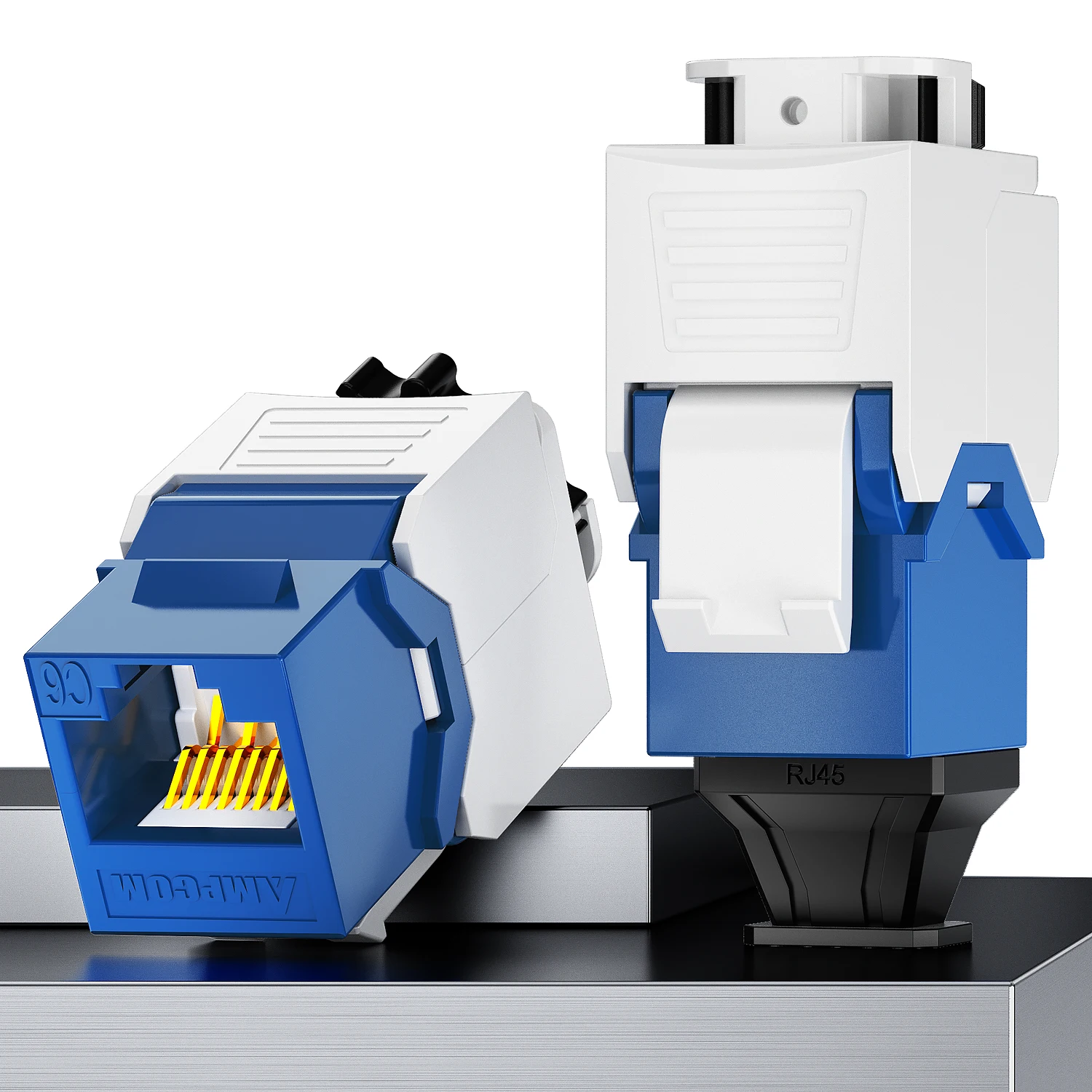 This high-performance RJ45 Keystone Jack supports 10Gbps network speeds with a durable, flame-retardant ABS housing available in multiple color options including black, white, gray, and blue. Featuring a tool-free, quick installation process with a ratchet lock and adjustable locking clip, it ensures a secure, reliable connection. Equipped with 50U gold-plated pins that resist oxidation and pull-out, it guarantees long-lasting, stable contact even in harsh environments. Compatible with 22-24 AWG cables, and supporting wiring standards 568A/568B, this module is ideal for high-frequency, high-speed networks, offering precise wiring and minimal crosstalk for optimal signal integrity.