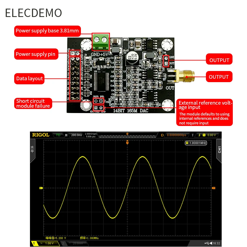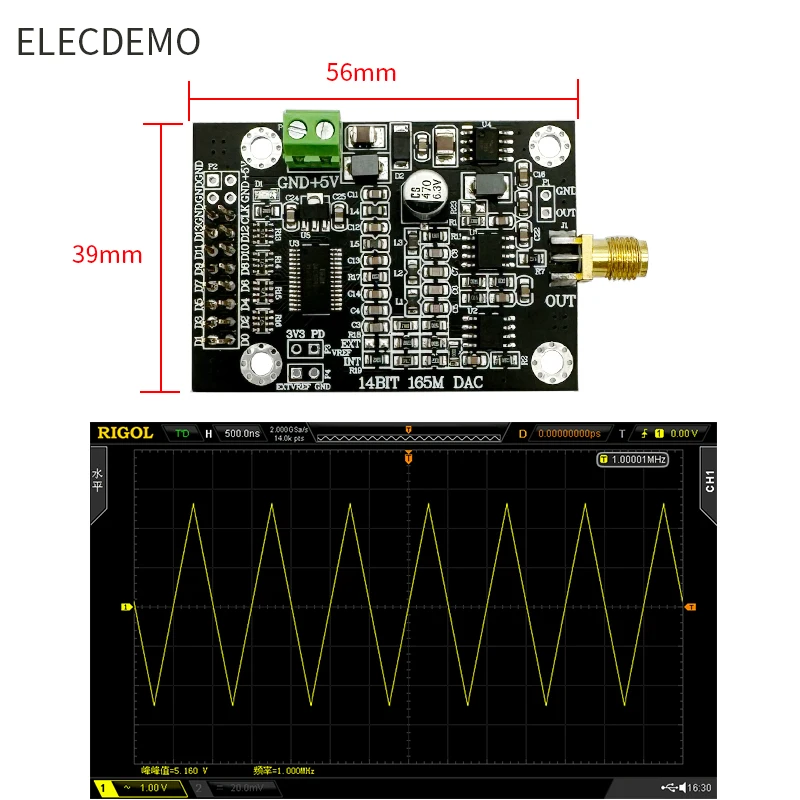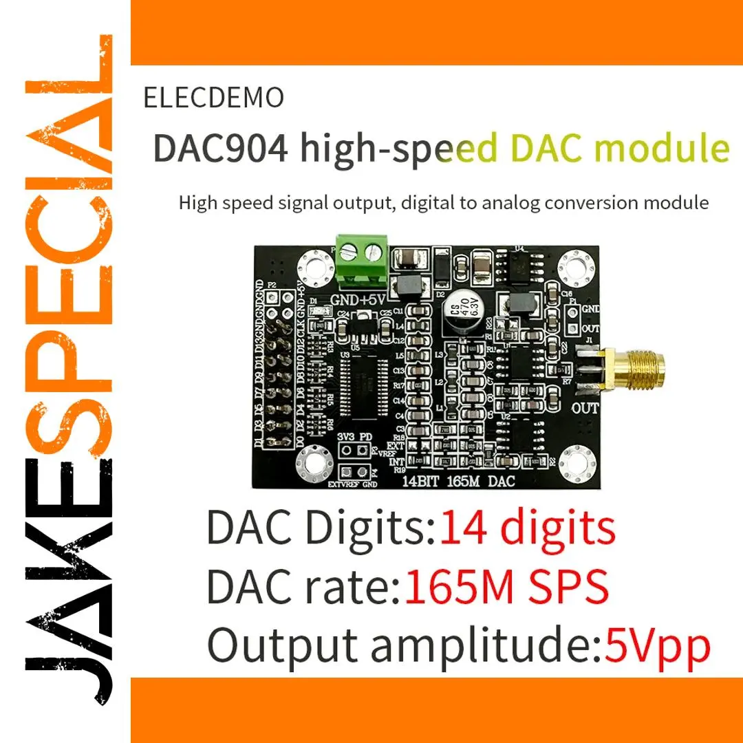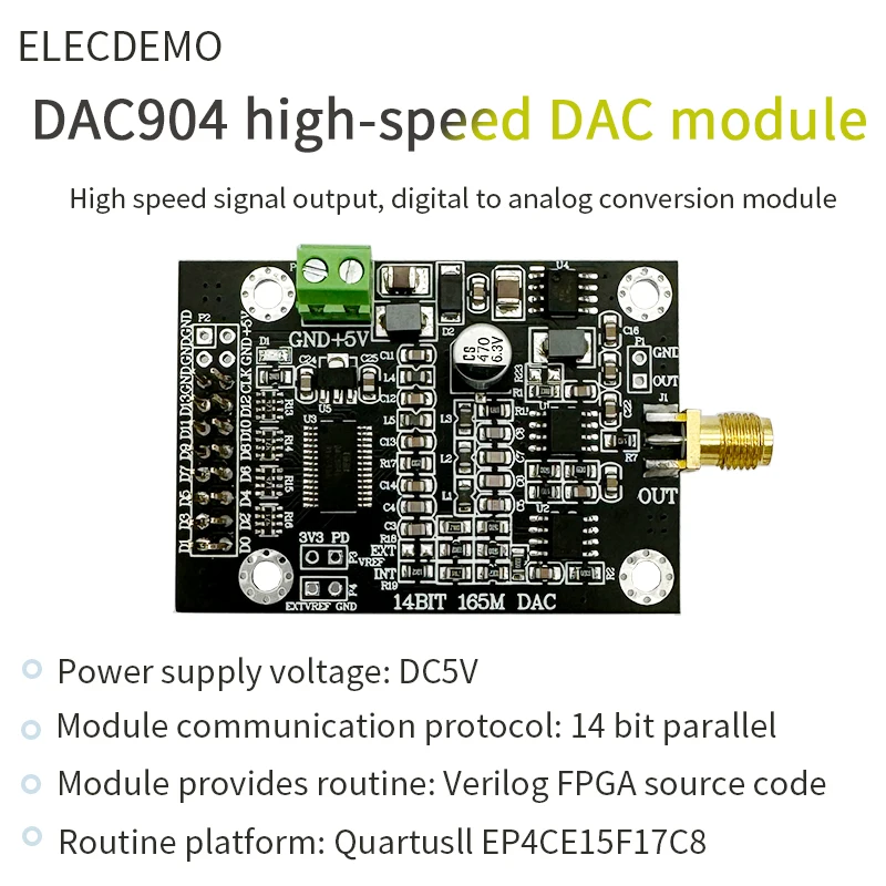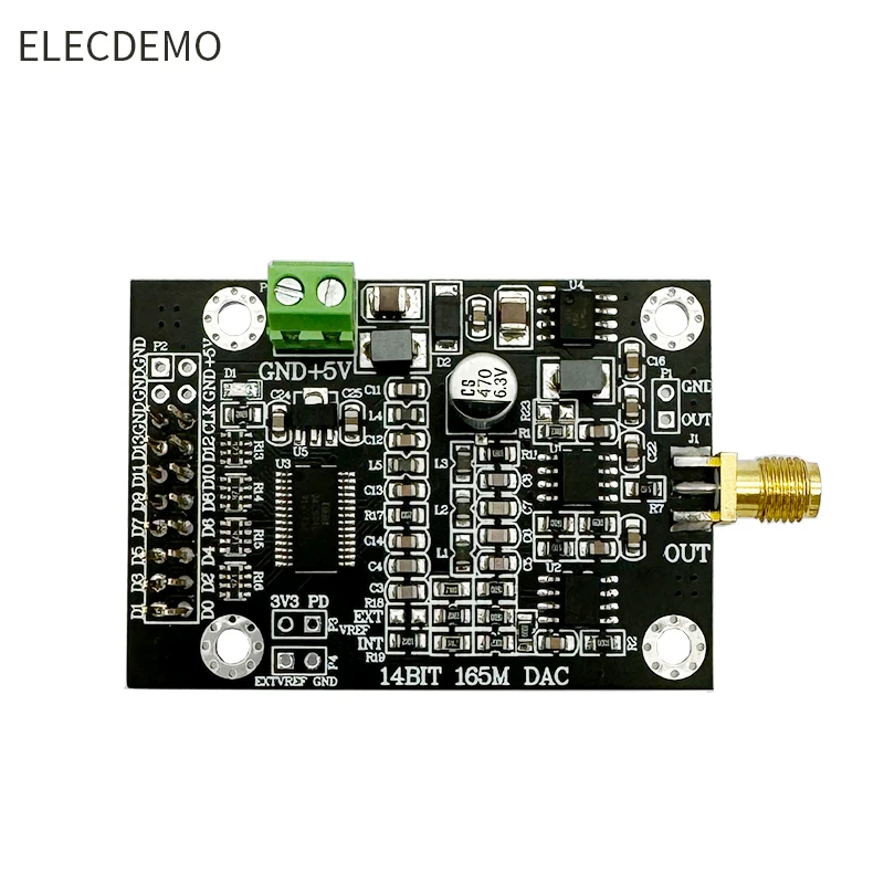 Elevate your FPGA development projects with this high-performance waveform generator, featuring a 14-bit parallel input and a 165 million samples per second sampling rate, specifically designed for the DAC904 high-speed digital-to-analog converter module. Its sleek, black rectangular PCB showcases a dense layout with green terminal blocks labeled GND and +5V, a gold SMA connector for output, and surface-mounted components including capacitors, resistors, diodes, and voltage regulators. White labels indicate key functions and connections, providing clarity for precise signal generation. This sophisticated, compact accessory offers exceptional precision and reliability for advanced digital-to-analog conversion applications.