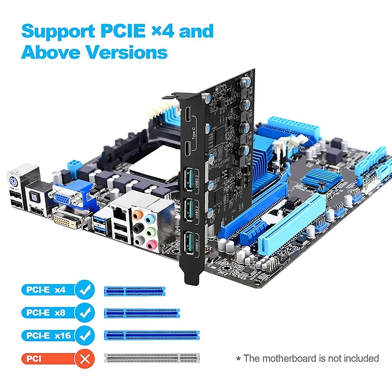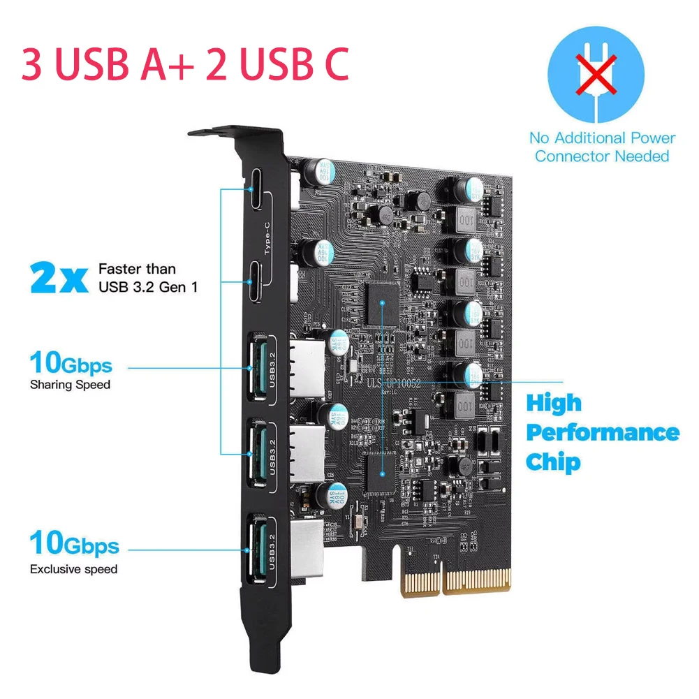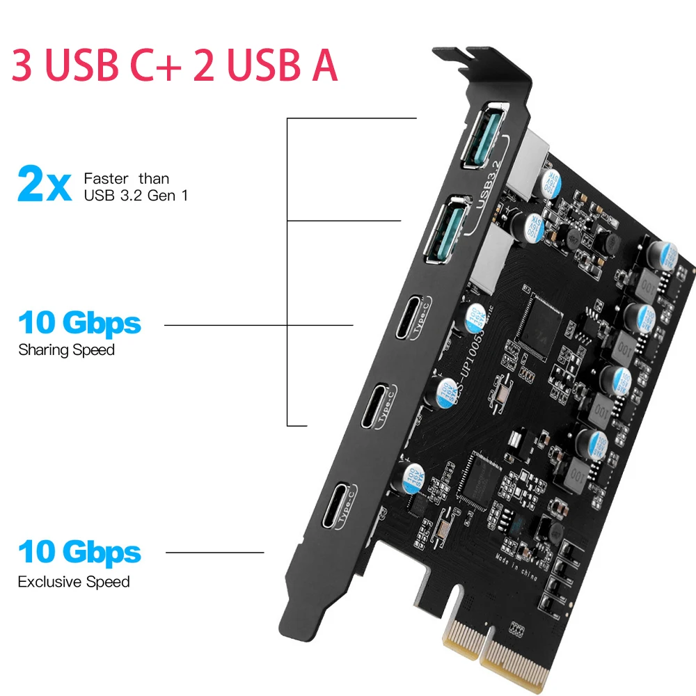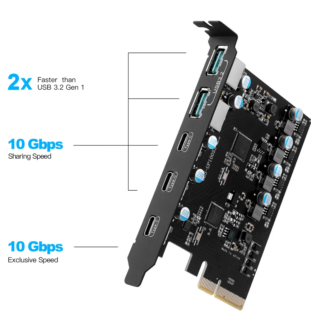 - Provides three USB 3.2 Gen 2 Type-A ports and two Type-C ports, supporting transfer speeds up to 10 Gbps per port for rapid data exchange. Supported by PCIe x4 interface for optimal performance.