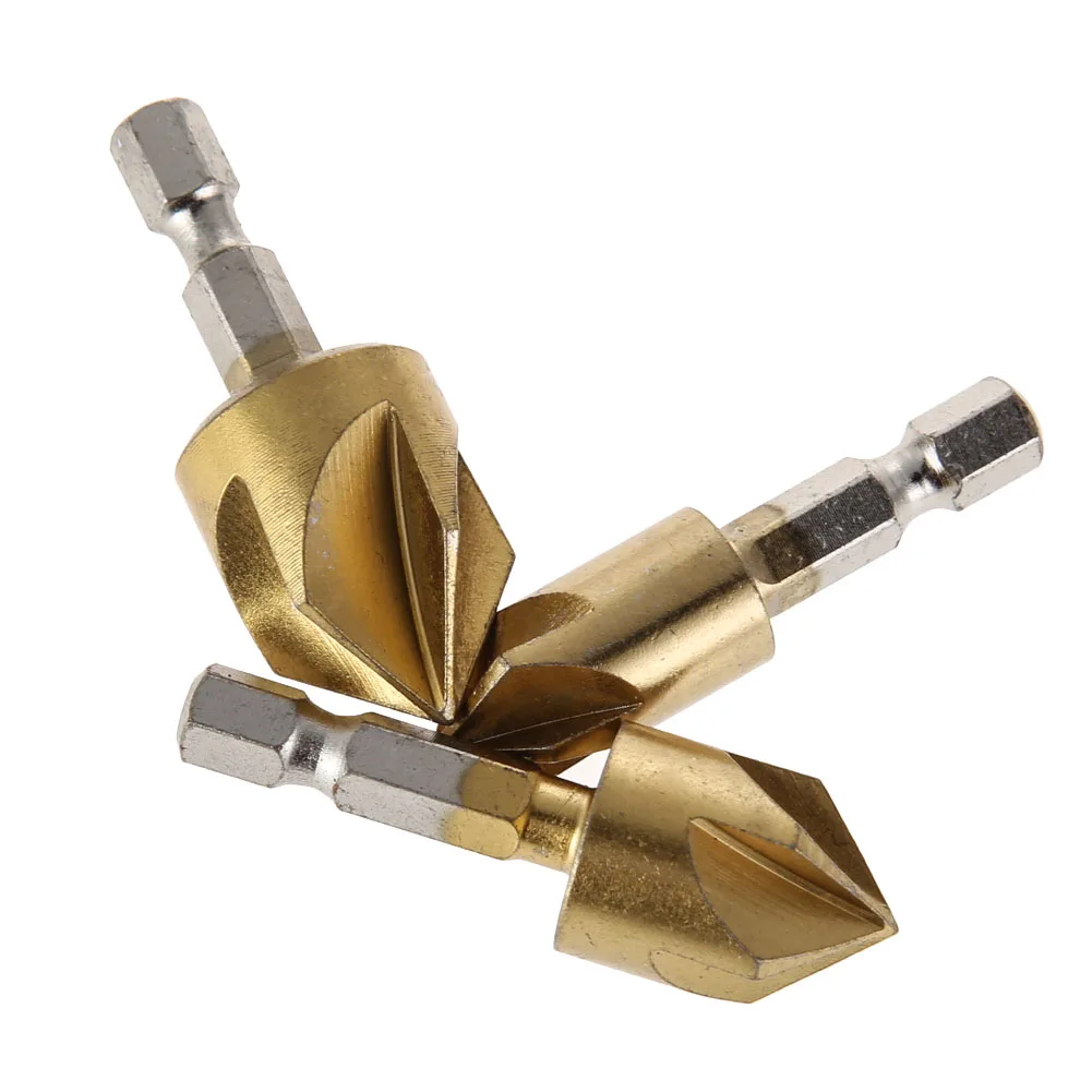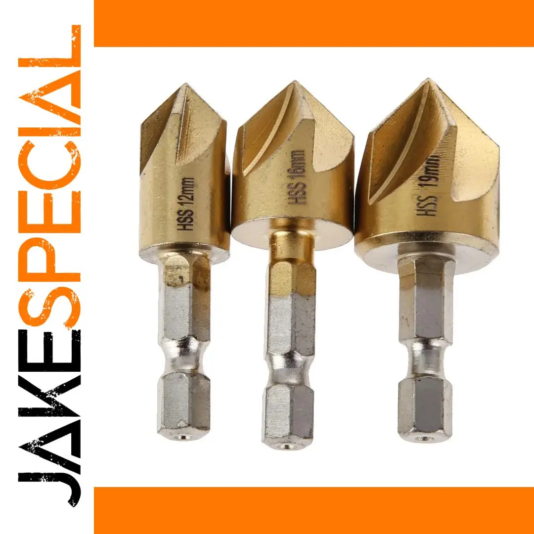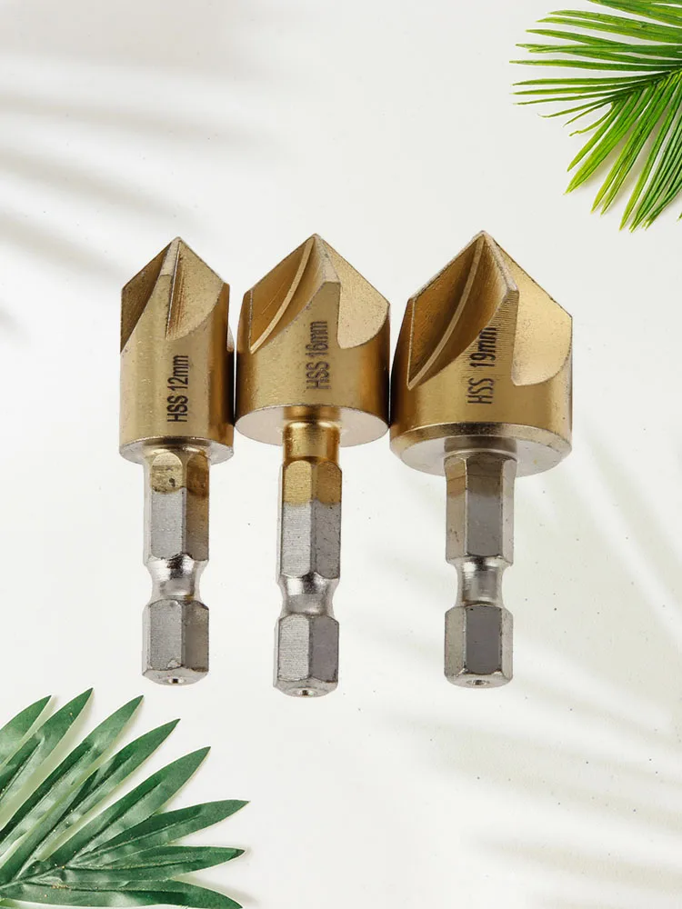 Imagine achieving flawless countersink, chamfer, and deburring results with ease and confidence. This dedicated three-piece countersink drill bit set is meticulously crafted from high-speed steel, ensuring durability and precision for all your woodworking and metalworking projects. The bright gold-colored, conical cutting heads feature a 90-degree tip angle and five flutes for efficient material removal, providing smooth, clean cuts every time. With sizes of 12mm, 16mm, and 19mm, these bits adapt to various applications, including drilling into wood, plastic, and aluminum. The robust 1/4-inch hex shank guarantees secure tool grip, compatible with all standard power drill chucks. Elevate your craftsmanship by choosing these professional-grade bits built to last through demanding tasks and multiple uses.