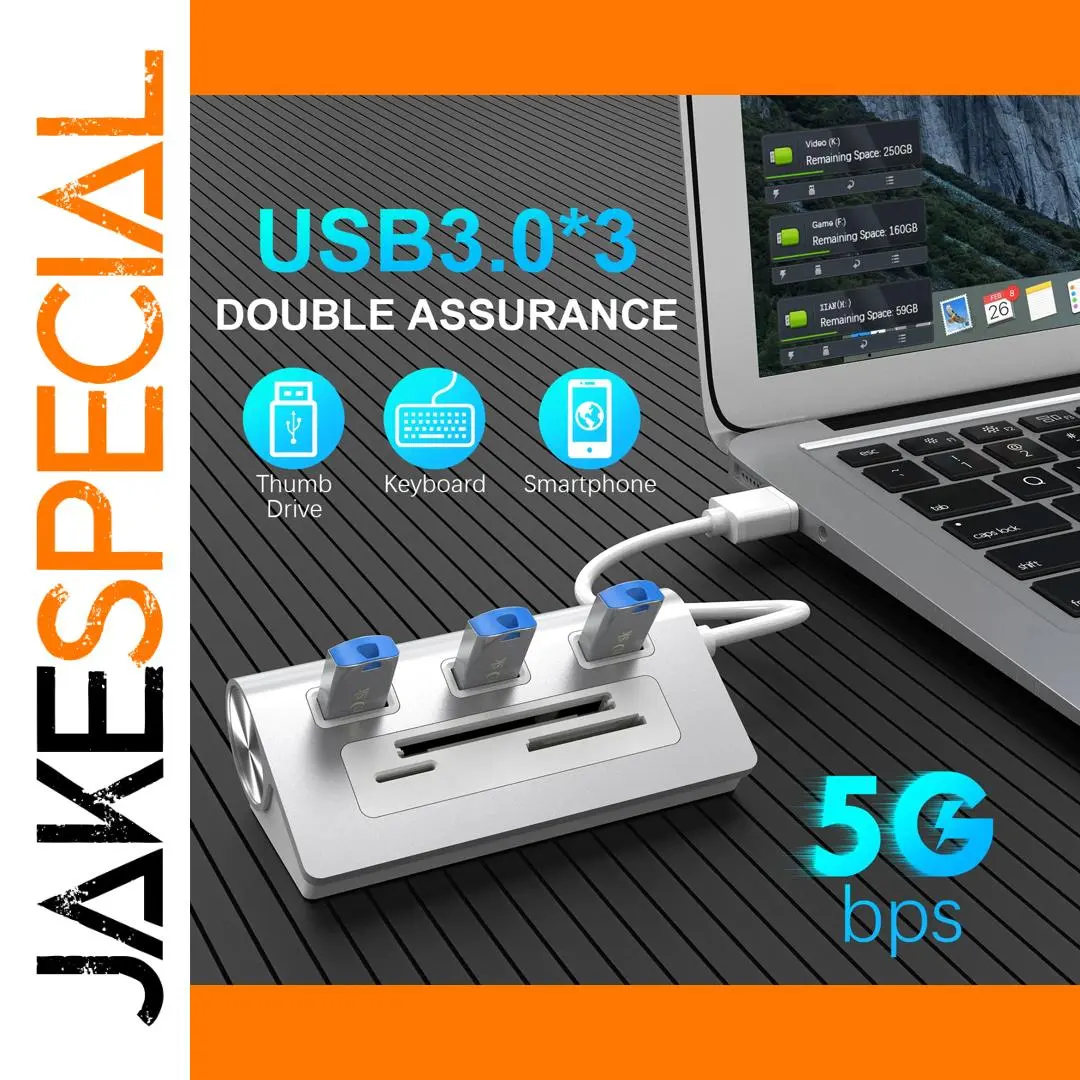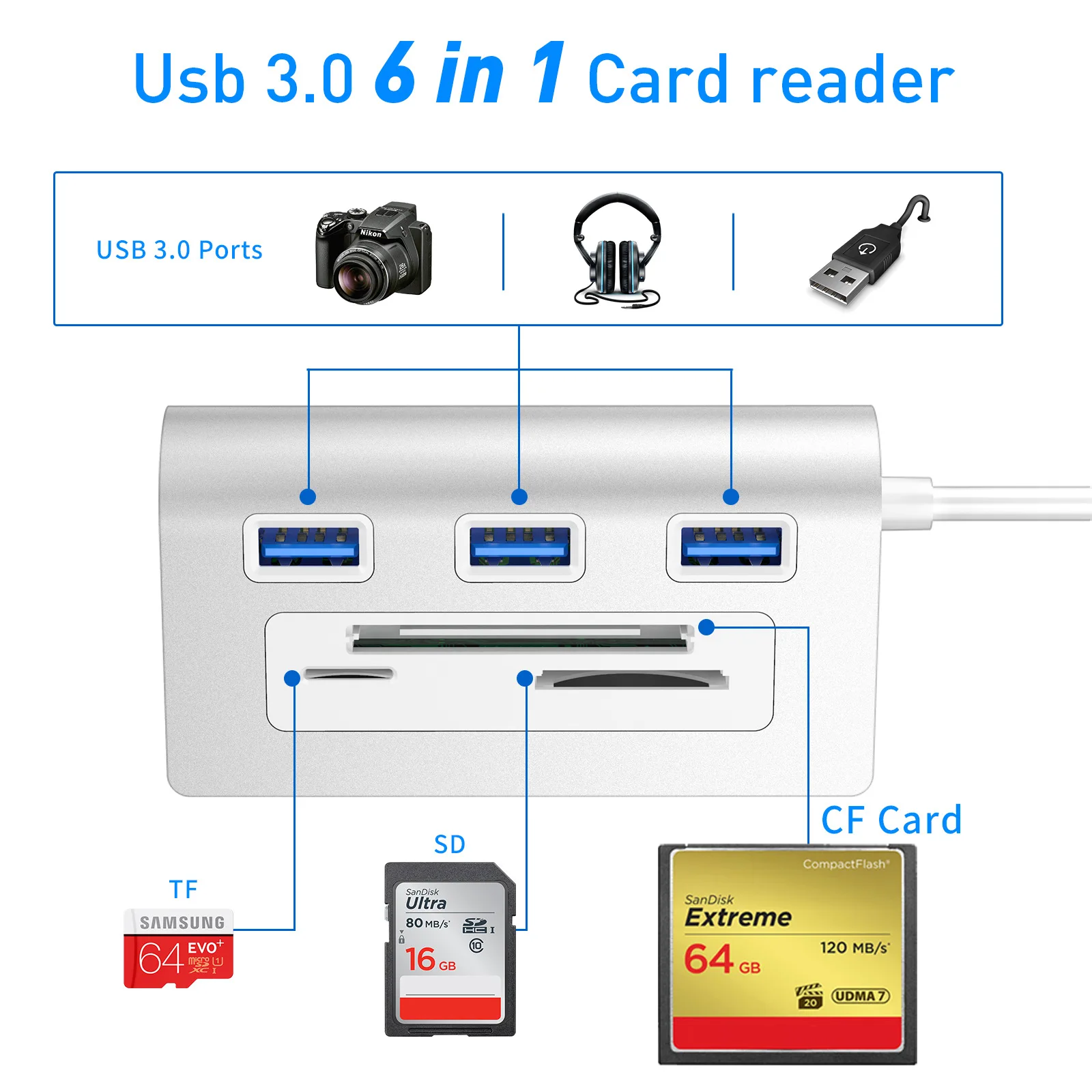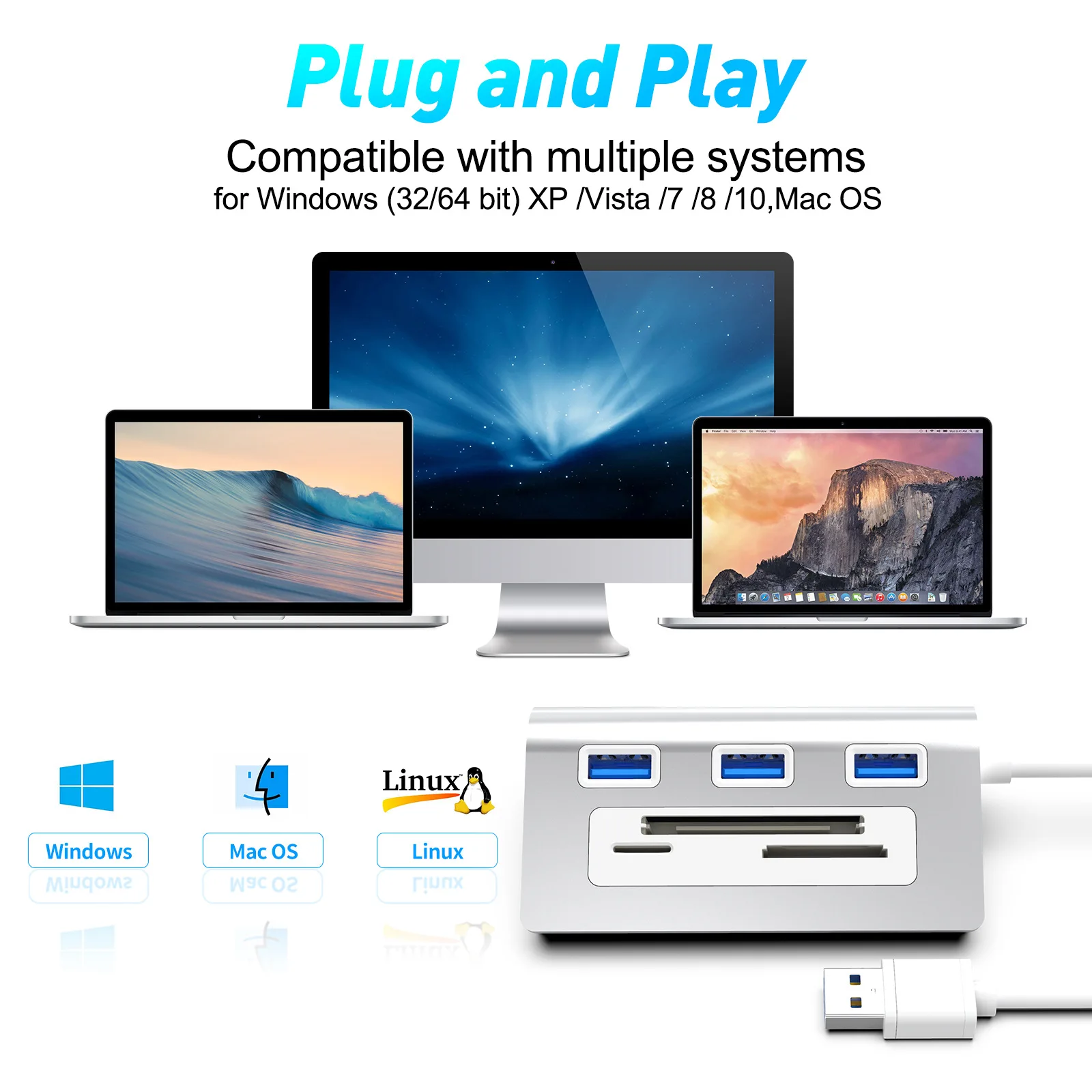 Experience seamless connectivity with this this sleek USB 3.0 card reader hub, designed to elevate your digital workspace. Its modern metallic finish and minimalist design blend perfectly with Apple-style aesthetics, making it an excellent addition to Mac or Windows systems. The hub features three USB 3.0 ports for ultra-fast data transfer speeds, up to 5 Gbps, and is backward compatible with USB 2.0 and 1.1 devices. It offers full compatibility with various memory cards, supporting SDXC (up to 2TB), SDHC, SD, Micro SDXC, Micro SDHC, and Micro SD cards, making data access effortless. Powered by USB, it boasts plug-and-play operation with hot swapping, ideal for reducing workspace clutter while maintaining high efficiency. Its compact size and sleek metallic design enhance both aesthetics and practicality, providing a professional and stylish data transfer solution for both casual and professional users alike.