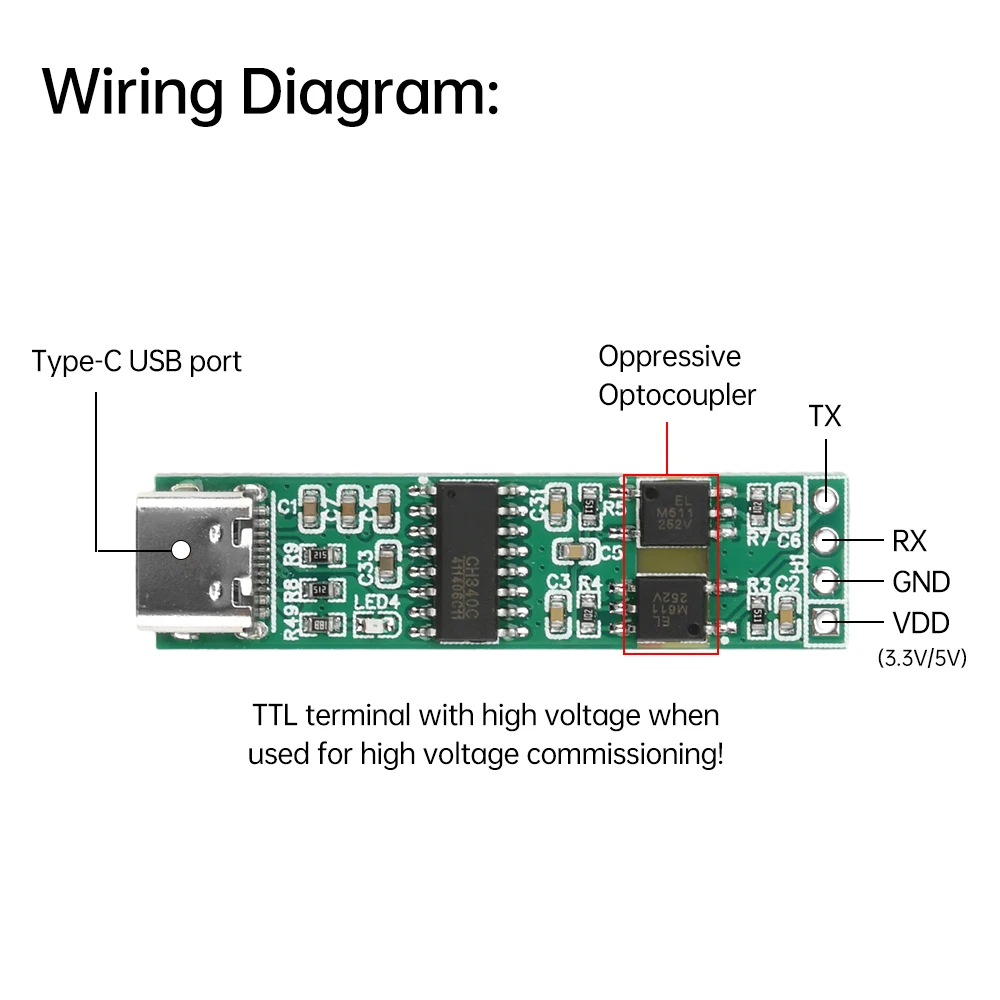 Experience seamless and secure data transfer with this high-speed USB to TTL serial port module. Designed with precision, it features a vibrant green PCB that highlights its modern, professional aesthetic. The sleek, rectangular shape measures just 44mm by 11mm, making it extremely compact and easy to incorporate into various projects. Equipped with a durable Type C interface supporting 3.3V and 5V voltages, it offers effortless connection to newer computers. The module uses two high-speed optocouplers to ensure electrical isolation exceeding 600V, providing protection against high-voltage environments. Its functional design emphasizes reliability, safety, and ease of use, making it an indispensable tool for circuit debugging, control chip testing, or high-voltage equipment maintenance. With meticulous component placement, this module reflects a perfect balance of technical precision and minimalist aesthetic.
