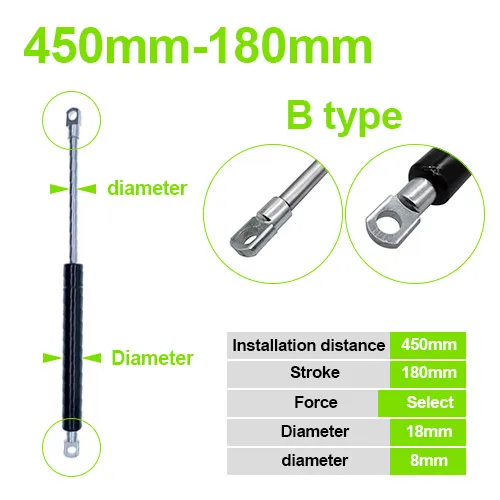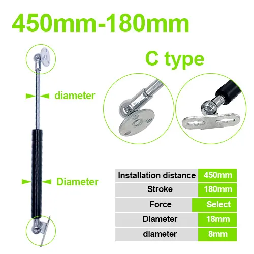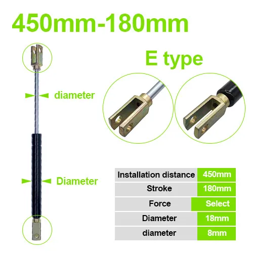 Experience seamless lifting support with this sleek, metallic folding hinge designed for durability and precision. Crafted with a slender, shiny silver finish, it combines modern industrial style with functional strength. Each hinge features a robust black coating on the middle section, enhancing grip and protection, while the various end fittings cater to diverse mounting needs. The hinges are ideal for applications requiring controlled movement and support up to 50kg. With a stroke length of 180mm and a hole center distance of 450mm, you can confidently incorporate these hinges into your furniture, machinery, or custom projects. The precise engineering ensures smooth operation and long-lasting performance, making this a reliable choice for demanding environments.