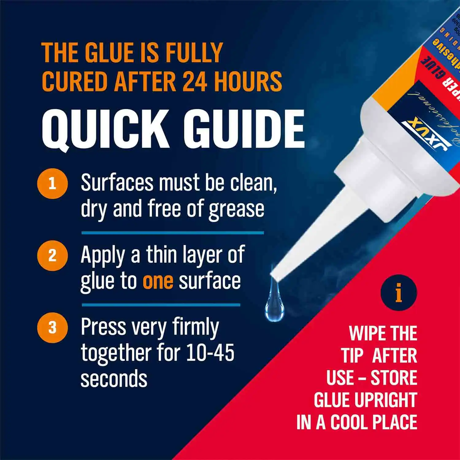 Once you've experienced the reliability and ease of this high-strength adhesive, you'll wonder how you ever managed without it. Perfect for repairs, craftsmanship, and DIY projects, this glue offers the perfect combination of speed, strength, and precision. Keep a bottle handy in your toolbox or workspace to address urgent fixes swiftly. Its proven performance across various materials makes it an indispensable addition to your collection of tools. Trust in JXVX’s reputation for quality, and enjoy effortless bonding on your next project.