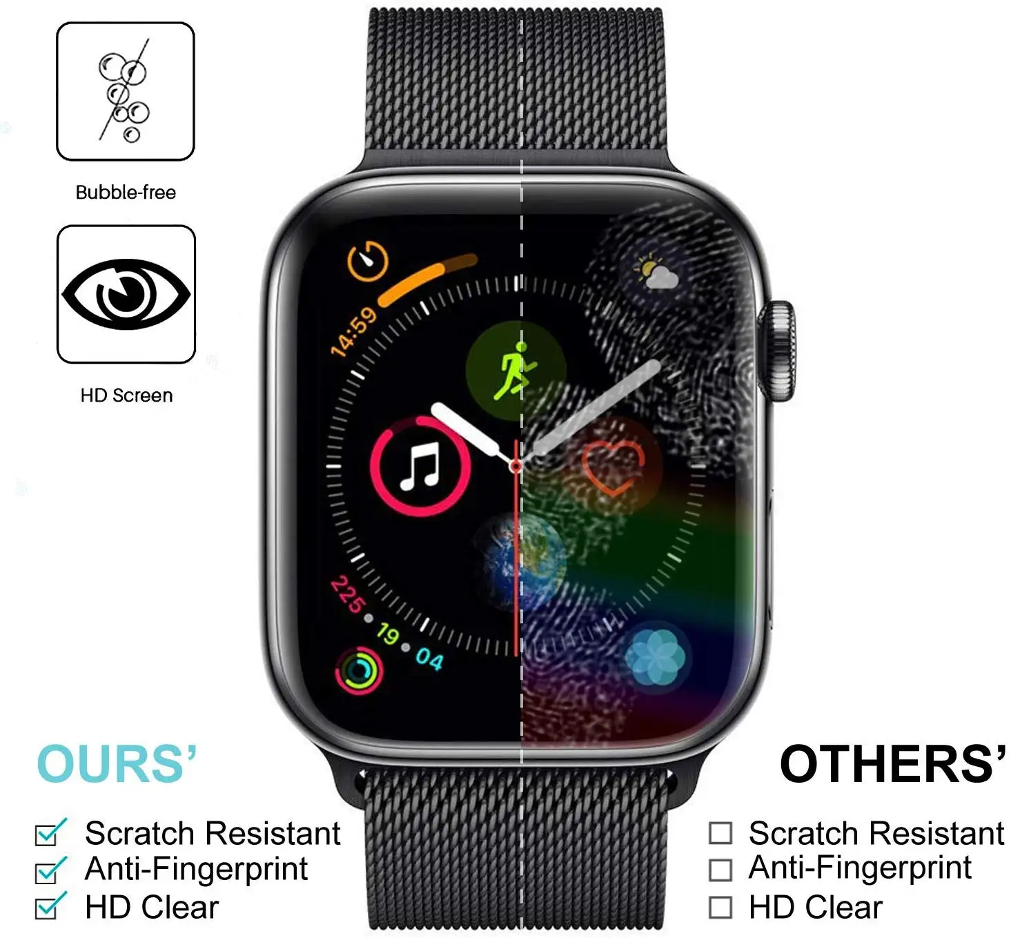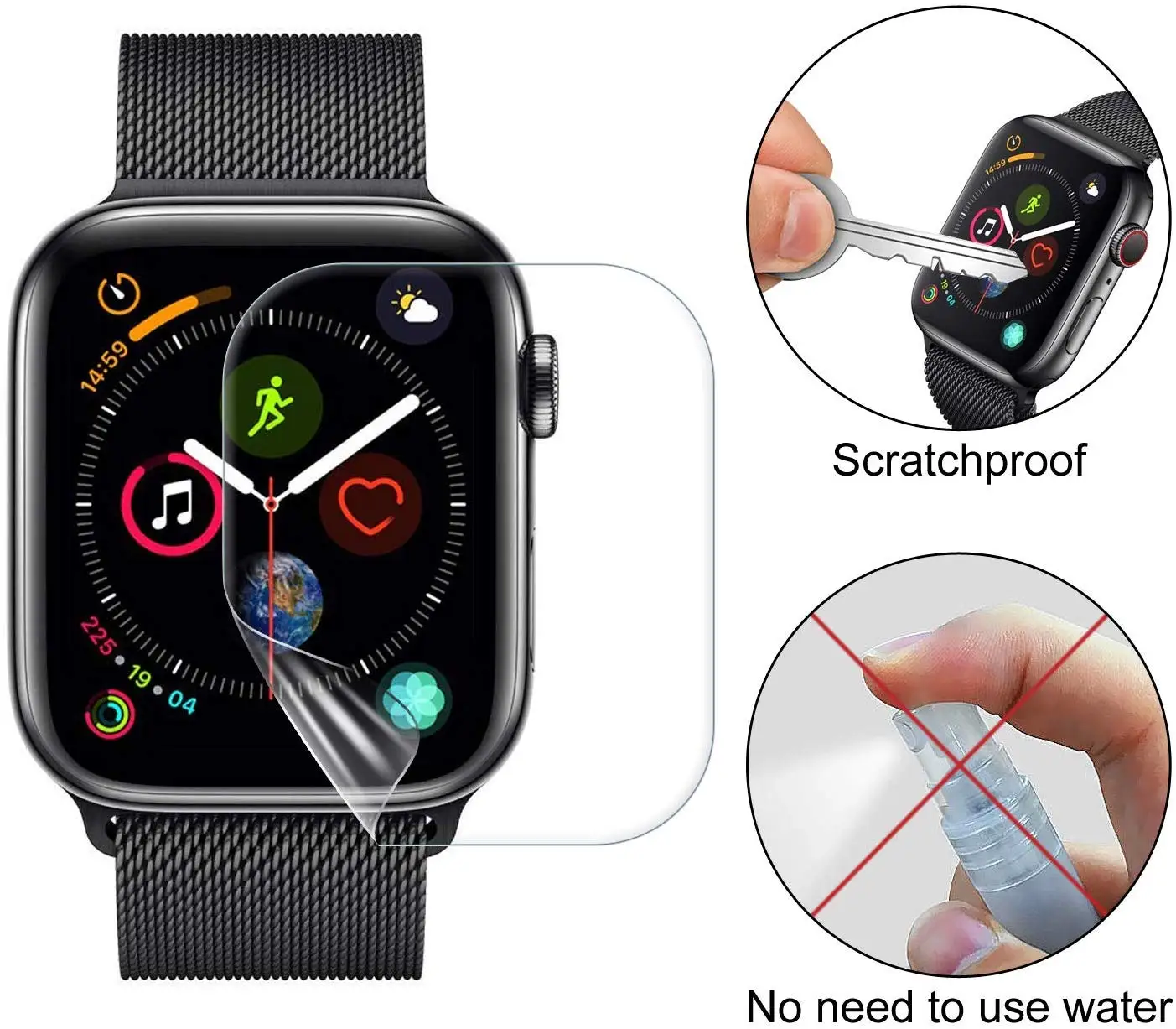 Enhance your Apple Watch with our high-quality screen protector set, compatible with models 38mm, 39mm, 40mm, 42mm, 44mm, and SE versions, including Series 1 through 6. Made from soft TPU material, it offers HD clarity, anti-scratch, and anti-shock properties for maximum durability. The protectors are precisely cut with curved edges to fit snugly and enable bubble-free installation, providing comprehensive coverage and impact resistance. Available in sets of 2 or 5, these protectors are designed for easy application and long-lasting protection, making them an ideal choice for maintaining your watch’s sleek appearance and functionality.