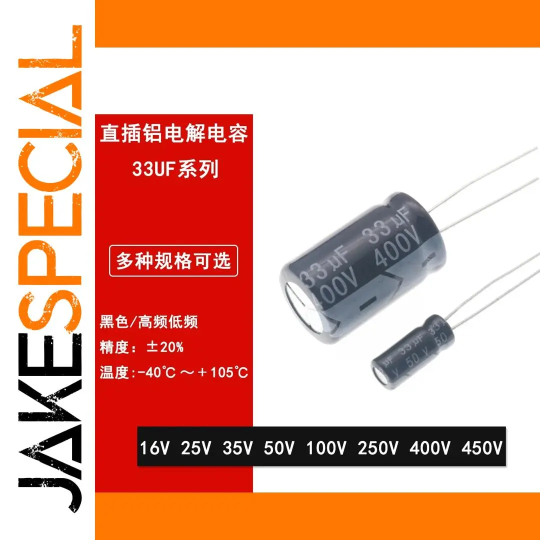 Enhance your electronic projects with this high-frequency in-line aluminum electrolytic capacitor, available in varying voltage ratings from 16V to 450V and capacitance of 33μF. Designed with a sleek, cylindrical black matte body featuring crisp white text for clear specifications, it offers reliable performance in high-frequency applications. Dimensions range from 13x20mm for 250V and 13x21mm for 400V models, with quantities available from 5 to 50 pieces per specification. The straight, metallic leads ensure easy installation, making it ideal for DIY or professional electronic repairs. Crafted without specific chemical compositions, this durable component promises consistent, trustworthy operation for your circuits.