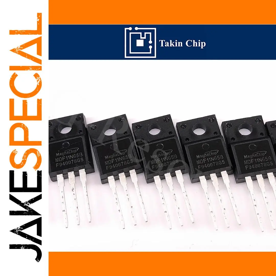 Experience reliable power switching with the original MDF11N65BTH N-channel MOSFET, featuring a 650V voltage rating and 11A current capacity. Encased in a durable TO-220F through-hole package, this component exhibits a sleek matte black finish with white printed markings, including the model number and manufacturing codes. Its design includes a prominent circular mounting hole at the top and three evenly spaced silver leads for secure circuit integration. Perfect for high-voltage applications, this new device offers consistent performance and easy installation, ensuring your electronic projects operate efficiently with a trustworthy, high-quality power semiconductor.