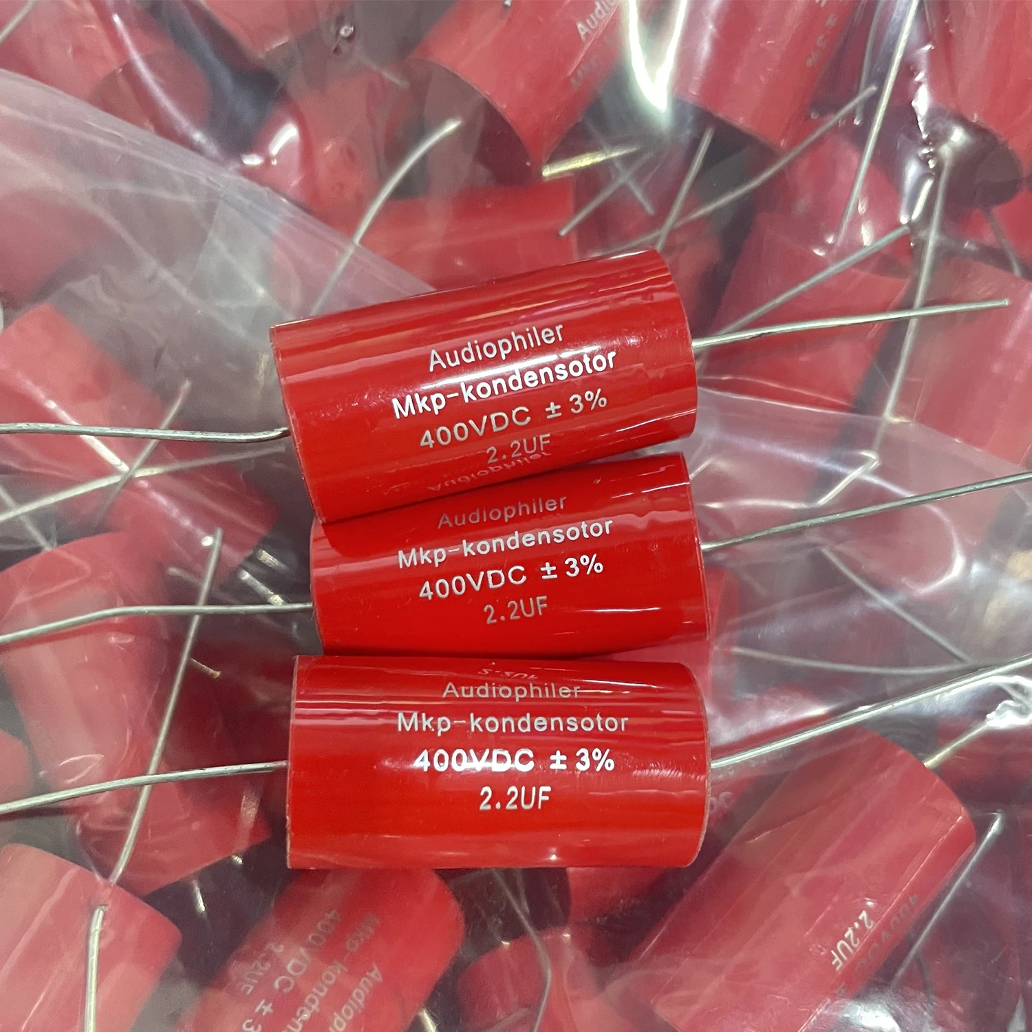 - Set of 10 polypropylene film axial capacitors, 2.2μF capacitance, rated at 400V DC with ±3% tolerance, for consistent and reliable high-voltage performance in audio applications.