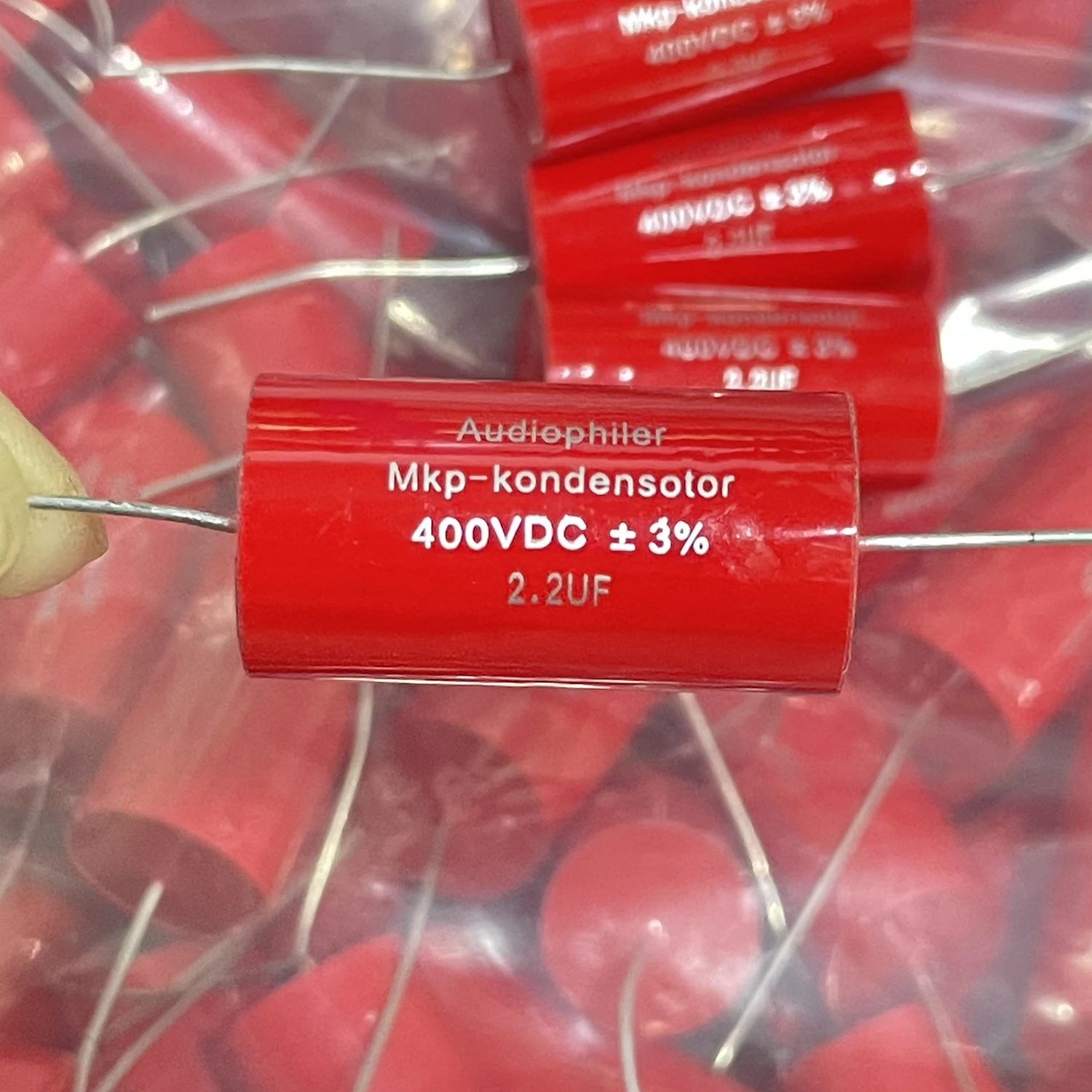 Experience the reliability and quality of this set of ten polypropylene film axial capacitors, perfect for high-pressure audio and frequency dividing applications. Featuring a vibrant, glossy red finish, each capacitor is meticulously designed with a compact size of approximately 31mm in length and 16mm diameter, ensuring easy installation in tight spaces. With a rated voltage of 400V DC and a tolerance of ±3%, these capacitors guarantee performance and durability under demanding conditions. The copper lead terminals, designed as trimmer types, provide precise adjustments for your audio projects. Ideal for use in Hi-Fi audio circuits, their high temperature resistance of up to 105°C ensures stability and longevity. Elevate your audio setup with these high-quality, professional-grade capacitors, engineered for optimal sound fidelity and long-term reliability.