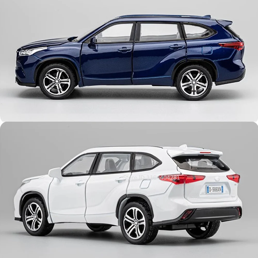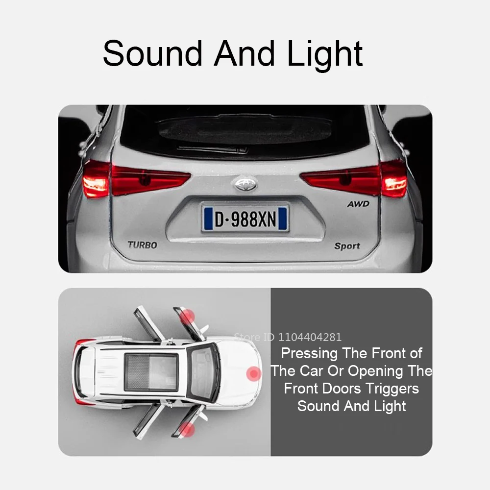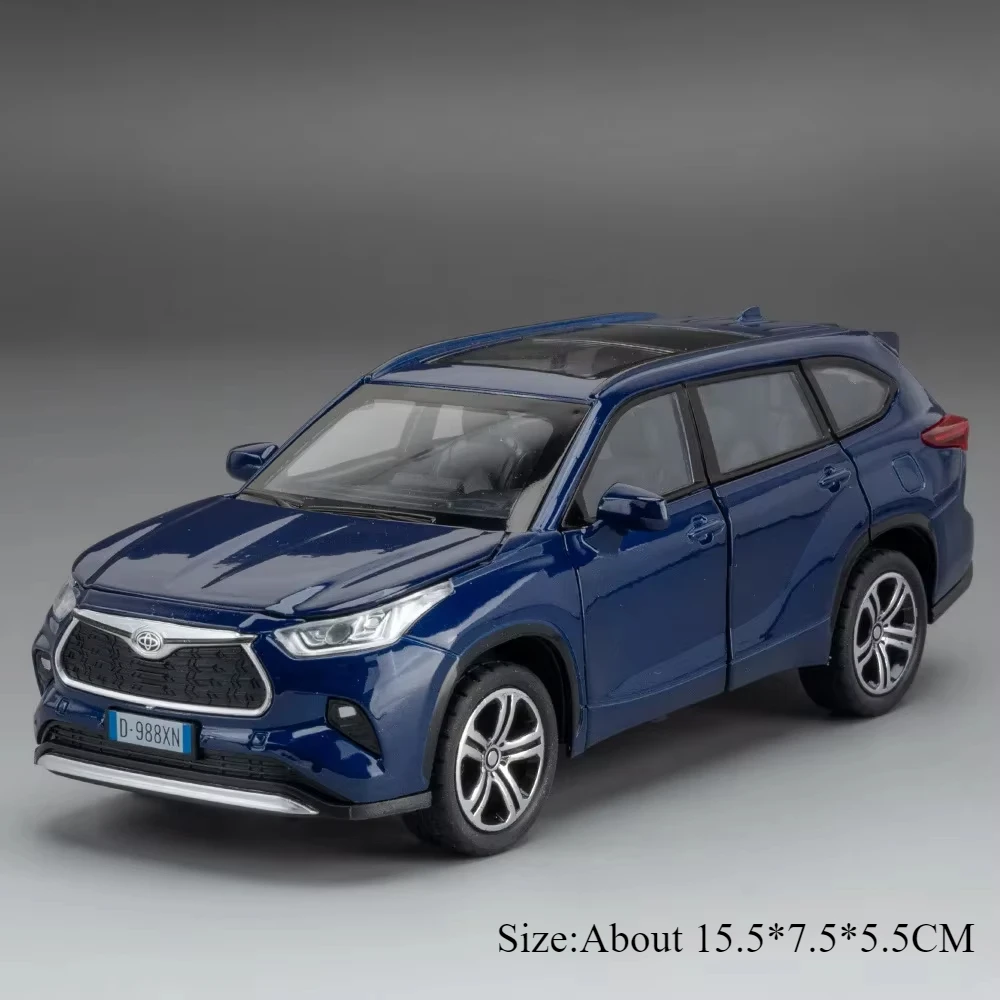 This 1:32 scale alloy diecast car model features a realistic metal body, functional opening doors, and includes sound and lighting effects with a pull-back motor for an engaging display or play experience. Measuring approximately 15.5 x 7.5 x 5.5 cm for the Highlander and 15.5 x 7 x 4.5 cm for the Corolla, it offers detailed multi-spoke rims, black rubber tires with silver accents, and a sleek, glossy finish in colors including Highlander Black, Blue, White, and Corolla Black, Red, White. Equipped with included batteries, this durable model is perfect for collectors, gifts, or display, designed for ages 14 and up.