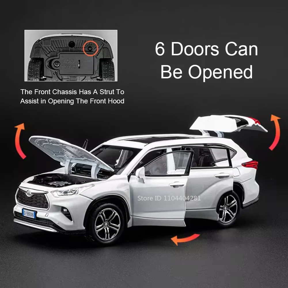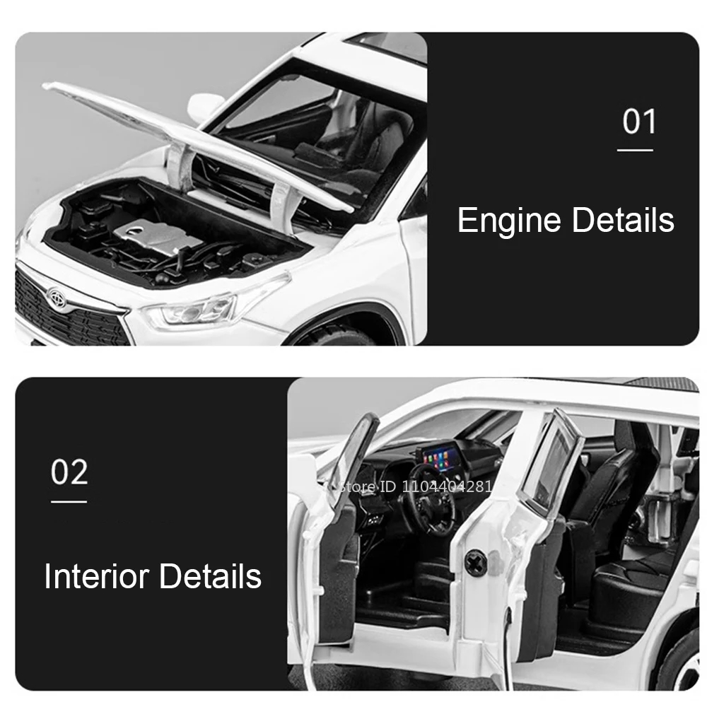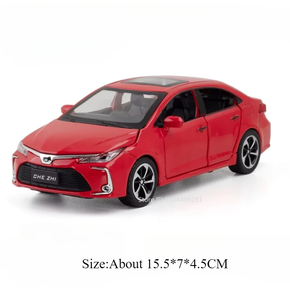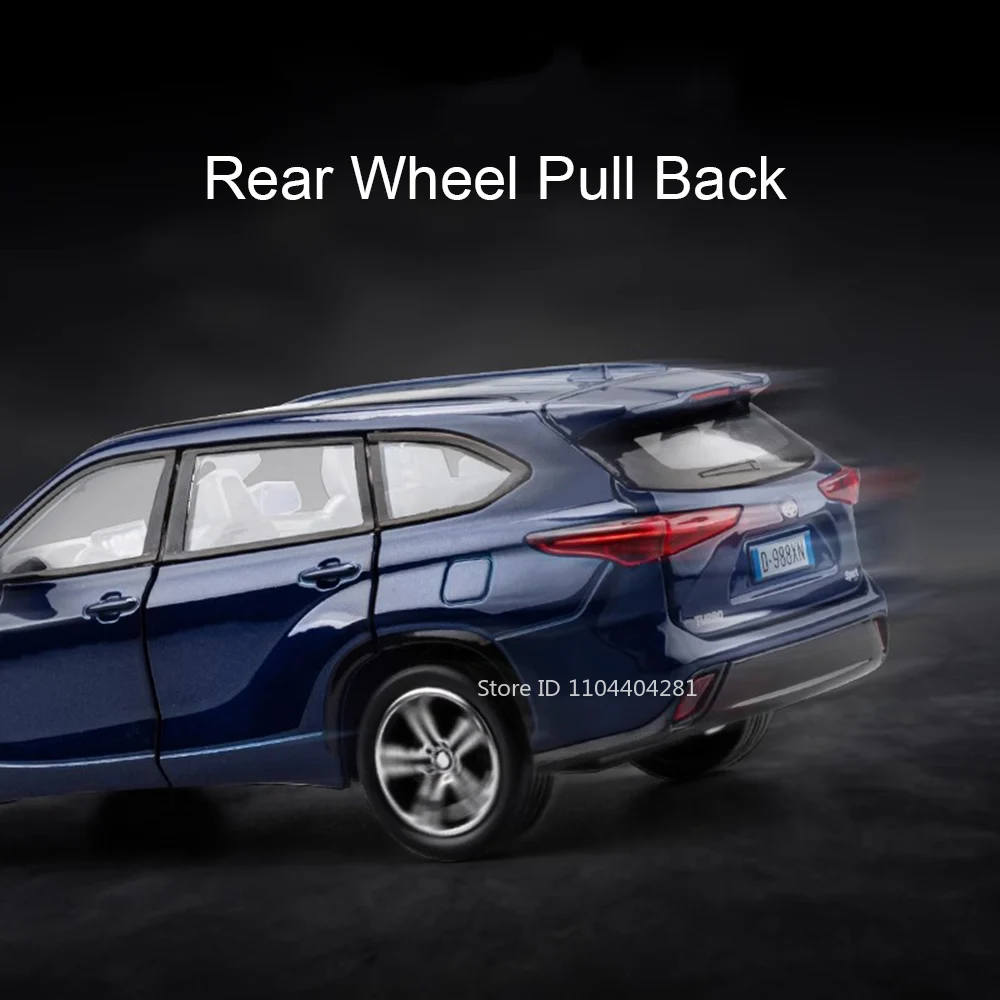 This 1:32 scale alloy diecast car model features a realistic metal body, functional opening doors, and includes sound and lighting effects with a pull-back motor for an engaging display or play experience. Measuring approximately 15.5 x 7.5 x 5.5 cm for the Highlander and 15.5 x 7 x 4.5 cm for the Corolla, it offers detailed multi-spoke rims, black rubber tires with silver accents, and a sleek, glossy finish in colors including Highlander Black, Blue, White, and Corolla Black, Red, White. Equipped with included batteries, this durable model is perfect for collectors, gifts, or display, designed for ages 14 and up.
