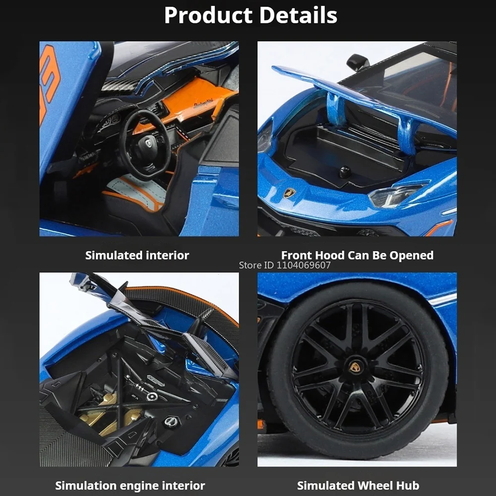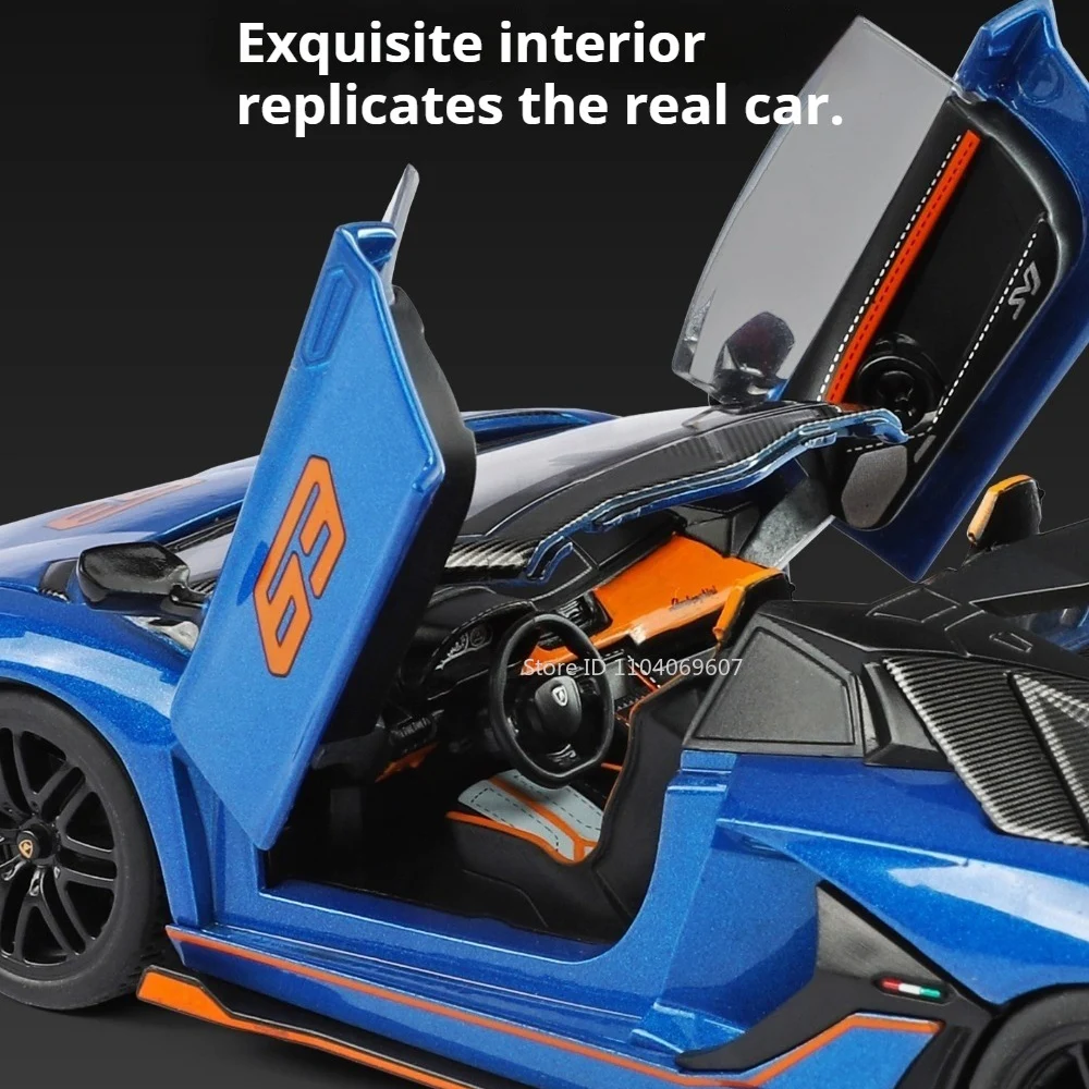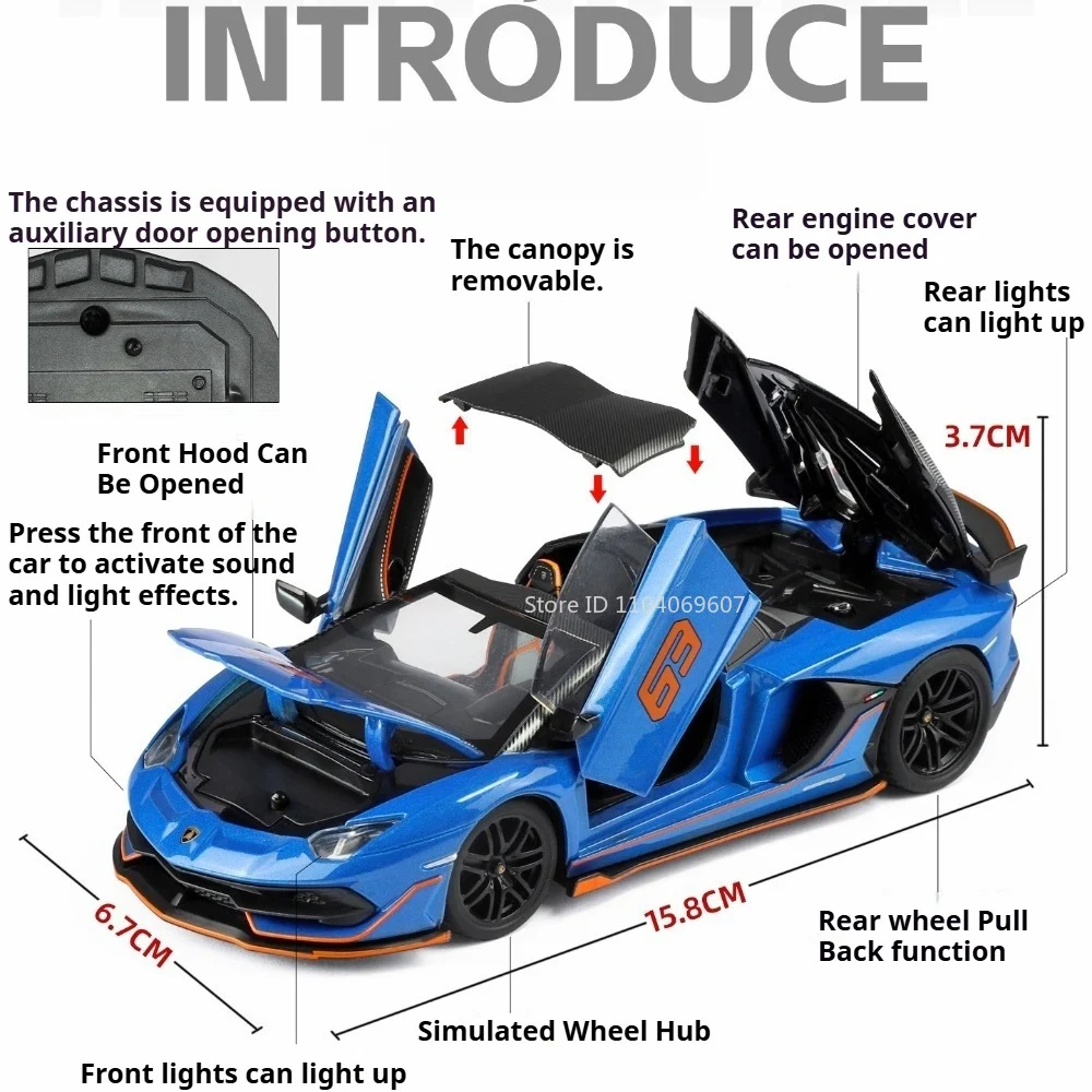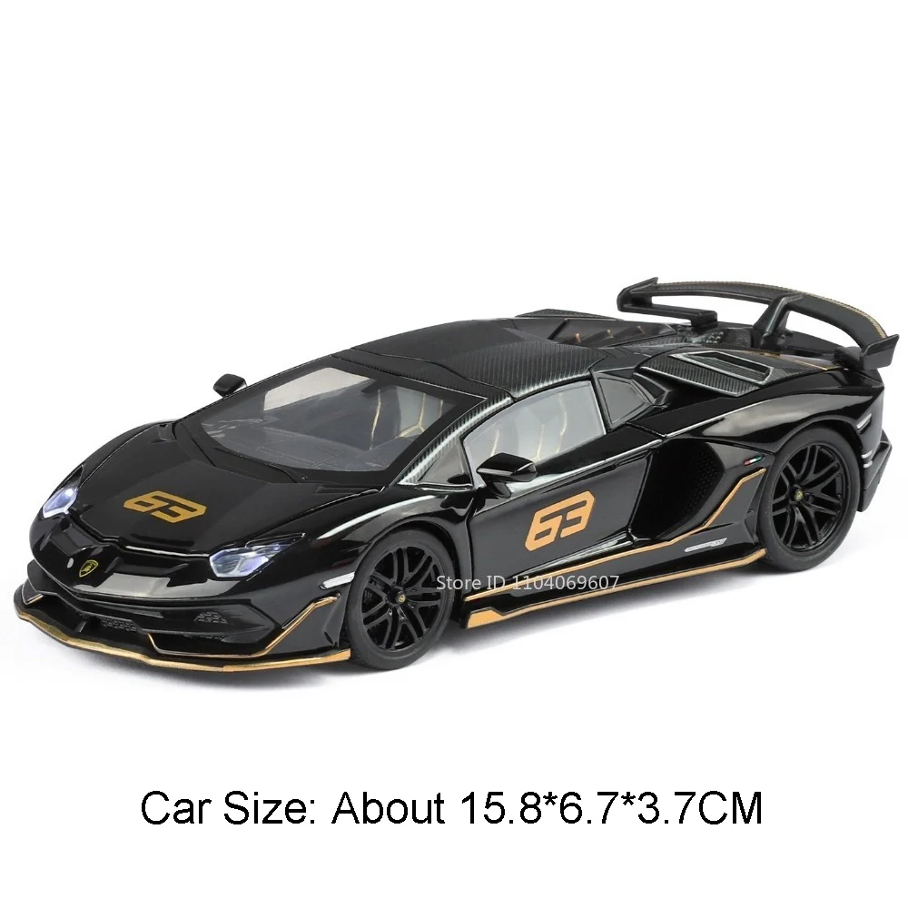 Experience the thrill of high-performance sports cars with this 1:32 scale diecast model collection, featuring the SVJ63 and LP500S. The models showcase a metal body, plastic chassis, and rubber tires, with dimensions of approximately 15.8 x 6.7 x 3.7 cm for SVJ63 and 14 x 6.5 x 3.6 cm for LP500S. Available in vibrant colors like grey, black, blue, green, yellow, red, and white, these models include realistic doors, hood, and trunk that open, along with sound and light effects triggered at the push of a button. The pull-back motor ensures autonomous movement, making these durable, high-simulation collectibles perfect for enthusiasts.