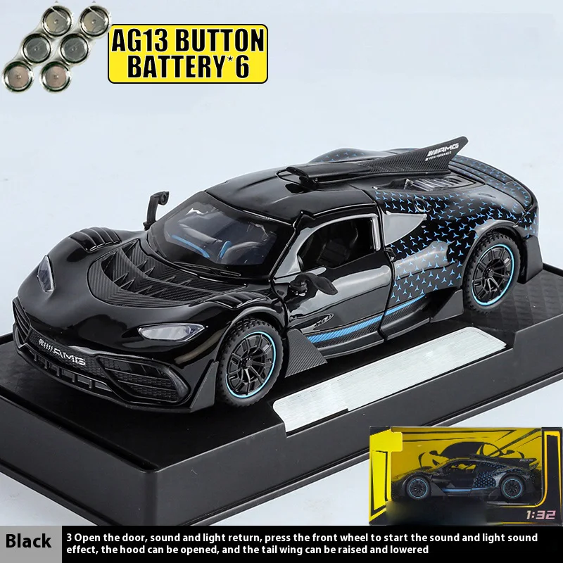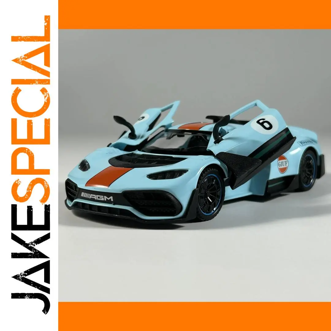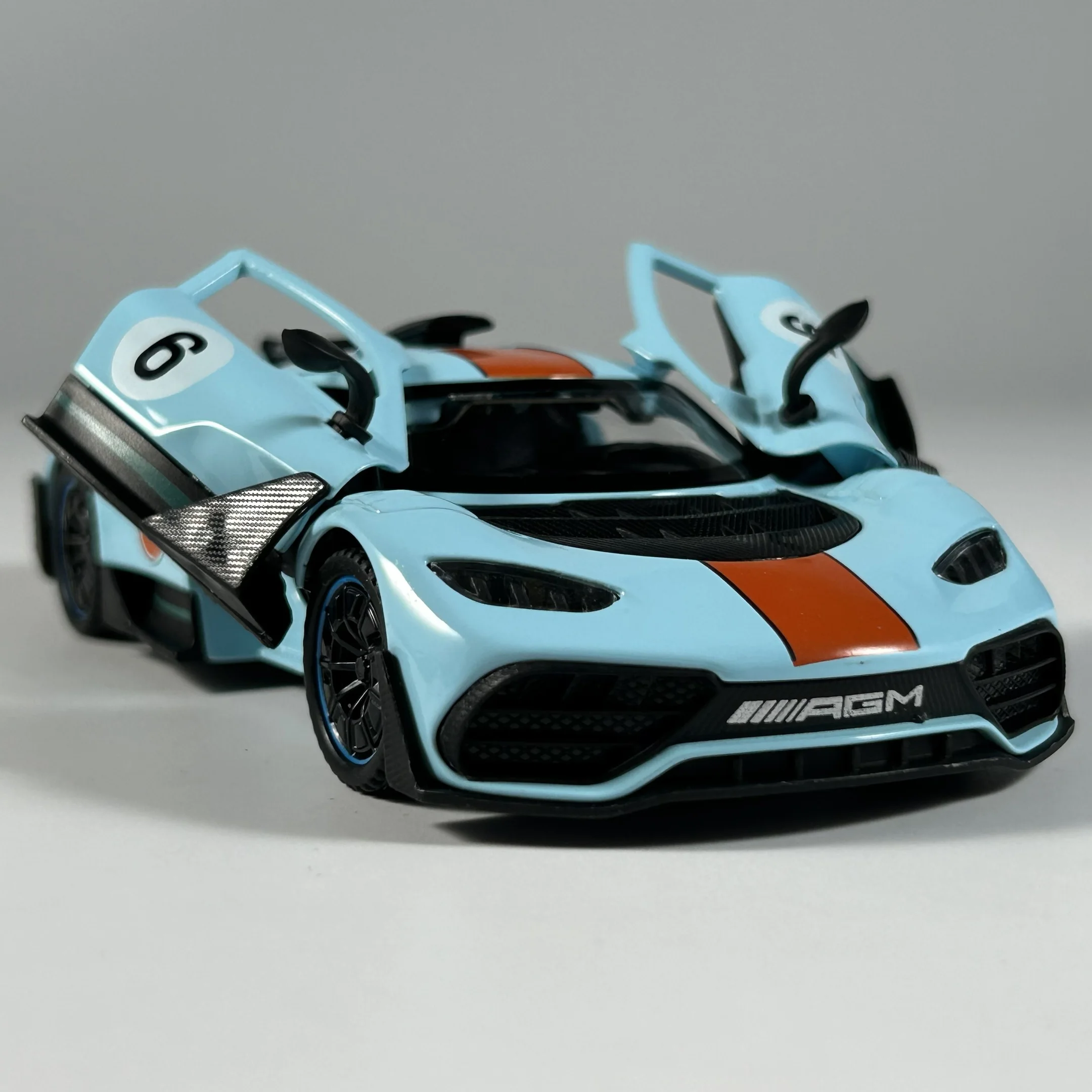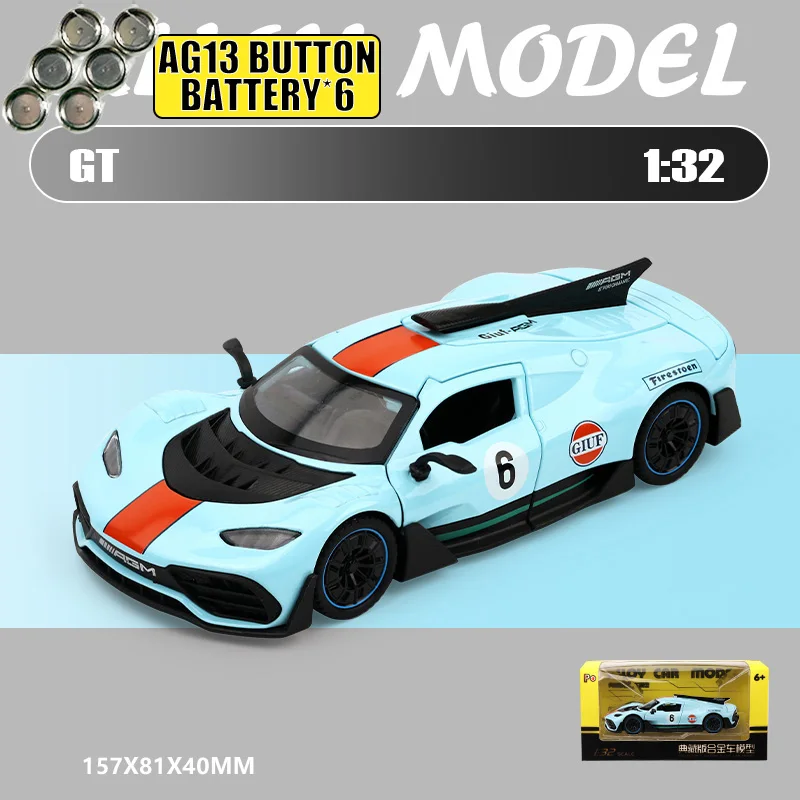 Immerse yourself in the world of high-performance racing with this highly detailed, miniature diecast model of a supercar. Crafted from alloy metal, this 1:32 scale replica captures the sleek and aerodynamic design of a real racing vehicle. Its striking light blue body features a bold orange stripe running from the front to the rear, enhancing its sporty appearance. Black accents on the grille, side mirrors, and wheel arches add contrast and depth, while textured tires mimic real slick racing tires. The gullwing or scissor-style doors are slightly open, revealing a meticulously detailed interior. With integrated sound and light functionalities, this model brings dynamic realism to your collection or display. Perfect for enthusiasts and collectors alike, it embodies speed, precision, and high-tech craftsmanship.