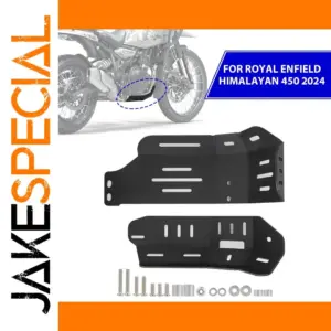 Enhance your Royal Enfield Himalayan 450 2024 with this durable black skid plate, crafted from 4mm thick laser-cut 5052-T6 aluminum with a black powder coating for maximum protection and style. Designed for easy installation with included instructions, this high-quality chassis and engine guard cover weighs approximately 1.35 kg and provides reliable defense against impact and debris during extreme enduro riding and trail adventures. Its sleek, rugged design features precise cutouts for ventilation, combining modern industrial style with functional toughness. Trust in this robust accessory to safeguard your bike’s frame and engine, ensuring peace of mind during demanding outdoor rides.