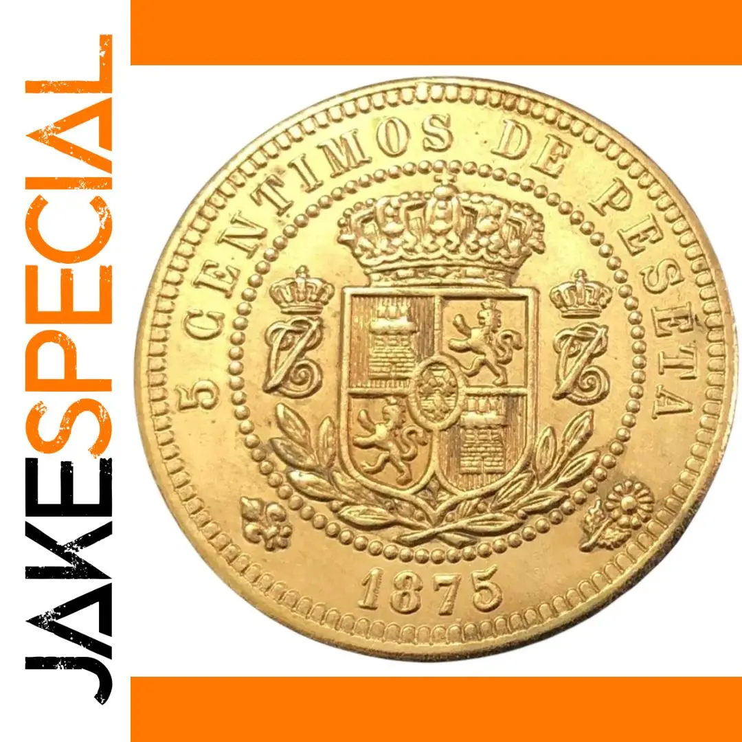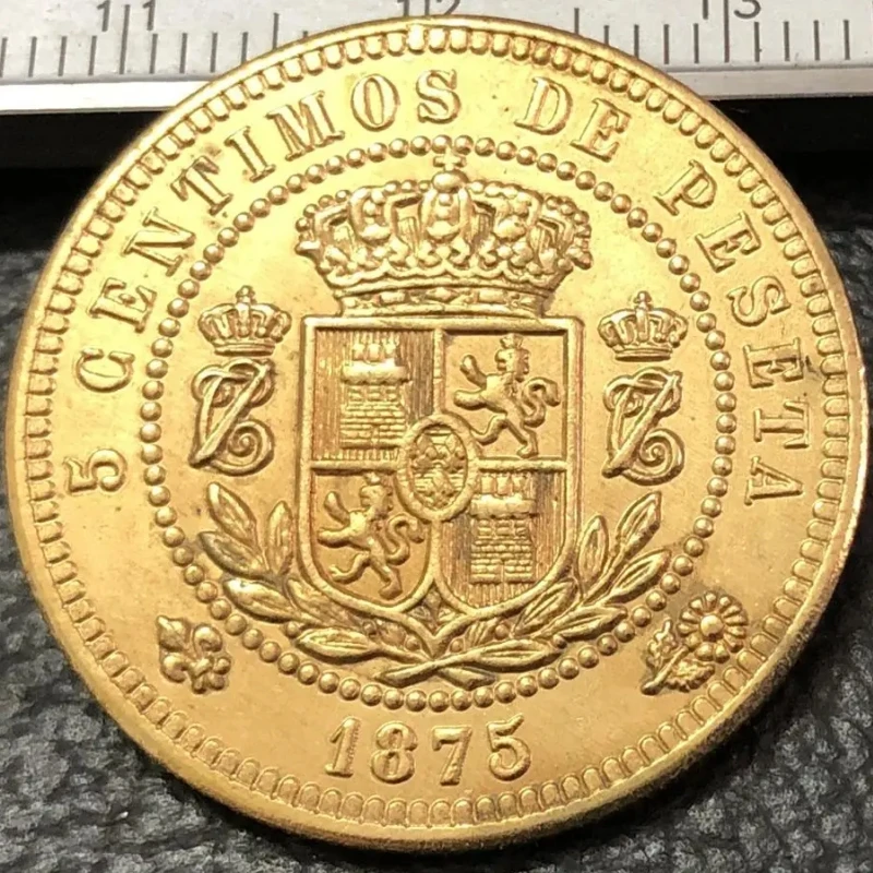 This high-quality replica coin, crafted using casting techniques from metal, dates between 1860 and 1879 and features an antique European style with a regal design depicting heraldic symbols, including a central shield topped with an ornate crown, inscribed with “5 CENTIMOS DE PESETAS” and the year “1875.” The coin’s polished surface boasts a shiny, aged metallic finish, highlighting intricate embossed details such as lions, castles, and decorative elements like a sprig of leaves and a rosette. As a carefully crafted imitation, this coin provides a vintage aesthetic and historical charm, perfect for collectors and enthusiasts seeking a detailed replica of a 19th-century European coin.