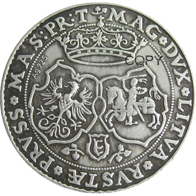 Step back in time with this exquisite replica of the Poland 1580 Litva TALAR, featuring the legendary Stephan Batory. Crafted with meticulous attention to detail, this vintage-style coin boasts a polished, reflective silver appearance that captures the essence of 16th-century European currency. The obverse side showcases a finely detailed profile portrait of Stephan Batory, adorned with a regal crown, elaborate armor, and a high ruffled collar, all rendered with ornate engravings. Surrounding the portrait are decorative motifs and inscriptions, including the word “COPY” to denote its reproduction status. The raised dotted border enhances its antique charm, while its overall design evokes a nostalgic sense of patriotism and craftsmanship from the era.