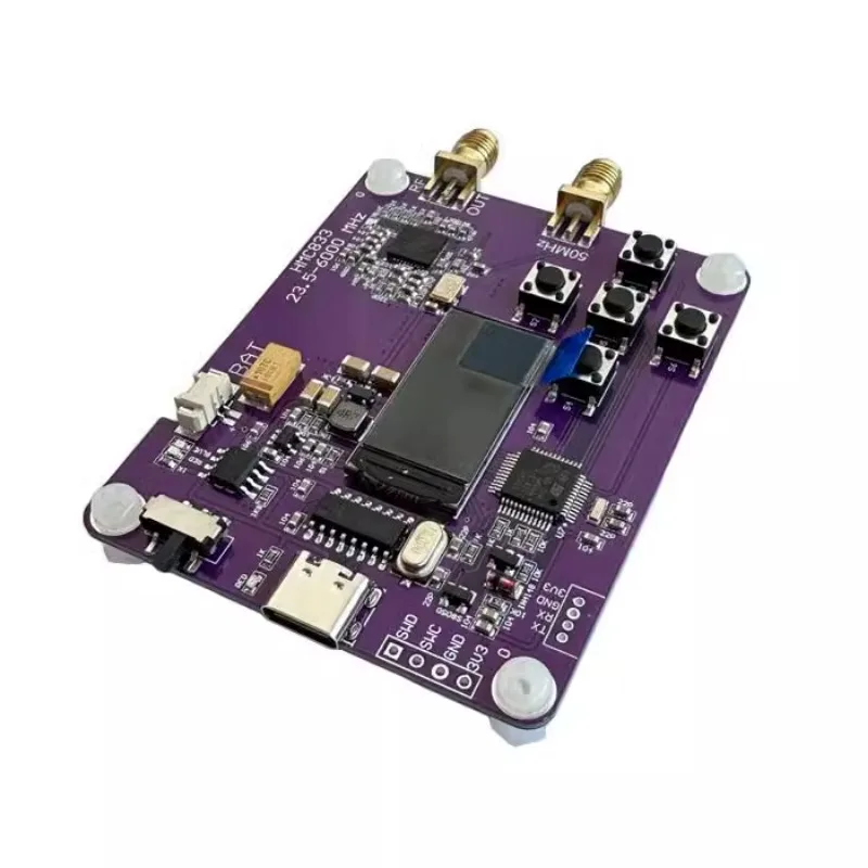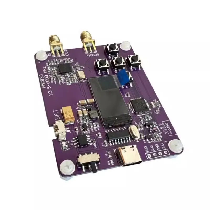 Experience precise control and reliable performance with this advanced 6GHz RF signal generator, model HMC833. Designed with a vibrant purple circuit board, it combines modern aesthetics with functional brilliance. The OLED display offers clear, intuitive navigation, making it easy to configure and monitor signal parameters. Four white rubber feet ensure stability during setup, while the gold-colored SMA connectors provide secure connections for RF output and 50MHz reference signals. The board features an array of surface-mounted resistors, capacitors, and integrated circuits, all meticulously arranged for optimal performance. Its compact design and thoughtfully placed control buttons make it a perfect choice for display equipment or audio and video applications. Trust in this robust device to enhance your technical projects.