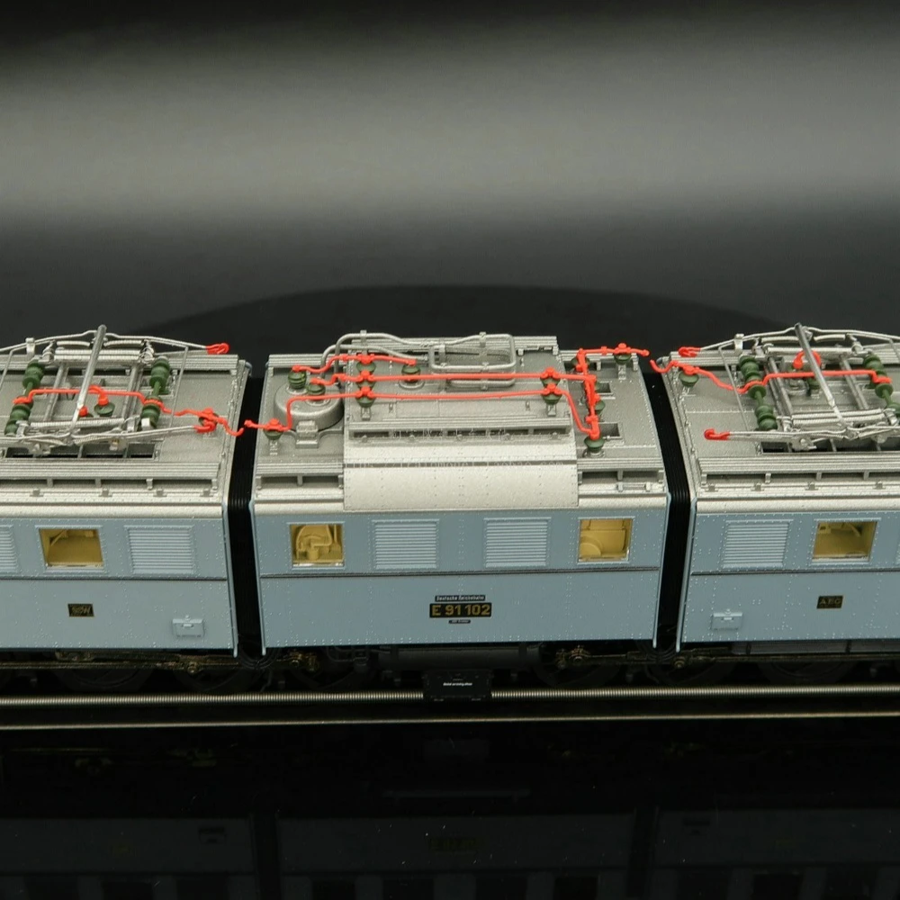 This highly detailed HO 1/87 scale electric locomotive model features a sleek silver finish with a three-section articulated design, and a mid-mounted motor drive system. Weighing 552 grams, it reaches a top speed of 68 km/h at 12V DC, offering enhanced performance over the prototype’s 55 km/h. Equipped with a PluX22 interface and LED lighting control, the model boasts intricately carved bodywork with rivets, air vents, folding pedals, independently mounted door handles, and meticulously detailed roof components including transformer, circuit breaker, cooling coils, insulators, inspection hatches, and a single-arm pantograph. Its robust bogie system provides excellent traction and outstanding realism, making it a perfect collector’s piece for railway enthusiasts.