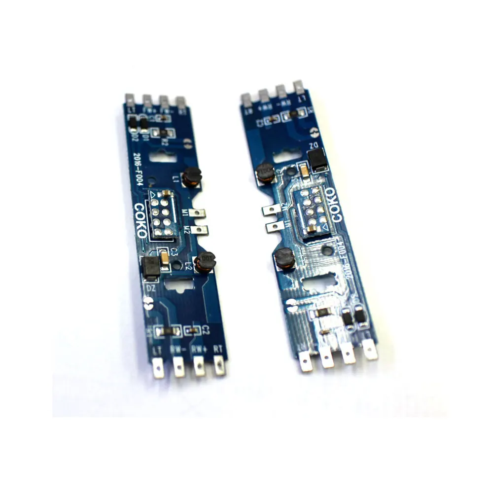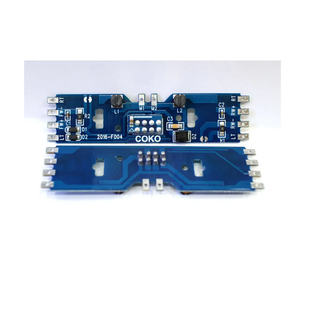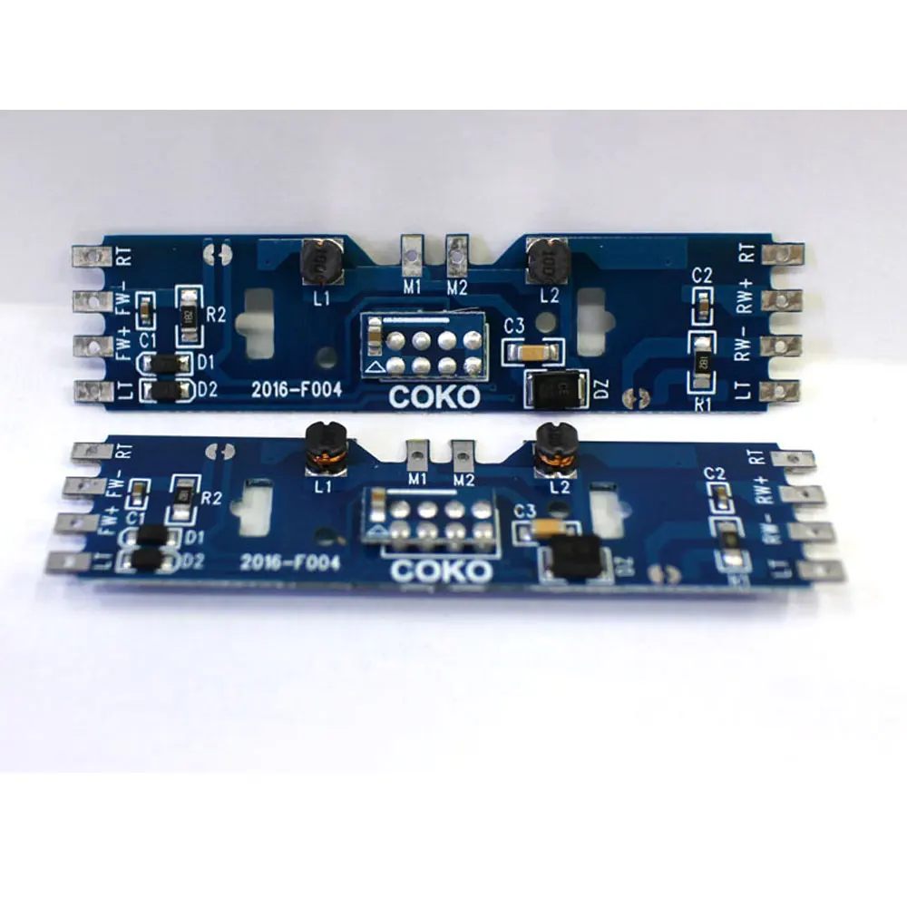 Take your model train experience to the next level with this precisely engineered HO scale electric train PCB. Measuring 72mm by 18mm, this navy blue circuit board is designed for seamless integration into 1:87 scale trains. Its sleek, minimalist layout features five surface-mount resistors, capacitors, inductors, diodes, and two black IC chips, all arranged for optimal functionality. The metallic solder pads labeled for power, direction, and accessories ensure reliable wiring. Crafted from durable metal, the PCB showcases a modern, professional appearance with a clean surface and labeled components. Perfect for custom modifications, it guarantees high-performance electrical control, adding realism and reliability to your model railway setup.
